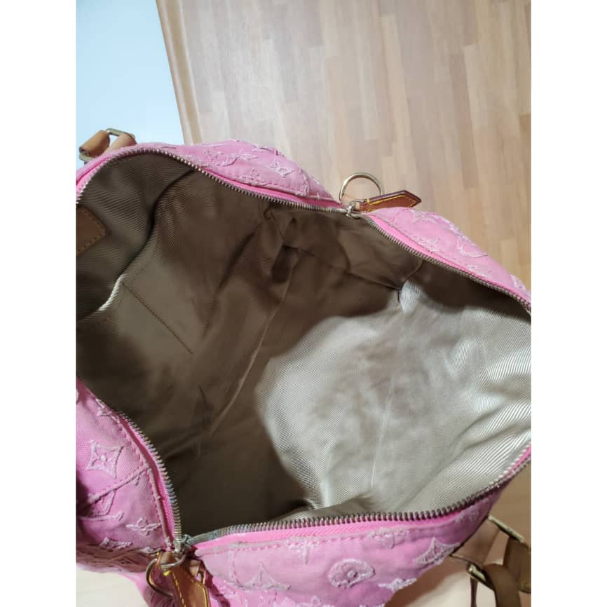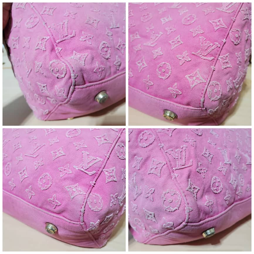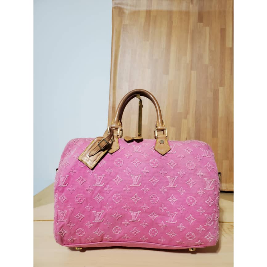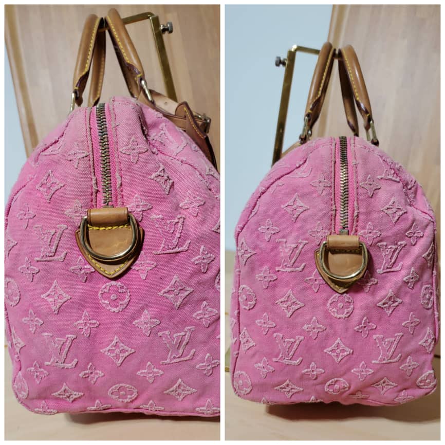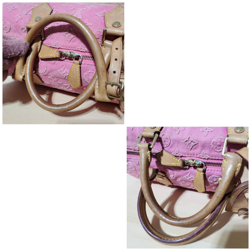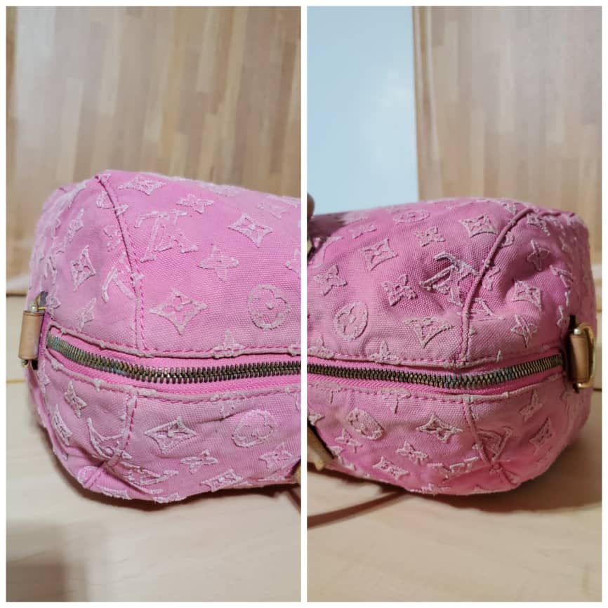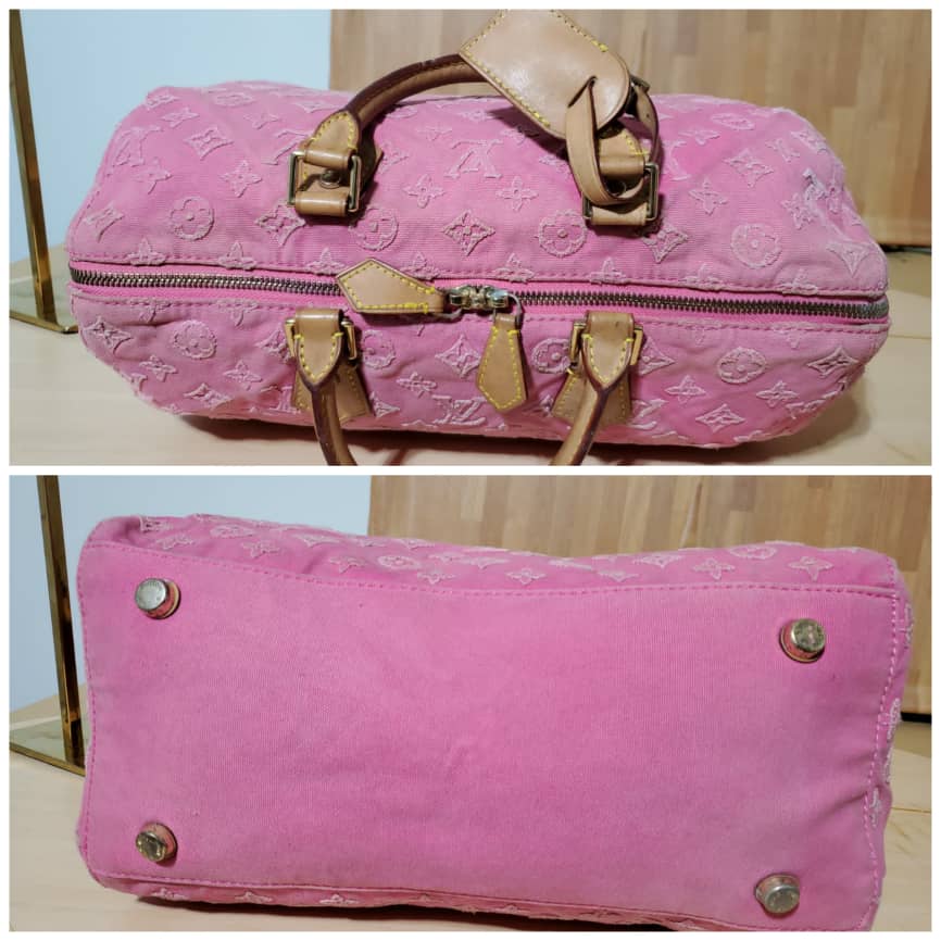 This authentic Louis Vuitton Denim Monogram Stone Speedy Bandouliere 35 Rose is in it’s pre-owned good condition. The exterior canvas is clean and interior is clean. No long strap. Vachatte leather Handles shows patina rubbing.