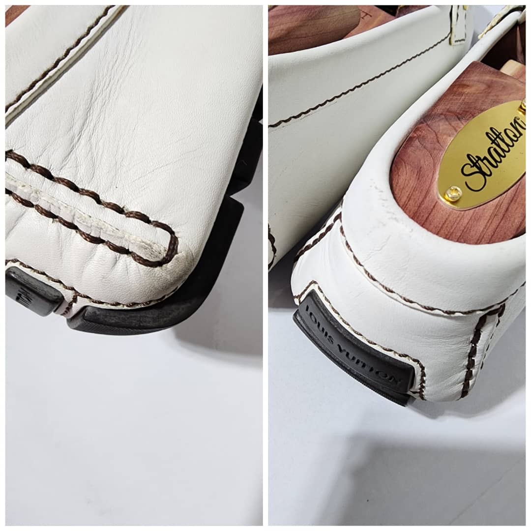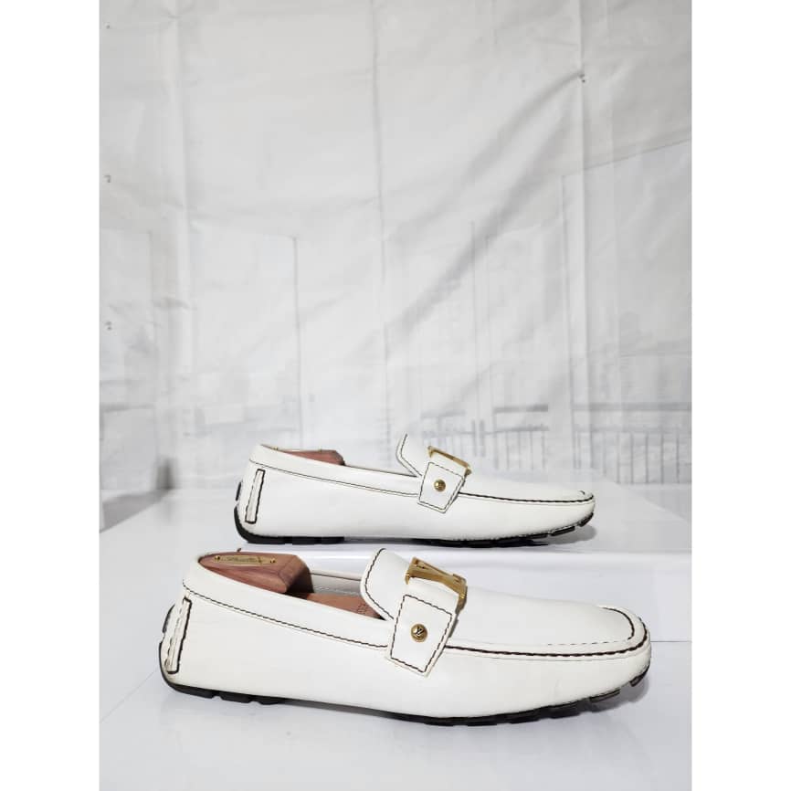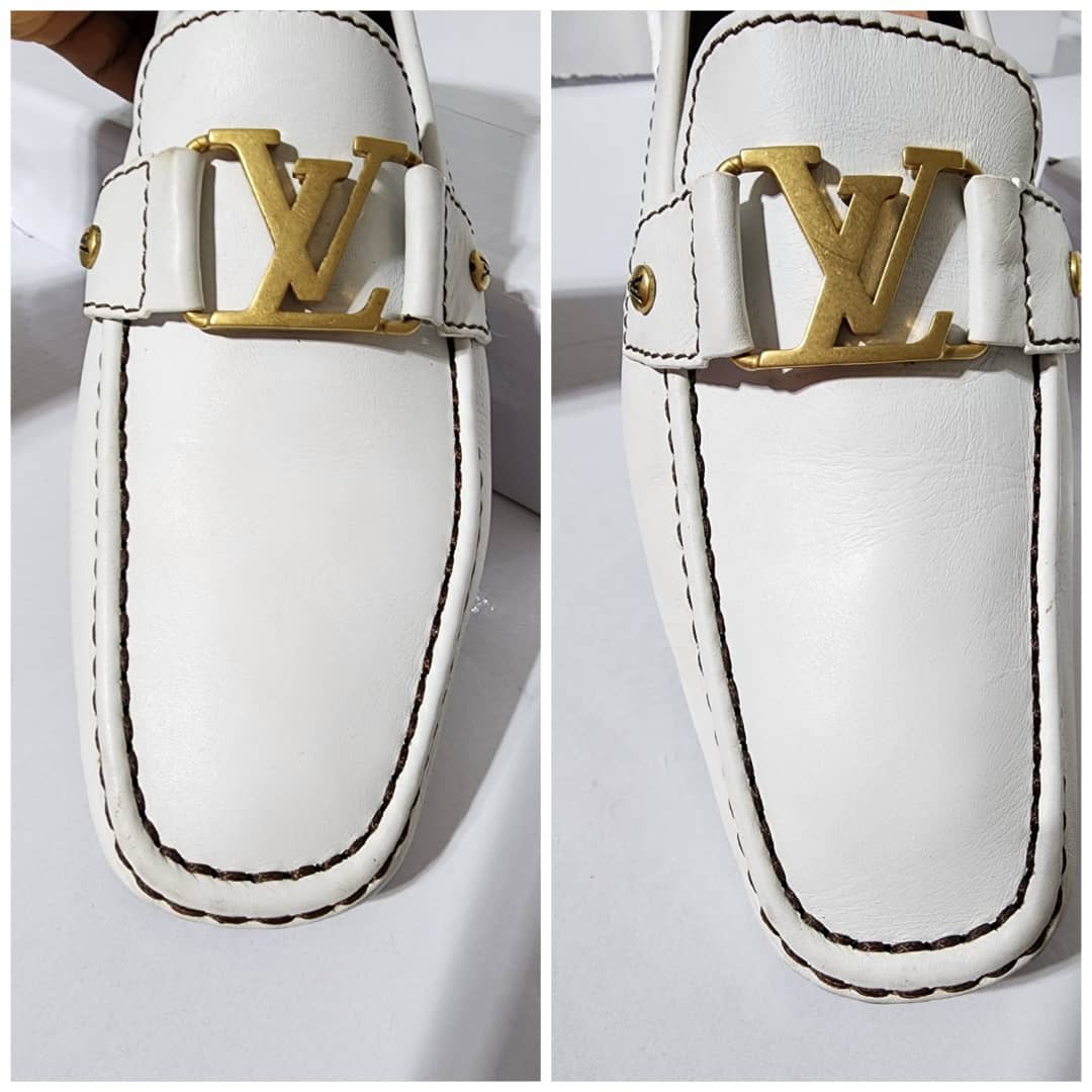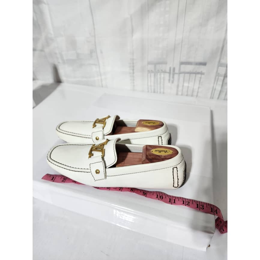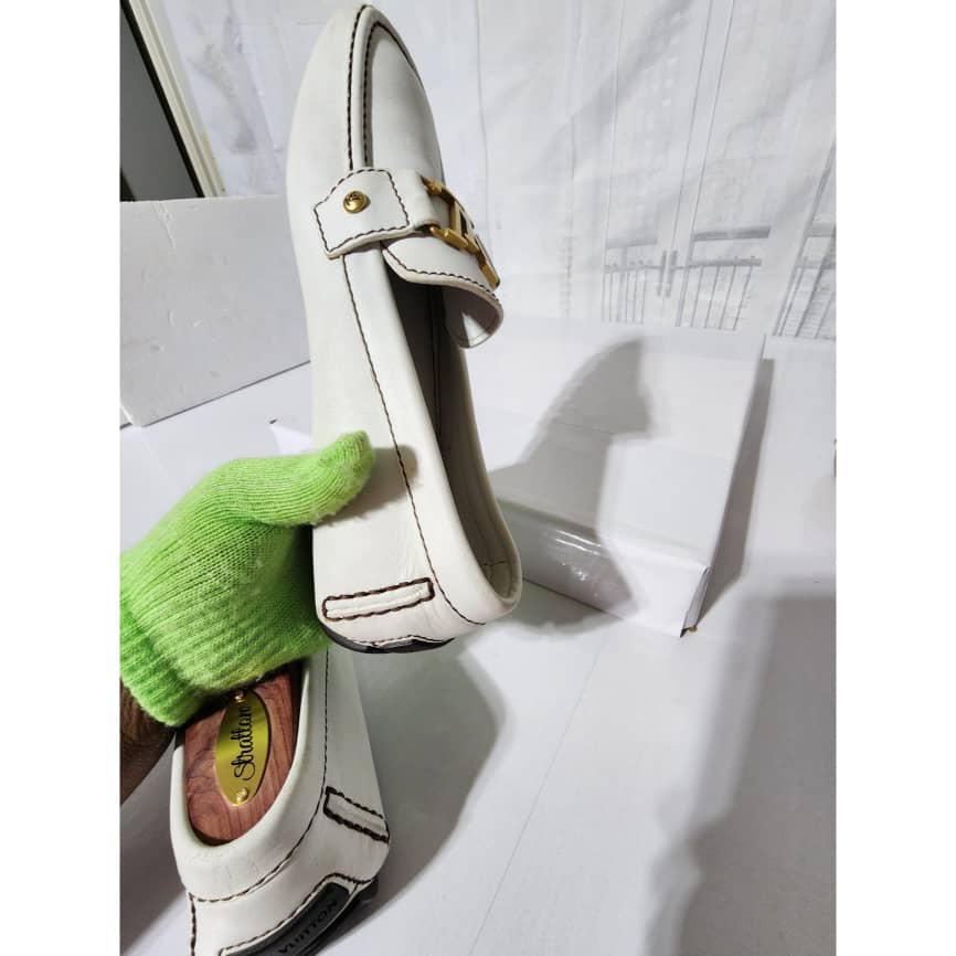 This authentic Louis Vuitton Leather Upper Moccasin Loafer White Size 8.5 is in it’s good pre-owned condition. The exterior is clean and beautiful. There are some scratches to the base corners, a little stain towards the sole of the shoe. Interior is clean and beautiful. Gold hardware has little rubbing to it. Kindly look at pictures above