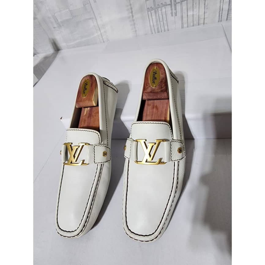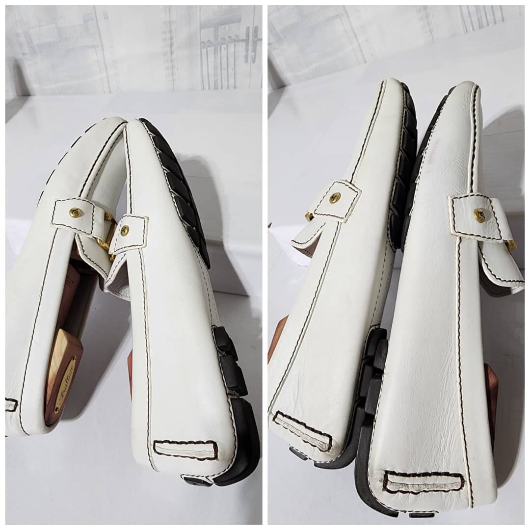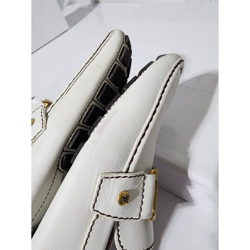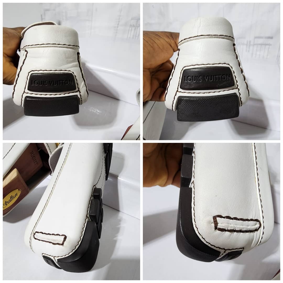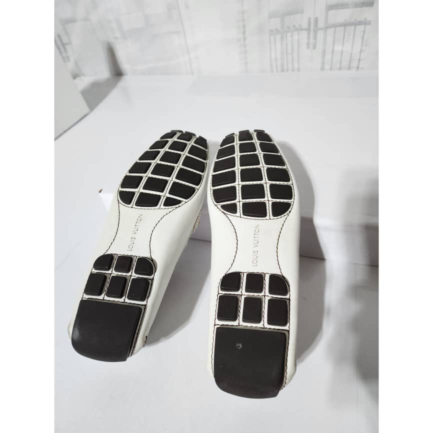 This authentic Louis Vuitton Leather Upper Moccasin Loafer White Size 8.5 is in it’s good pre-owned condition. The exterior is clean and beautiful. There are some scratches to the base corners, a little stain towards the sole of the shoe. Interior is clean and beautiful. Gold hardware has little rubbing to it. Kindly look at pictures above