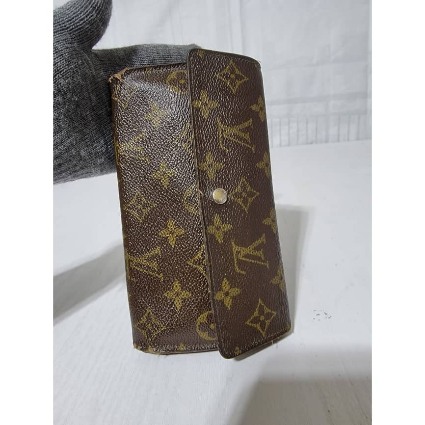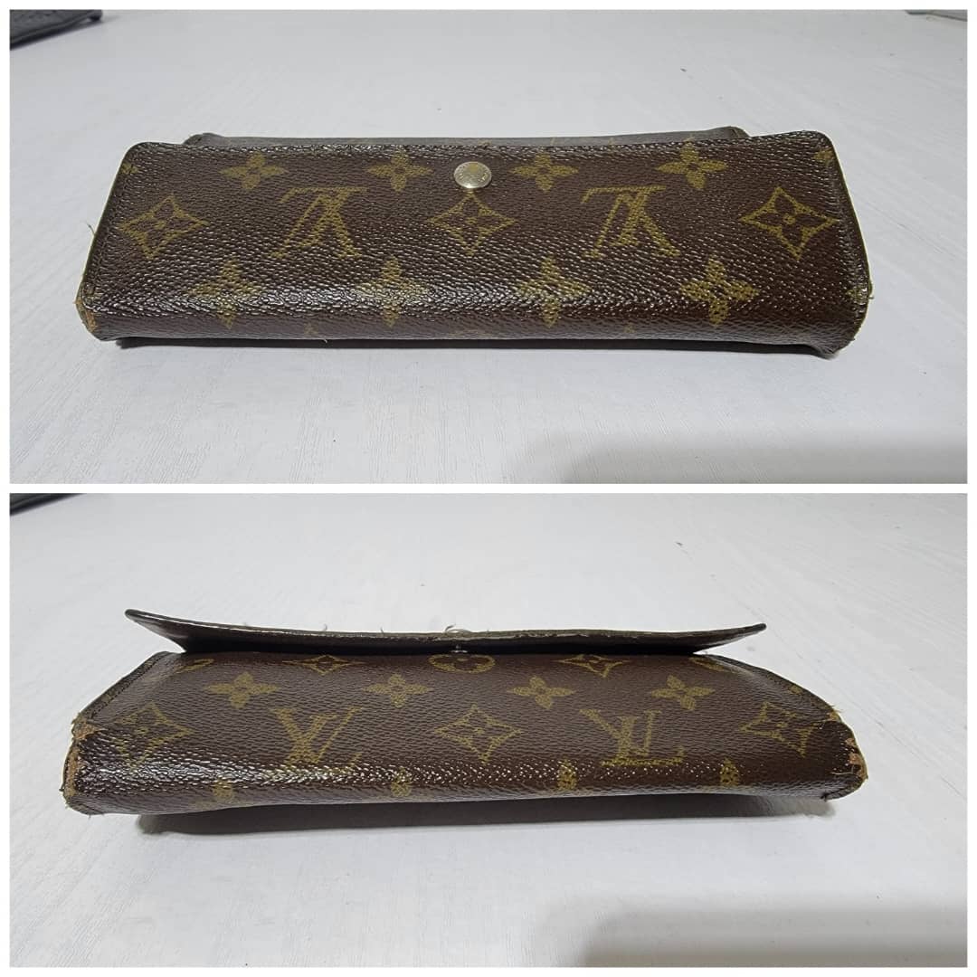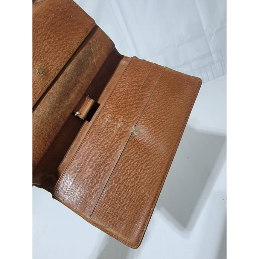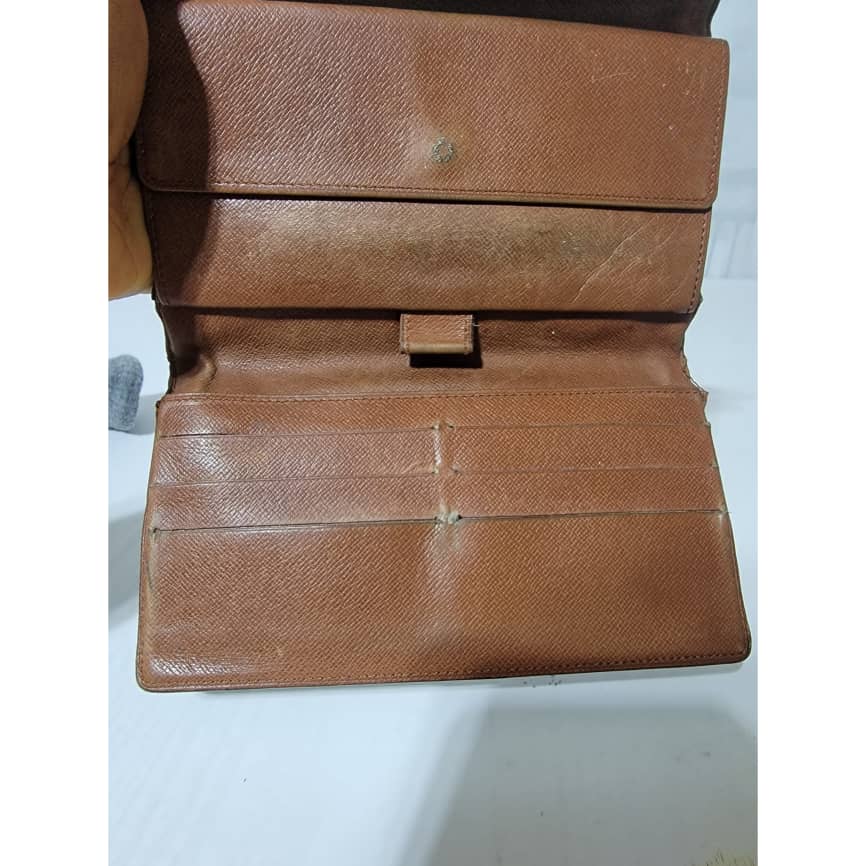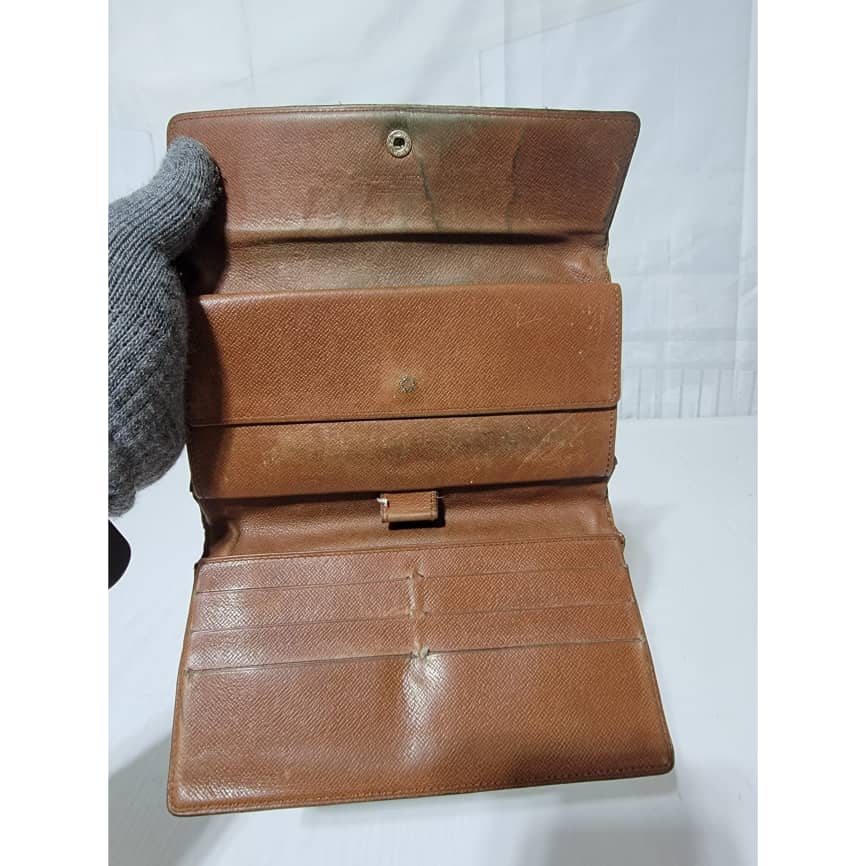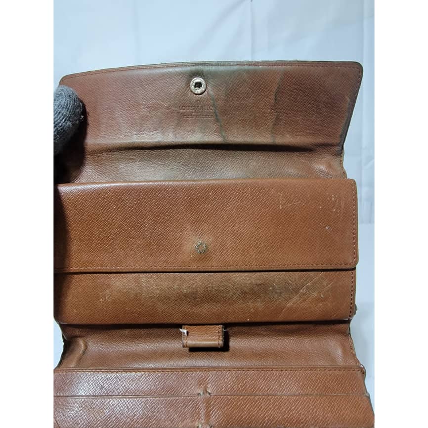 This authentic Louis Vuitton Long Monogram Sarah Porte Tresor Pochette Monnaie Credit Wallet Brown is in it’s pre-owned condition. The exterior coated canvas is clean however, it shows sign of use. The base edges is worn out, there is scratch and scuffing to the edges of this wallet (Kindly look at pictures above). The interior is not clean, it is really worn out. The snap closure of this wallet is not so functional. Kindly look at pictures and understand that this wallet is not so in a good condition.