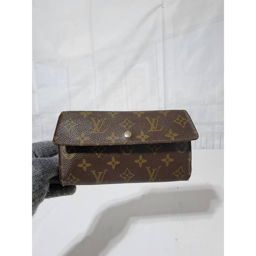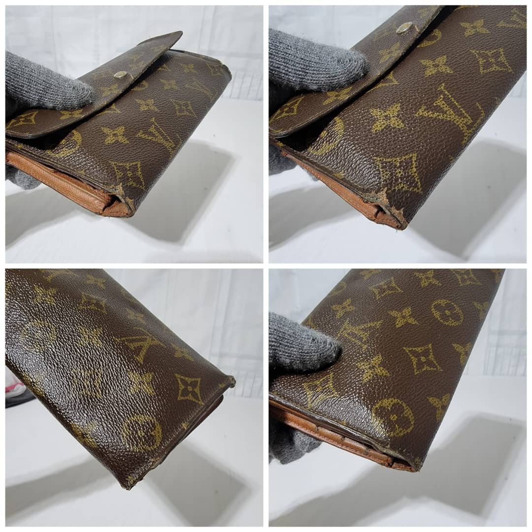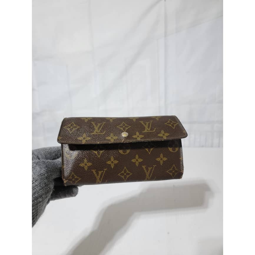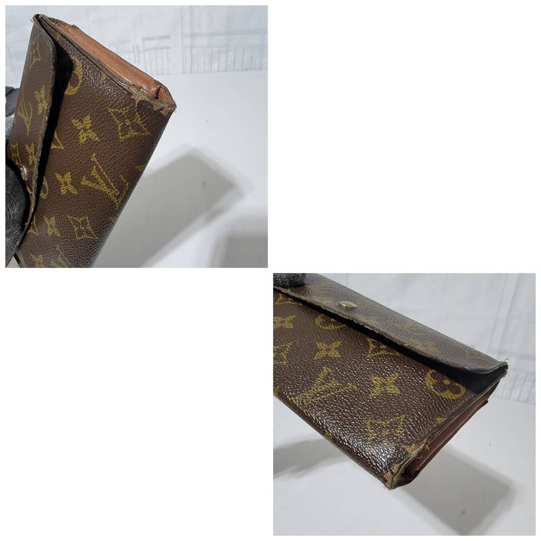 This authentic Louis Vuitton Long Monogram Sarah Porte Tresor Pochette Monnaie Credit Wallet Brown is in it’s pre-owned condition. The exterior coated canvas is clean however, it shows sign of use. The base edges is worn out, there is scratch and scuffing to the edges of this wallet (Kindly look at pictures above). The interior is not clean, it is really worn out. The snap closure of this wallet is not so functional. Kindly look at pictures and understand that this wallet is not so in a good condition.