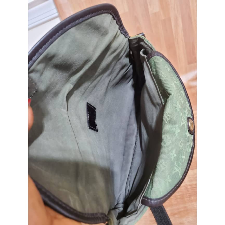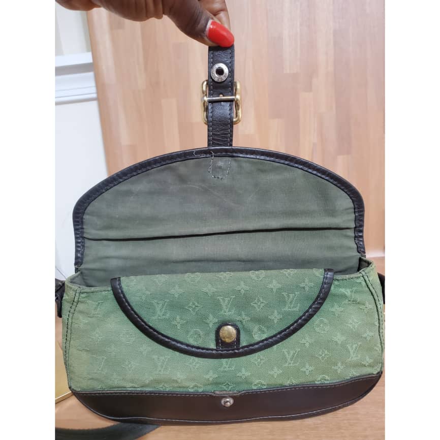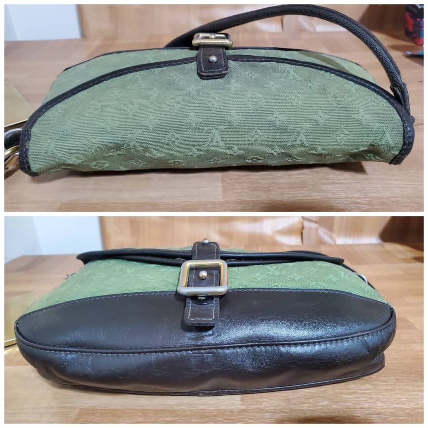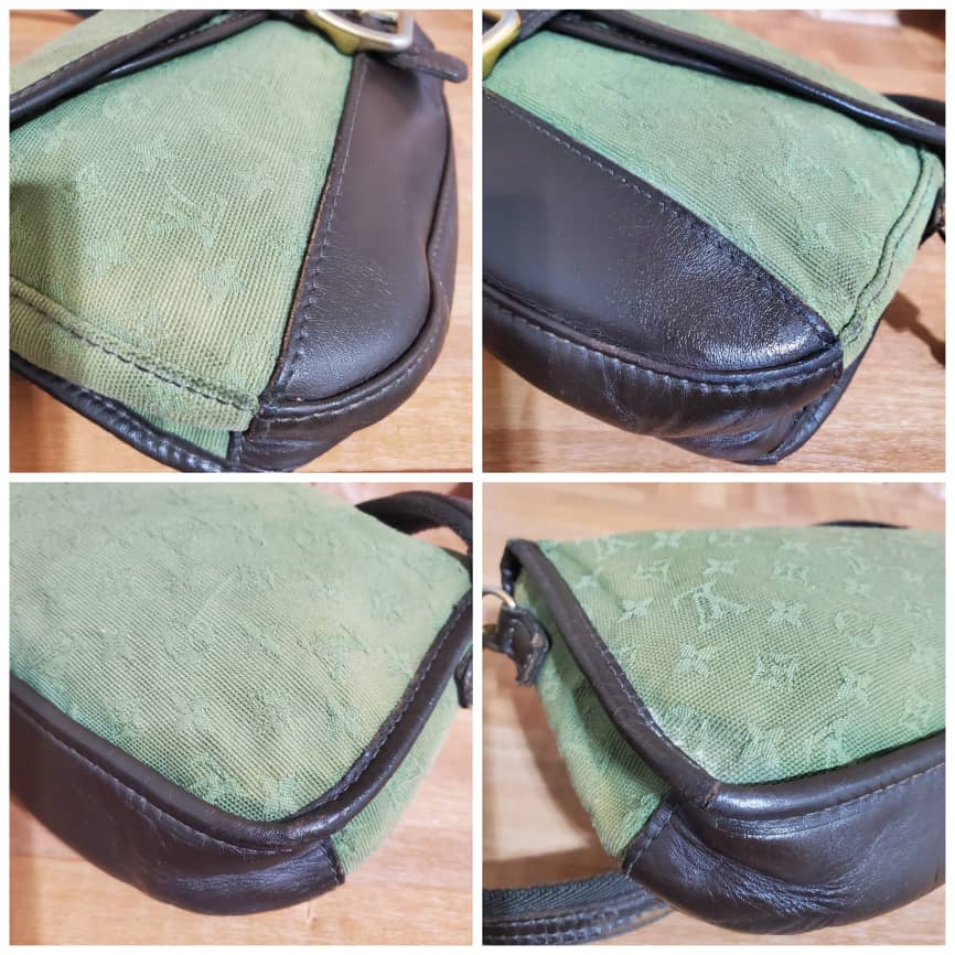 This authentic Louis Vuitton Marjorie Monogram Mini Lin Khaki Green Canvas Shoulder Bag is in it’s pre-owned condition.has sign of use. The exterior canvas is clean and slightly faded. Interior is clean. And light cracks on the corners leather trim