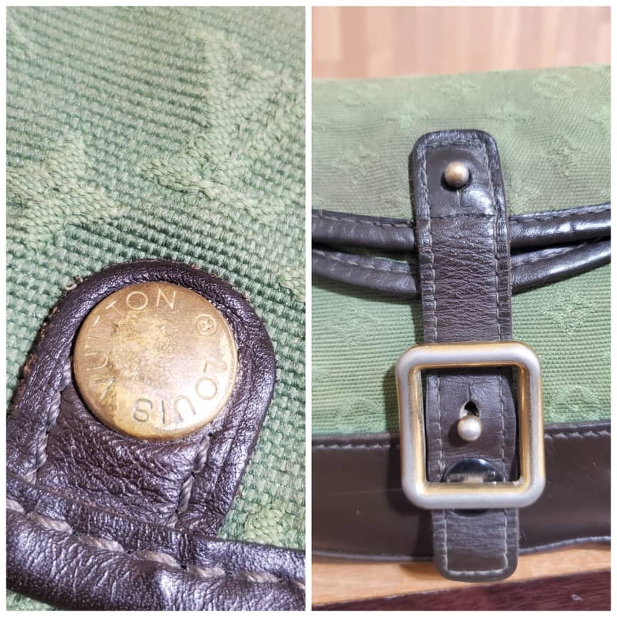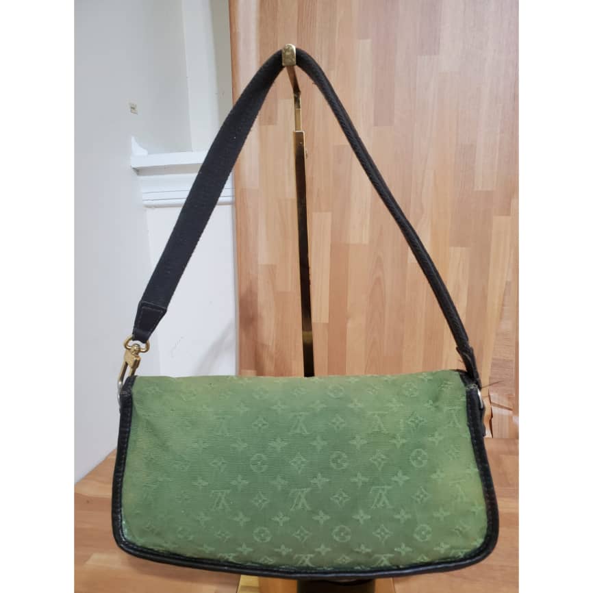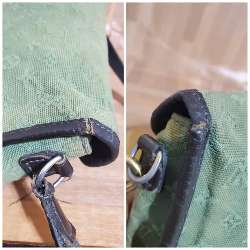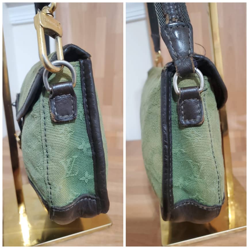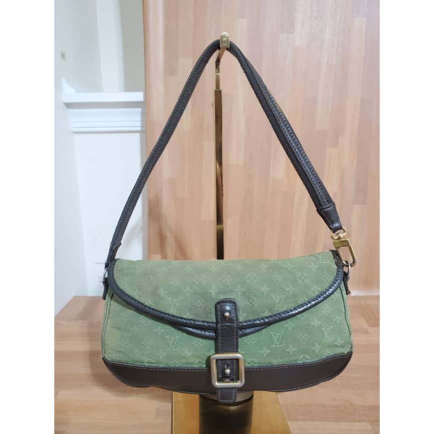 This authentic Louis Vuitton Marjorie Monogram Mini Lin Khaki Green Canvas Shoulder Bag is in it’s pre-owned condition.has sign of use. The exterior canvas is clean and slightly faded. Interior is clean. And light cracks on the corners leather trim