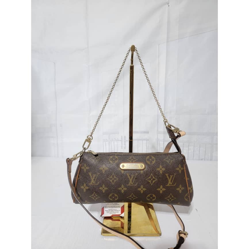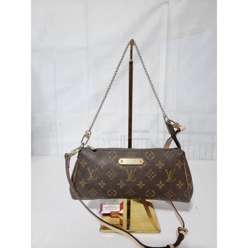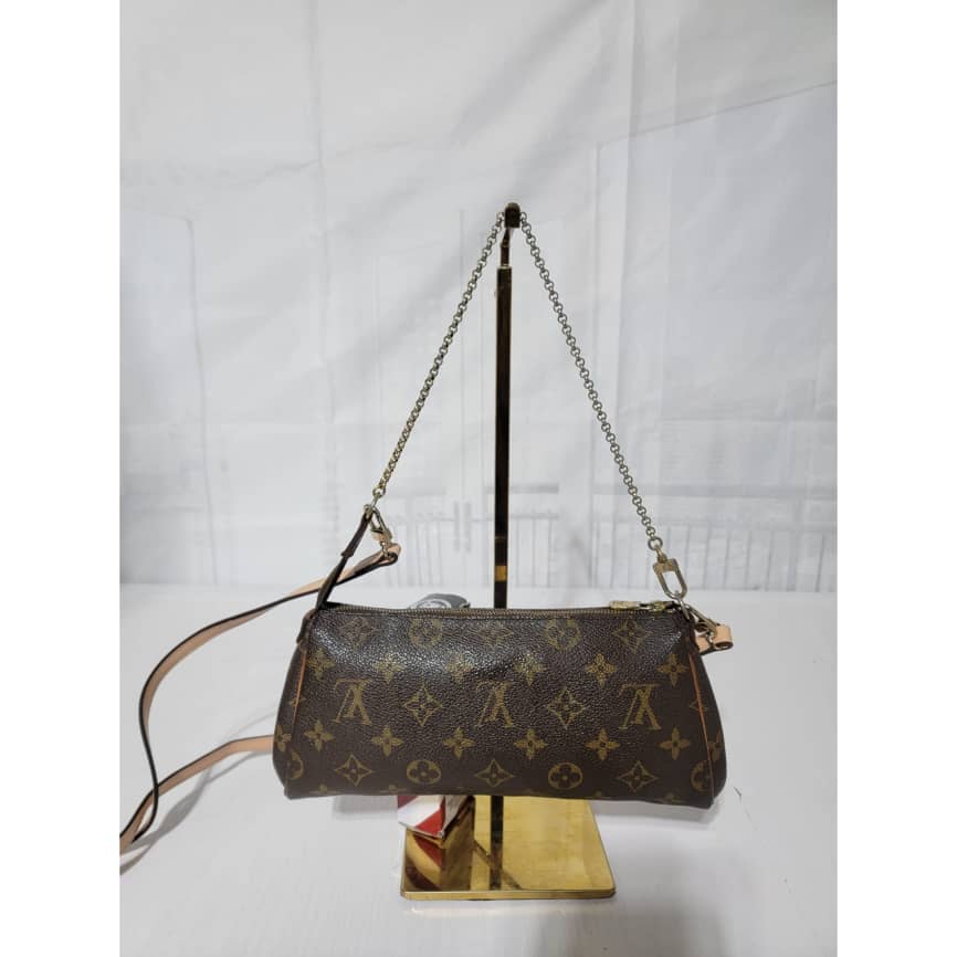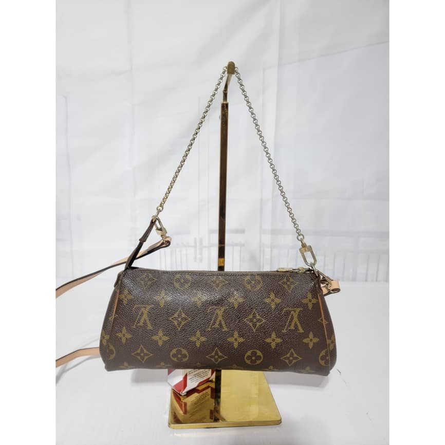 This authentic Louis Vuitton Monogram Canvas Eva Pochette Bag Brown is in it’s pre-owned condition. The exterior coated canvas is clean. The vachatte leather that runs by the side trim of the bag and the side of the zipper pull shows honey wear patina and some scratches to it. The long leather strap is a generic strap (Kindly look at pictures above). Hardware shows sign of rubbing scratch.