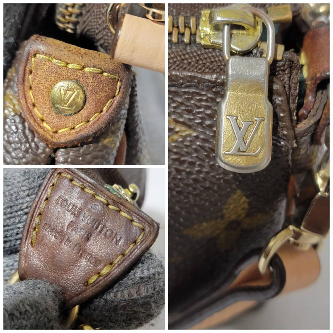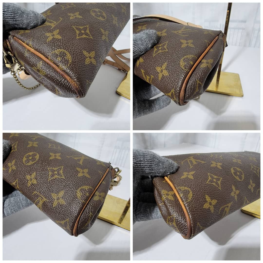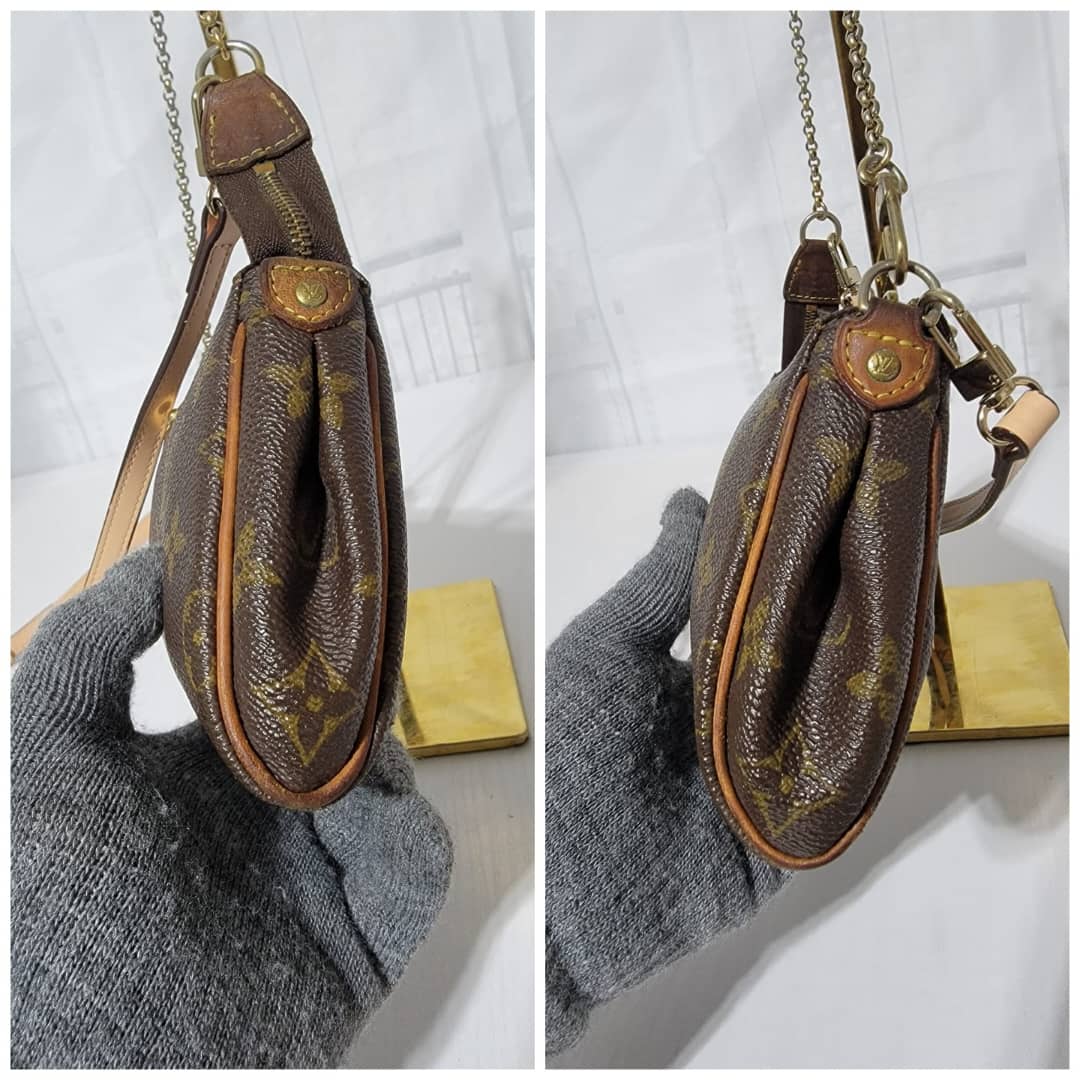 This authentic Louis Vuitton Monogram Canvas Eva Pochette Bag Brown is in it’s pre-owned condition. The exterior coated canvas is clean. The vachatte leather that runs by the side trim of the bag and the side of the zipper pull shows honey wear patina and some scratches to it. The long leather strap is a generic strap (Kindly look at pictures above). Hardware shows sign of rubbing scratch.