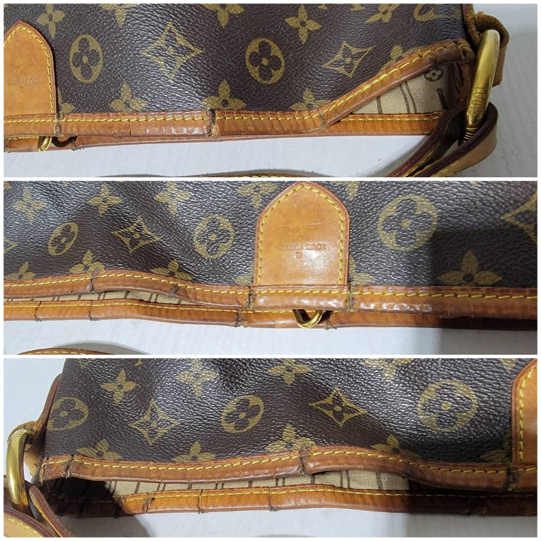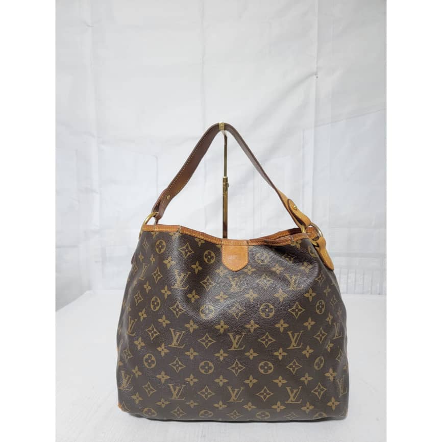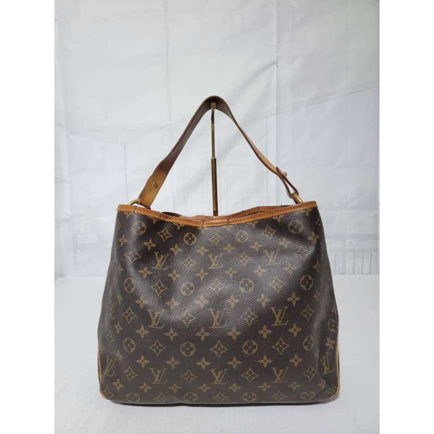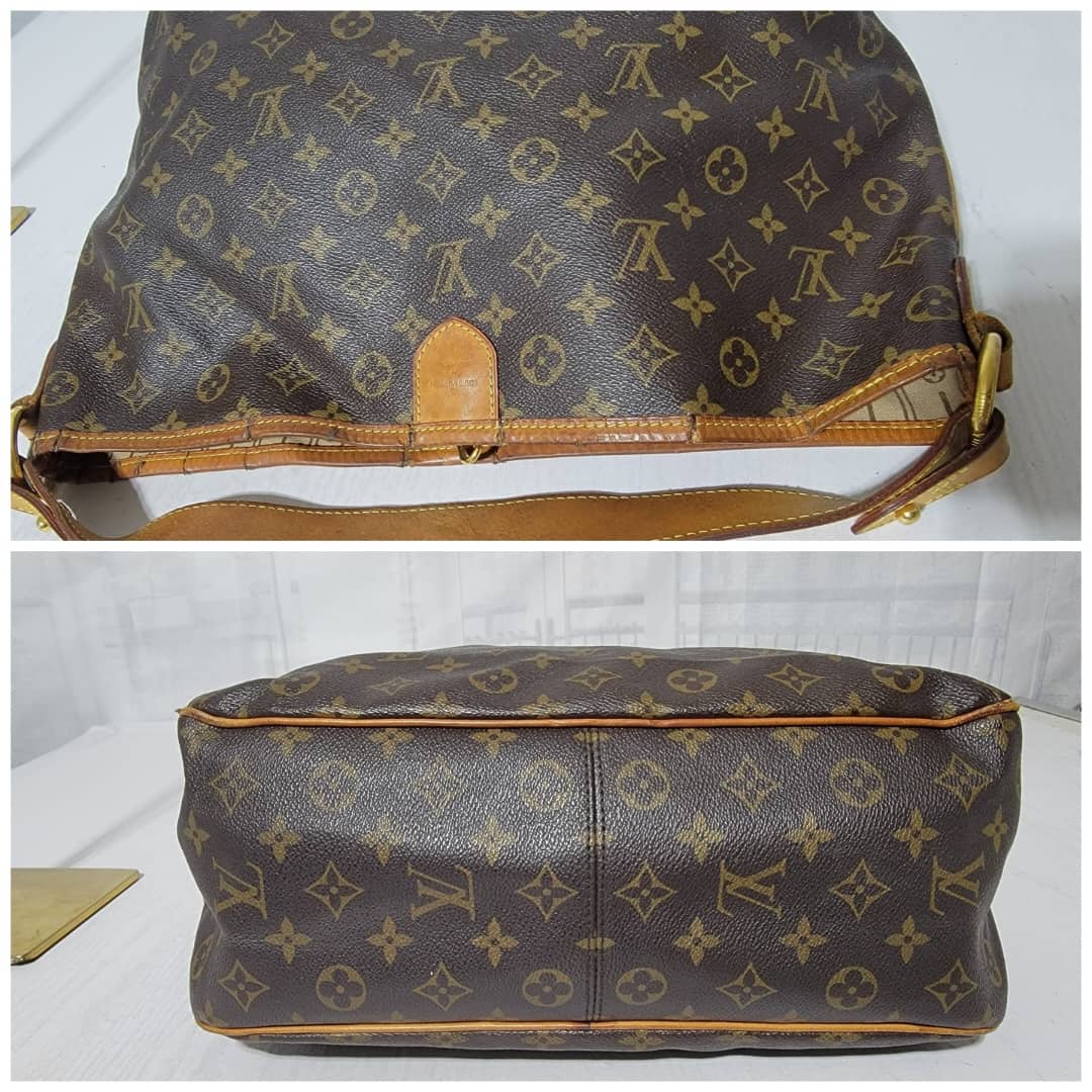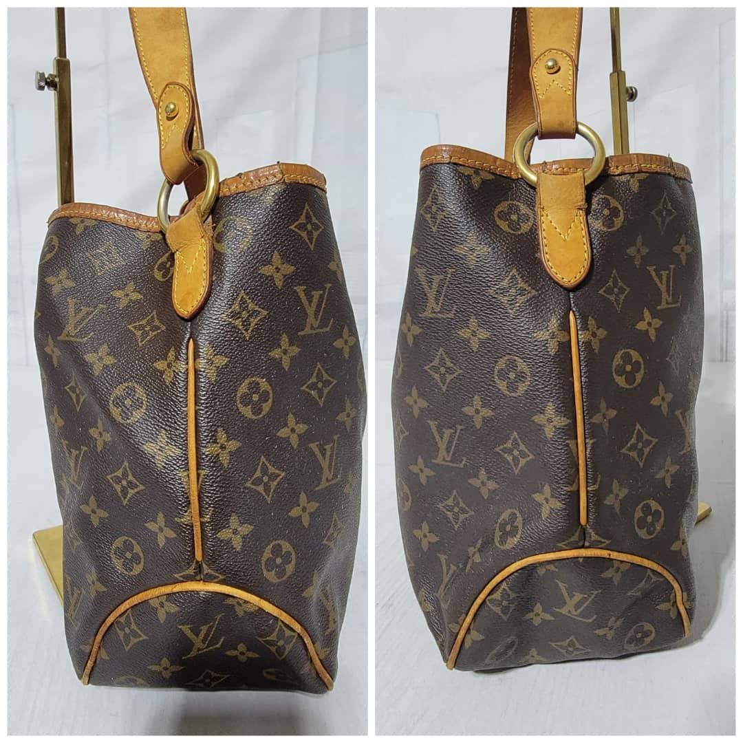 This authentic Louis Vuitton Monogram Delightful Bag is in it’s good pre-owned condition. The exterior coated canvas is clean and beautiful. The leather trim that runs across the bag and the handle shows patina wear which has gone dark honey brown. The top trim leather show cracks around it.