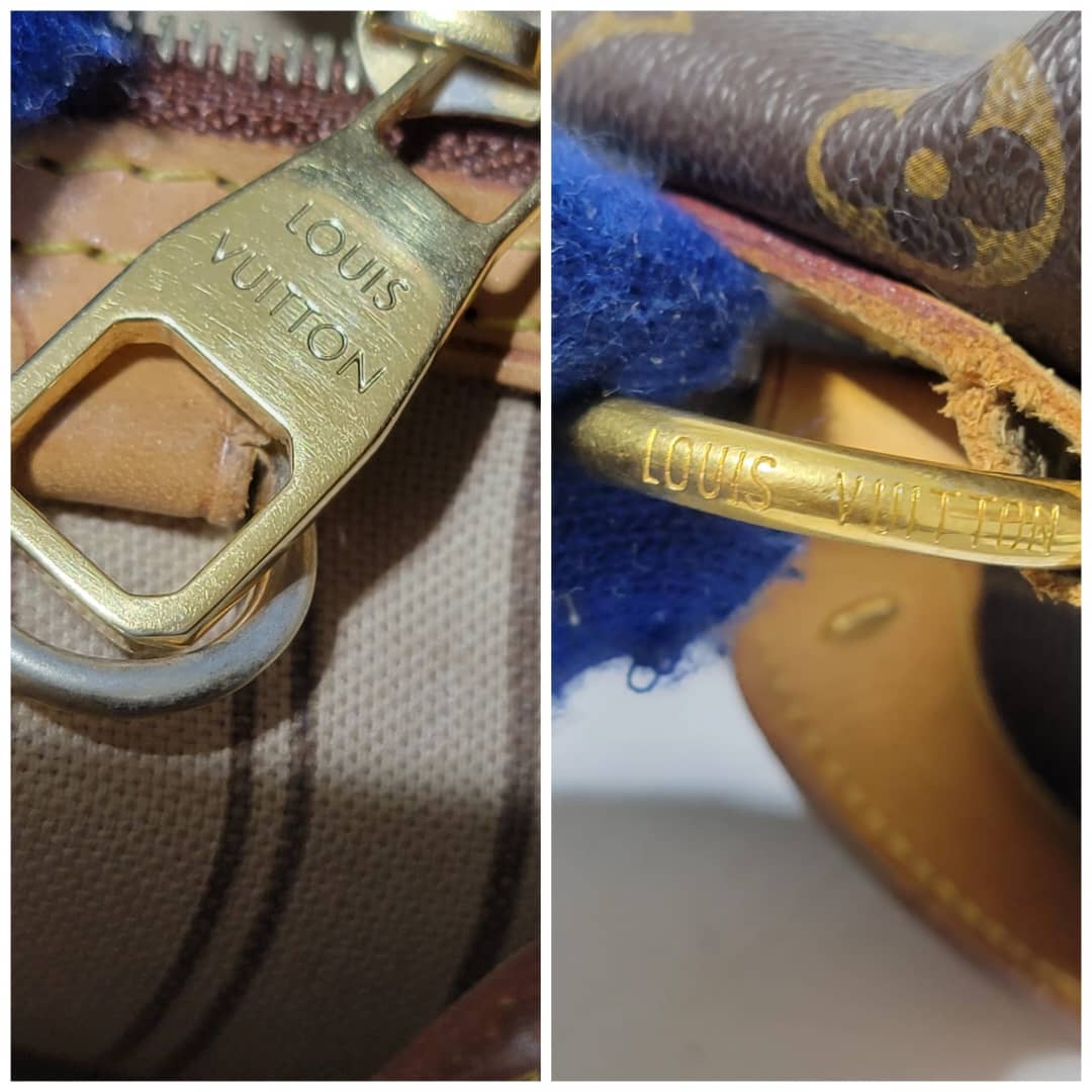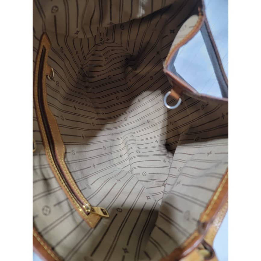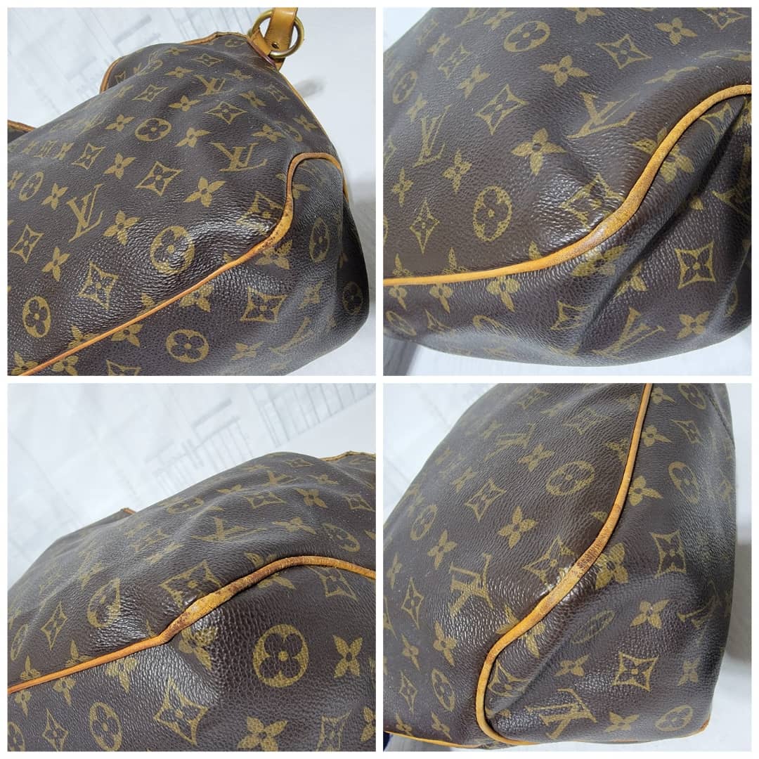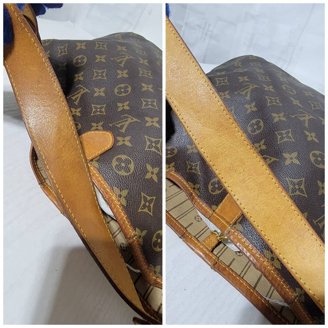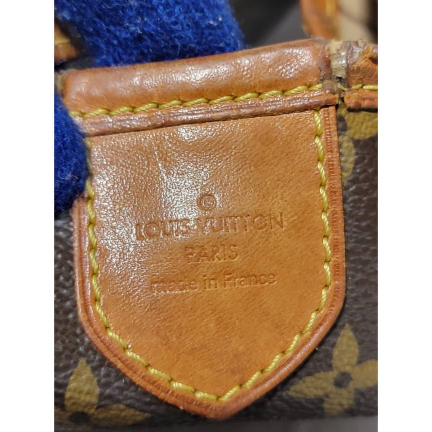This authentic Louis Vuitton Monogram Delightful Bag is in it’s good pre-owned condition. The exterior coated canvas is clean and beautiful. The leather trim that runs across the bag and the handle shows patina wear which has gone dark honey brown. The top trim leather show cracks around it.