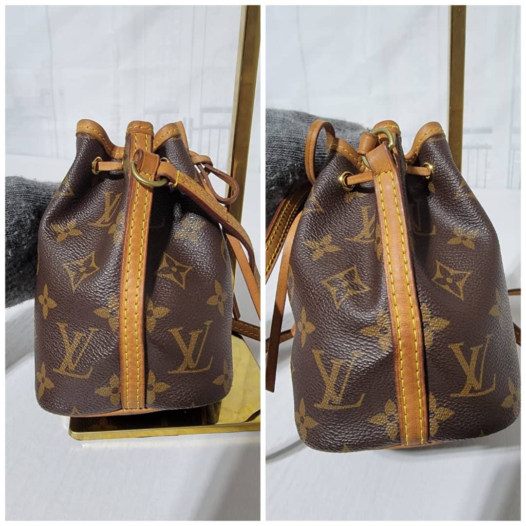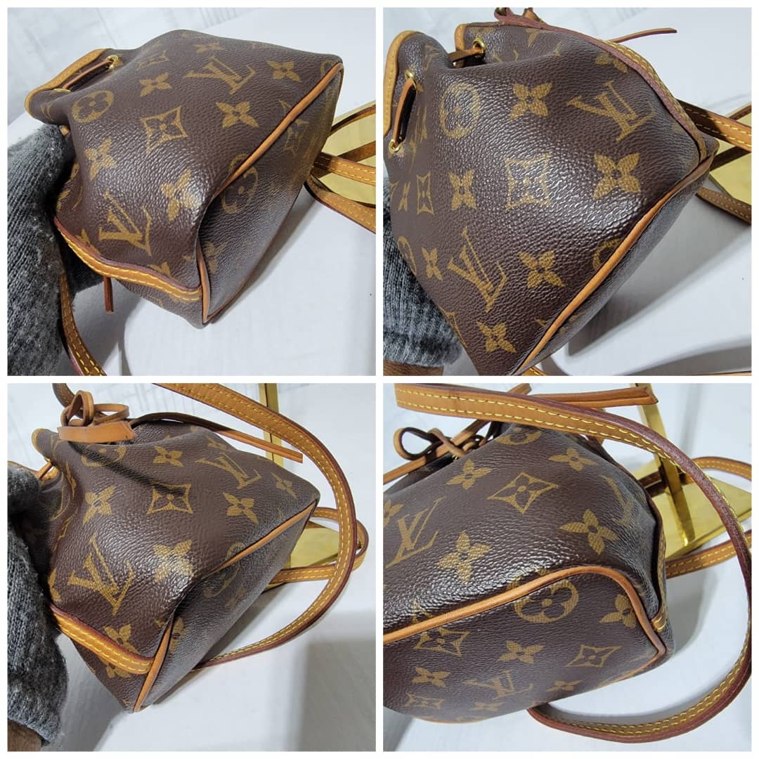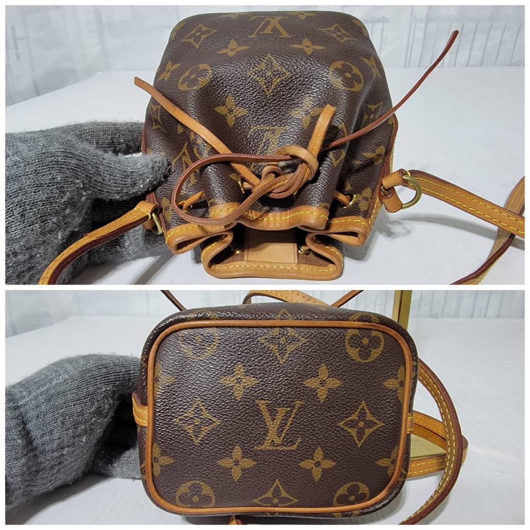This authentic Louis Vuitton Monogram Nano Noe Bucket Bag Brown is in it’s good pre-owned condition. The exterior is clean and beautiful. Interior is clean. The vachatte leather that runs around the trim of the bag, the strap and drawstring shows light honey patina.