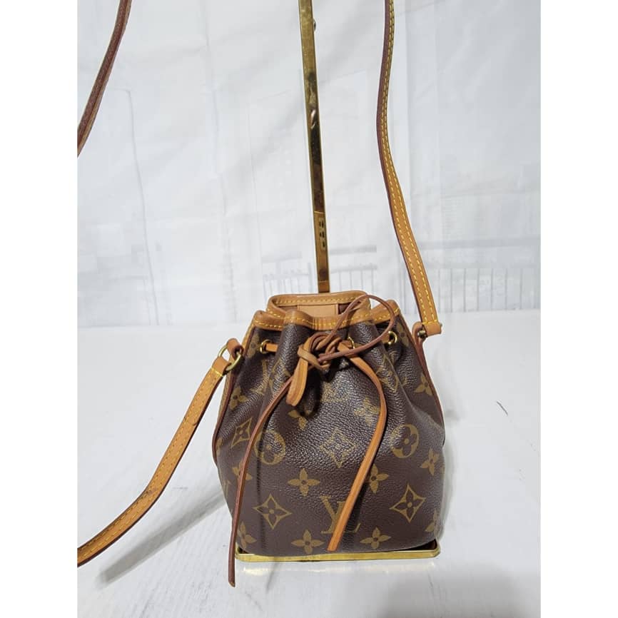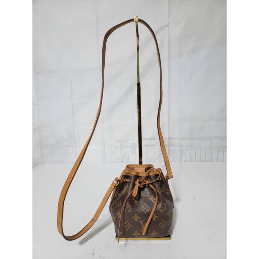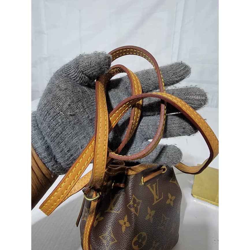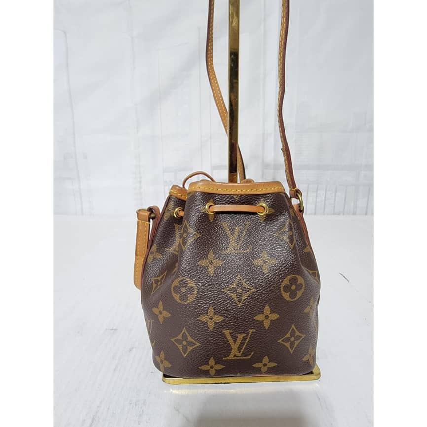 This authentic Louis Vuitton Monogram Nano Noe Bucket Bag Brown is in it’s good pre-owned condition. The exterior is clean and beautiful. Interior is clean. The vachatte leather that runs around the trim of the bag, the strap and drawstring shows light honey patina.