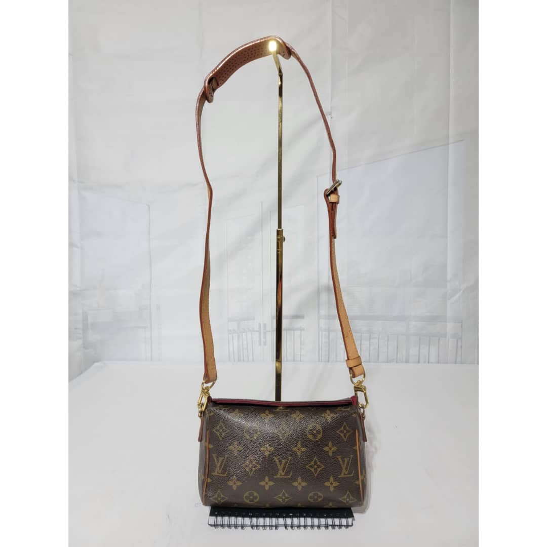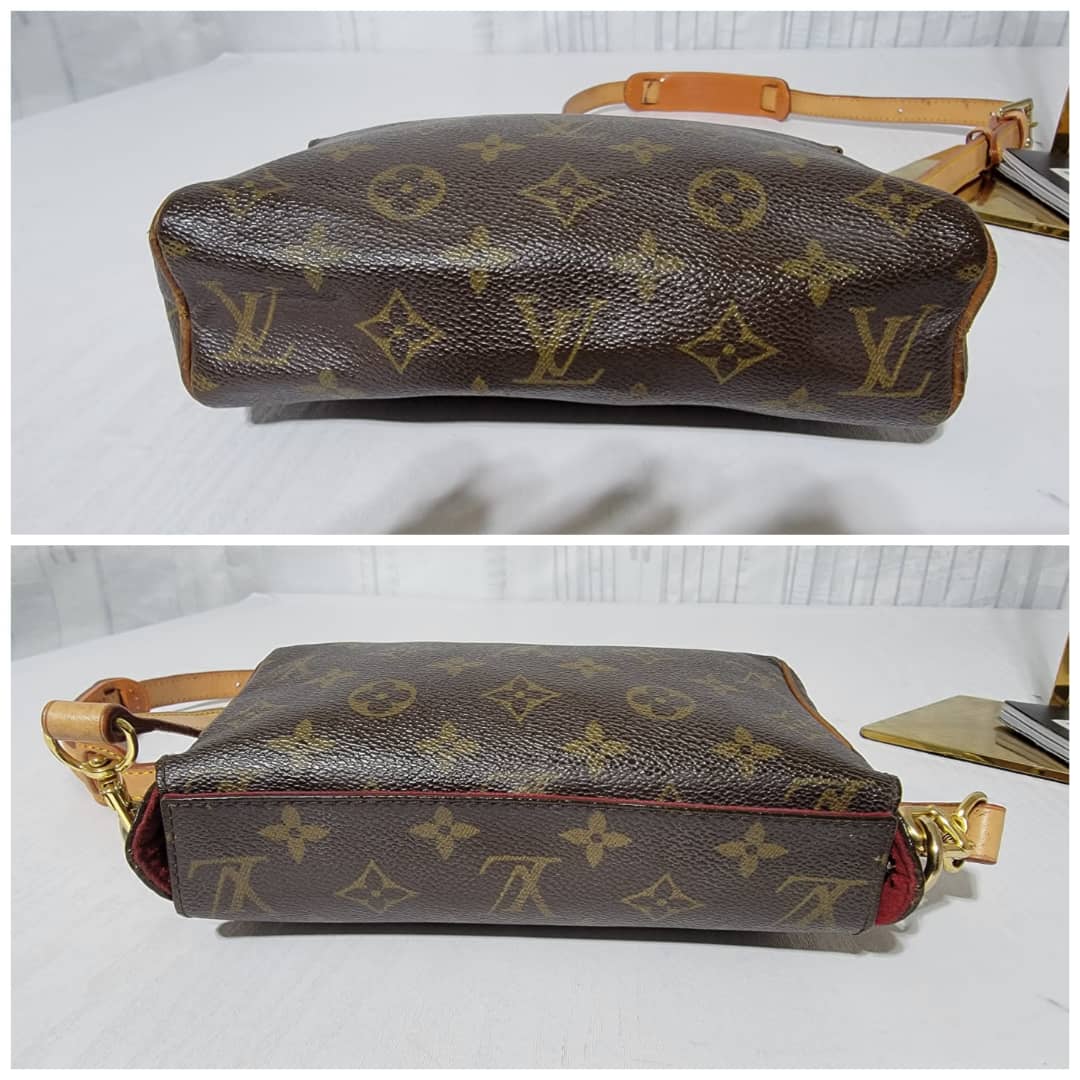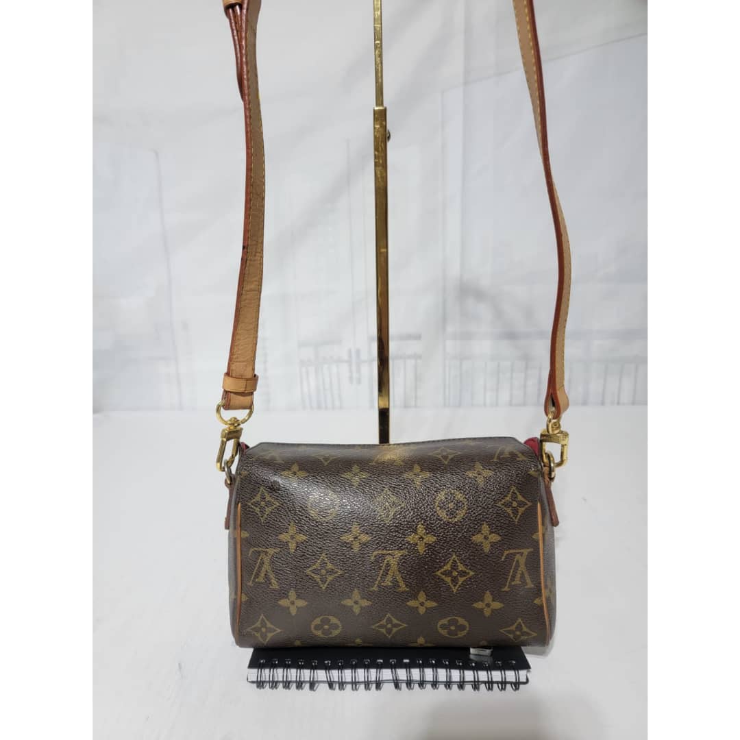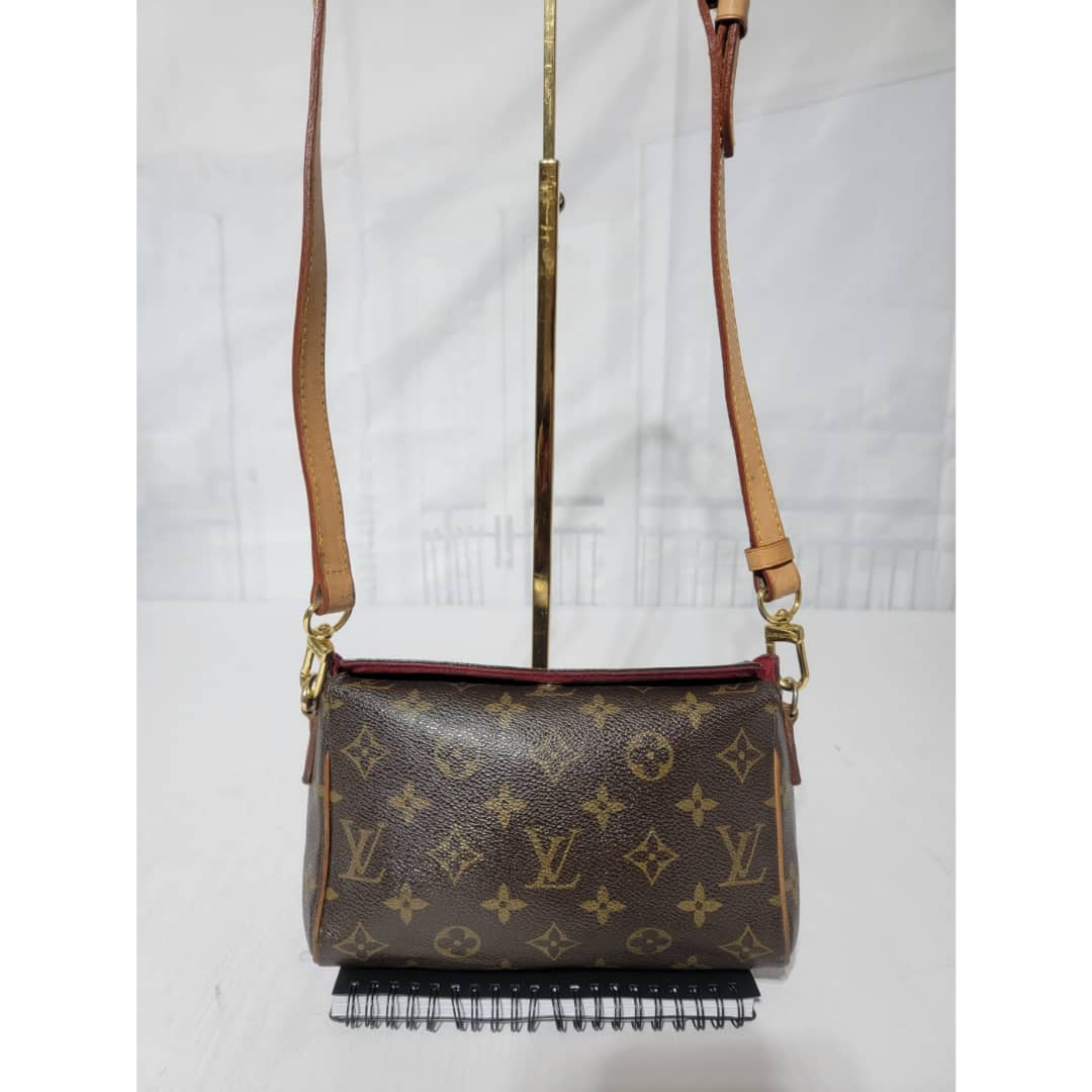 This authentic Louis Vuitton Monogram Recital Bag Brown is in it’s good pre-owned condition. The exterior coated canvas is clean and beautiful. The vachatte leather that runs by the side of the bag shows rubbing and brown patina wear to the vachatte leather. The strap was changed to a different generic strap. The interior is clean however shows sign of use (Kindly look at pictures above).