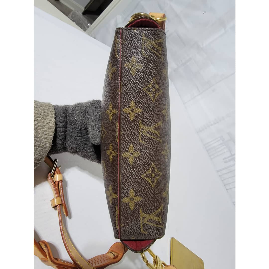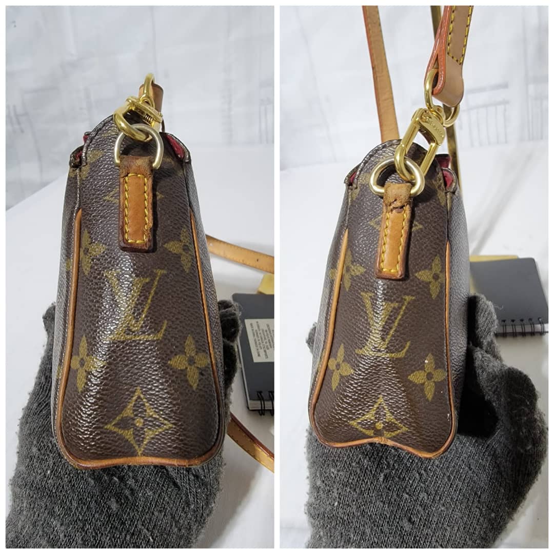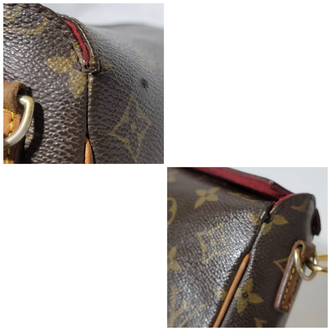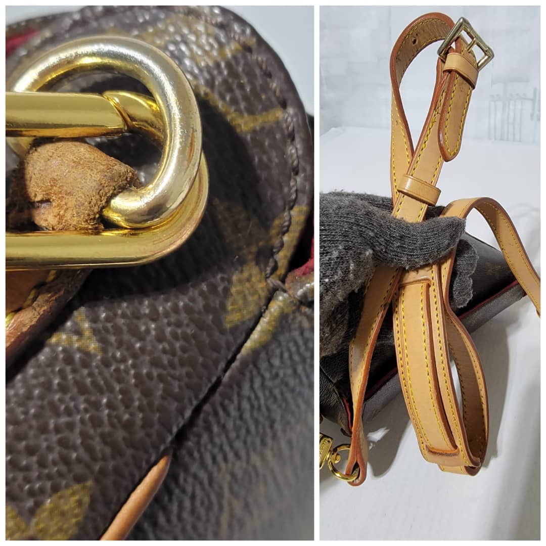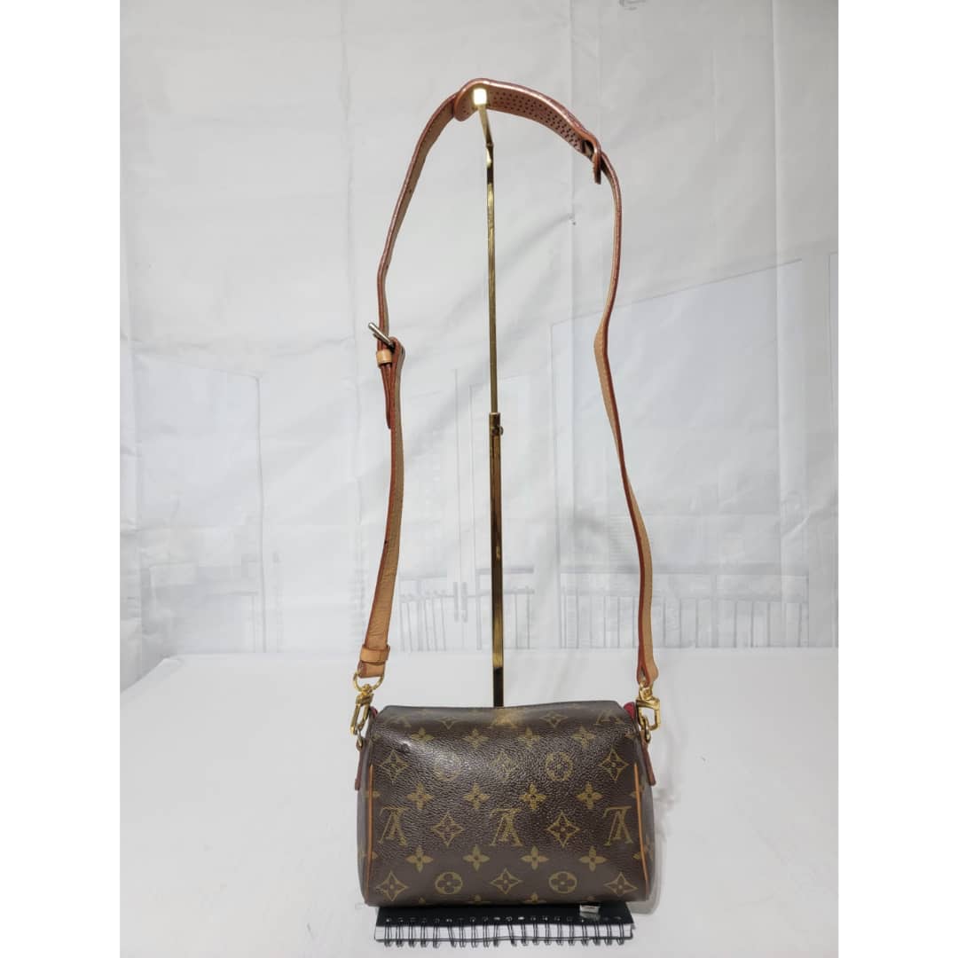 This authentic Louis Vuitton Monogram Recital Bag Brown is in it’s good pre-owned condition. The exterior coated canvas is clean and beautiful. The vachatte leather that runs by the side of the bag shows rubbing and brown patina wear to the vachatte leather. The strap was changed to a different generic strap. The interior is clean however shows sign of use (Kindly look at pictures above).
