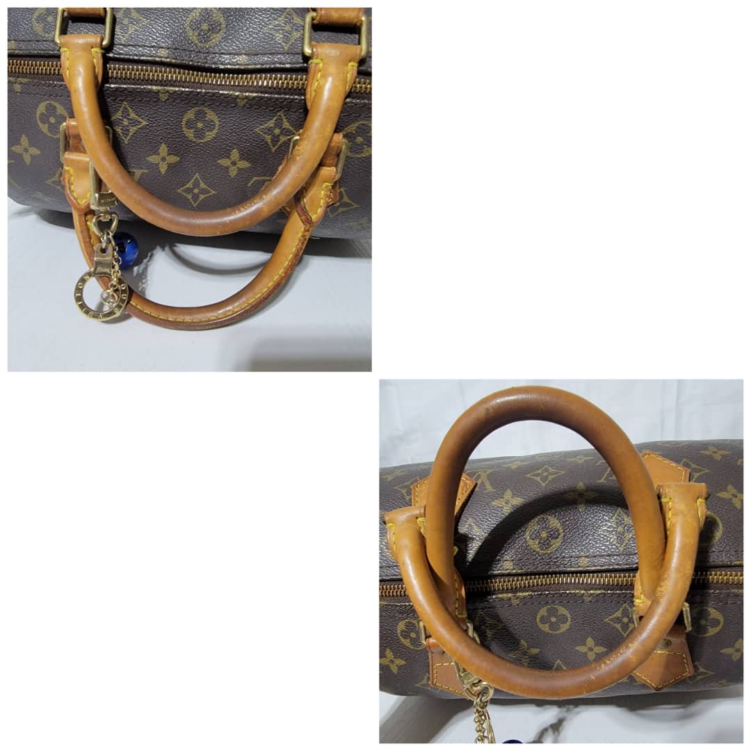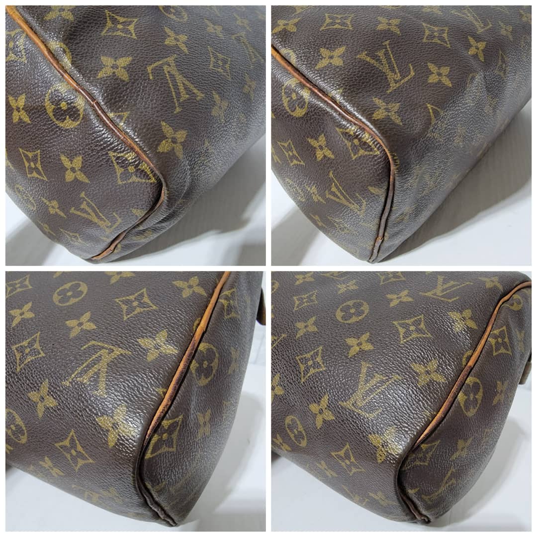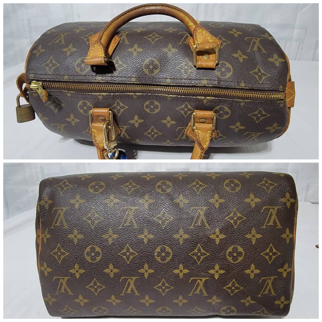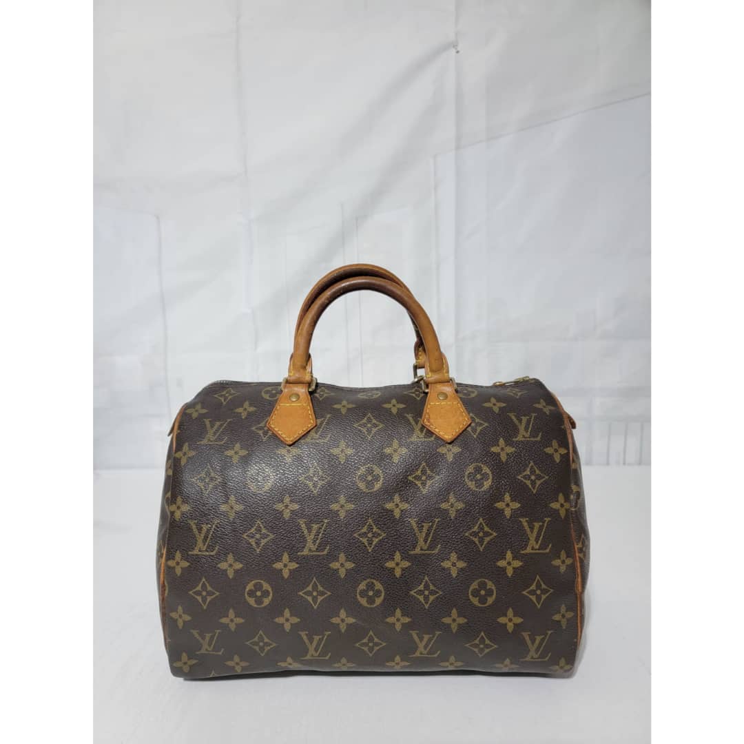 This authentic Louis Vuitton Monogram Speedy 30 Bag Brown is in it’s good pre-owned condition. The exterior monogram canvas is clean and beautiful. Interior is clean. The zipper pull leather is out.The vachatte leather on the handle shows some rubbing and honey patina wear. The trim that runs at the side of the bag shows some rubbing and light cracks (Kindly review pictures above).