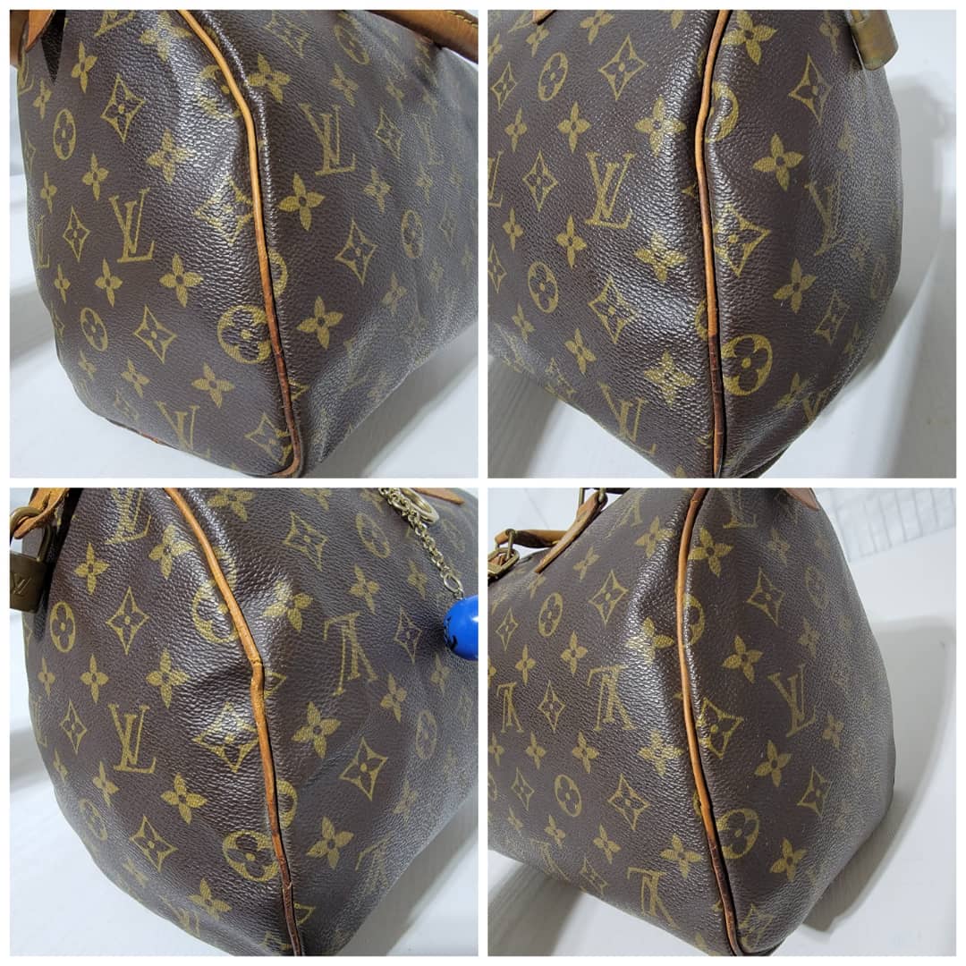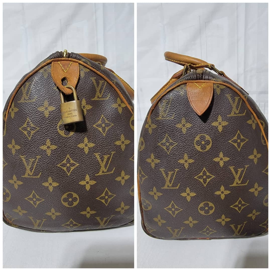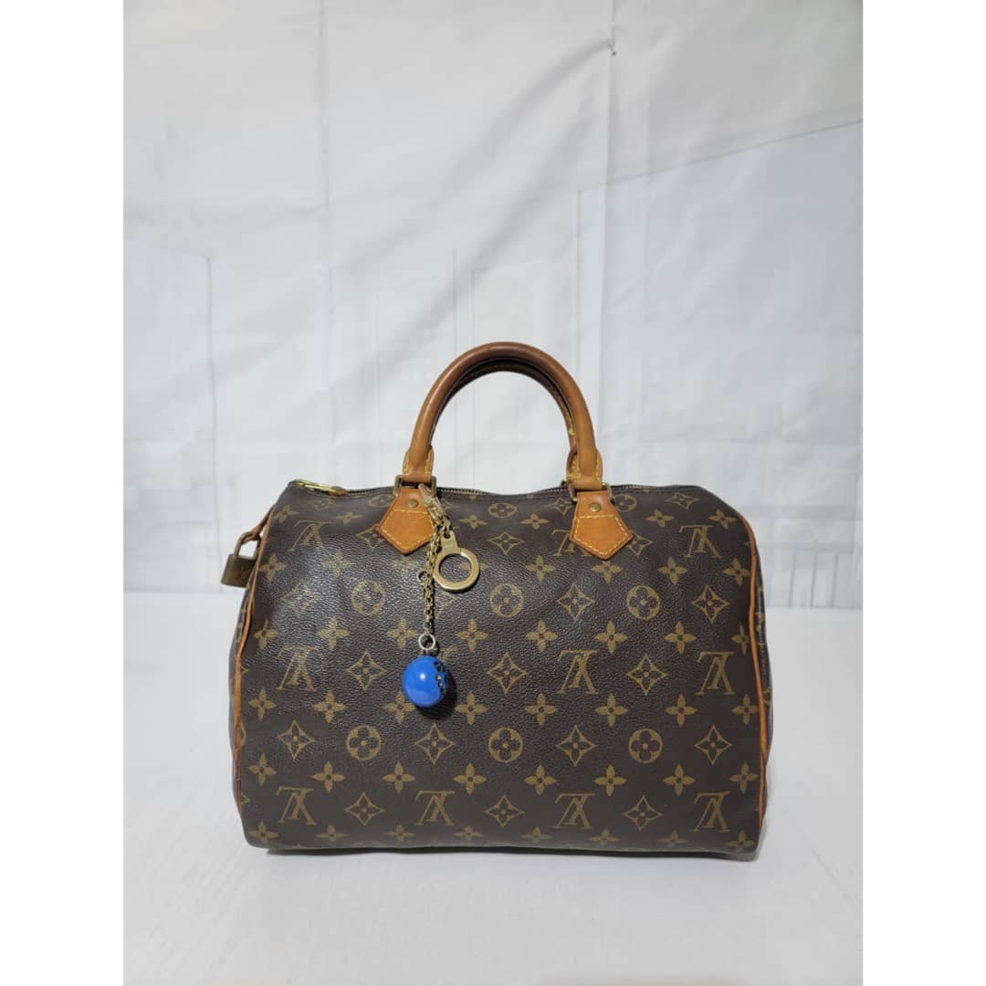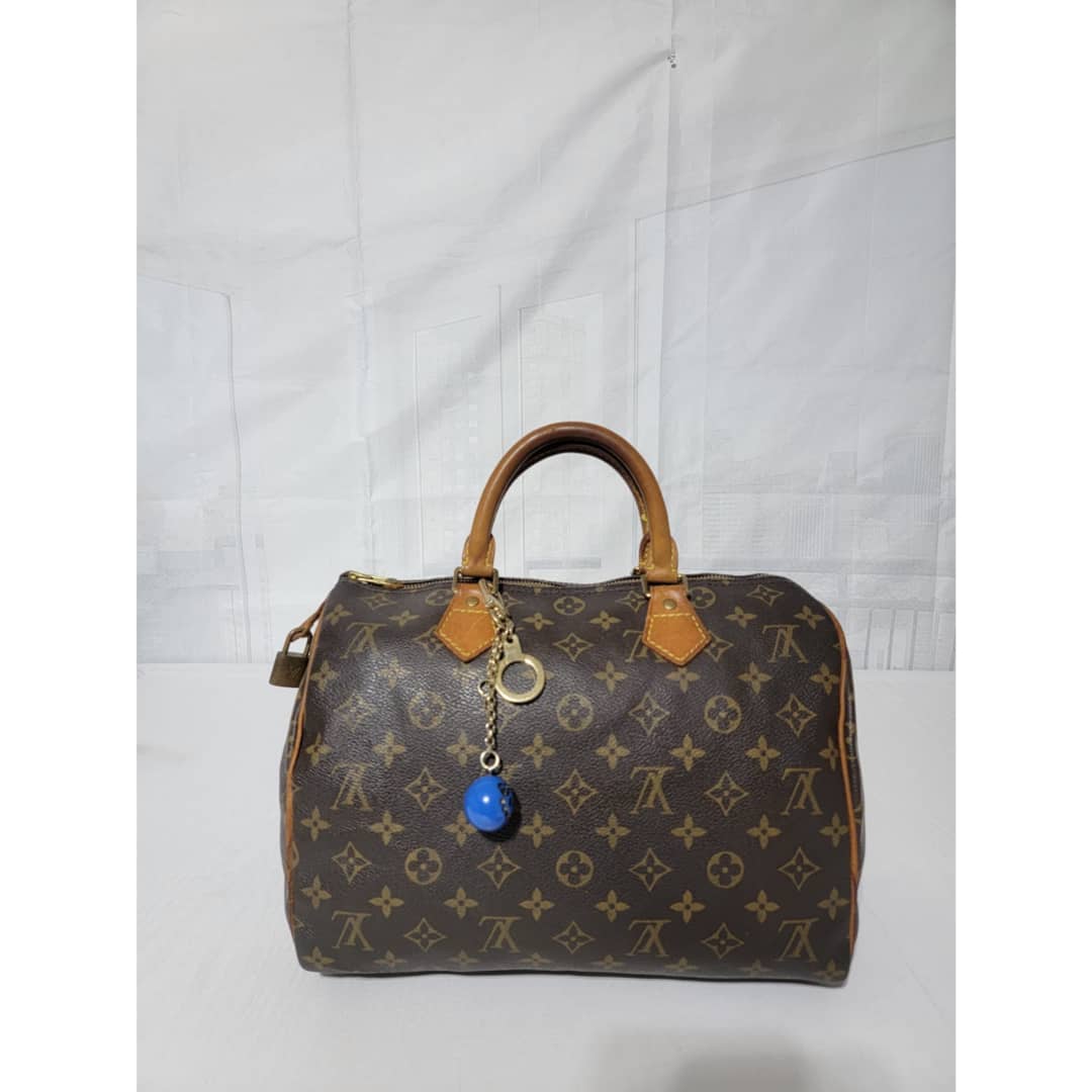 This authentic Louis Vuitton Monogram Speedy 30 Bag Brown is in it’s good pre-owned condition. The exterior monogram canvas is clean and beautiful. Interior is clean. The zipper pull leather is out.The vachatte leather on the handle shows some rubbing and honey patina wear. The trim that runs at the side of the bag shows some rubbing and light cracks (Kindly review pictures above).