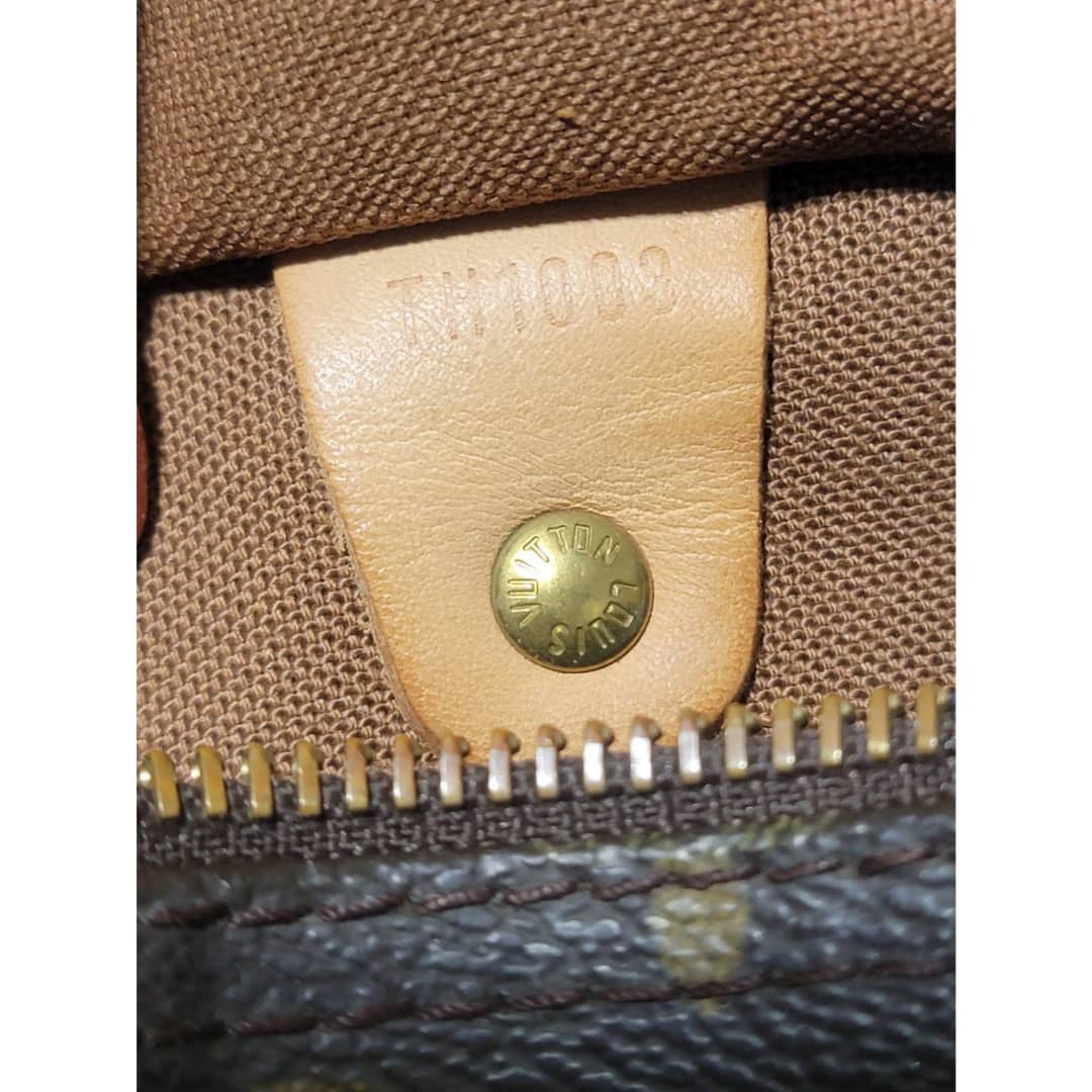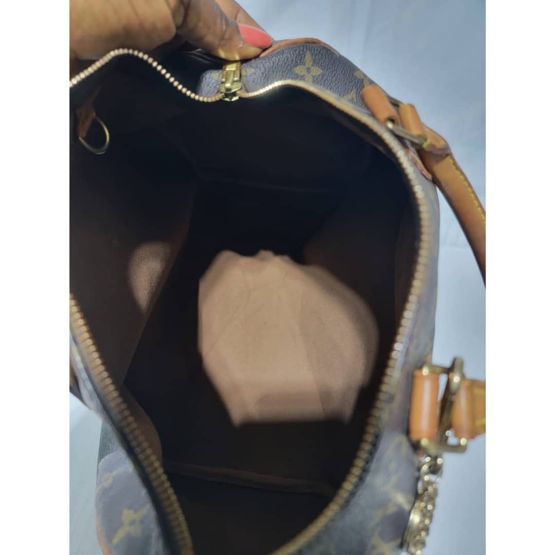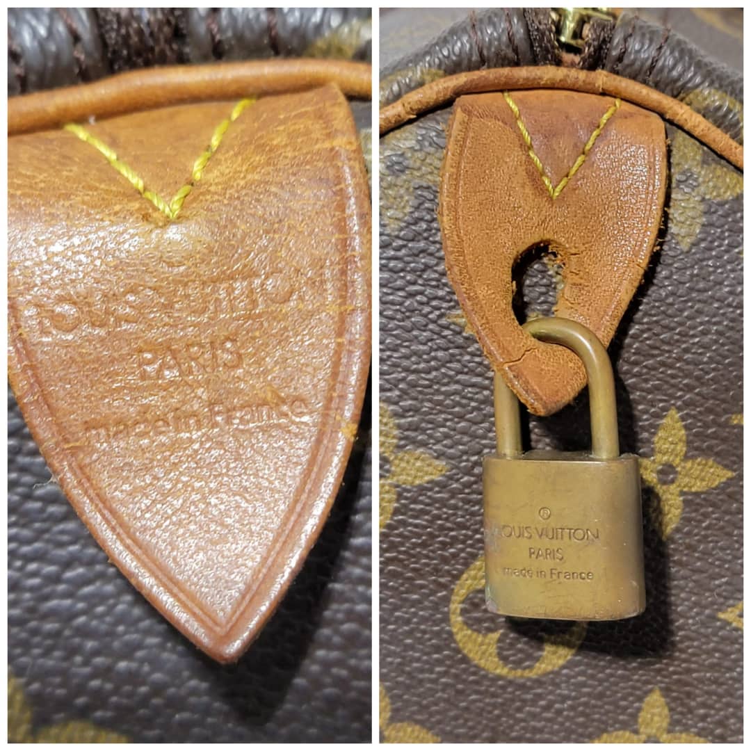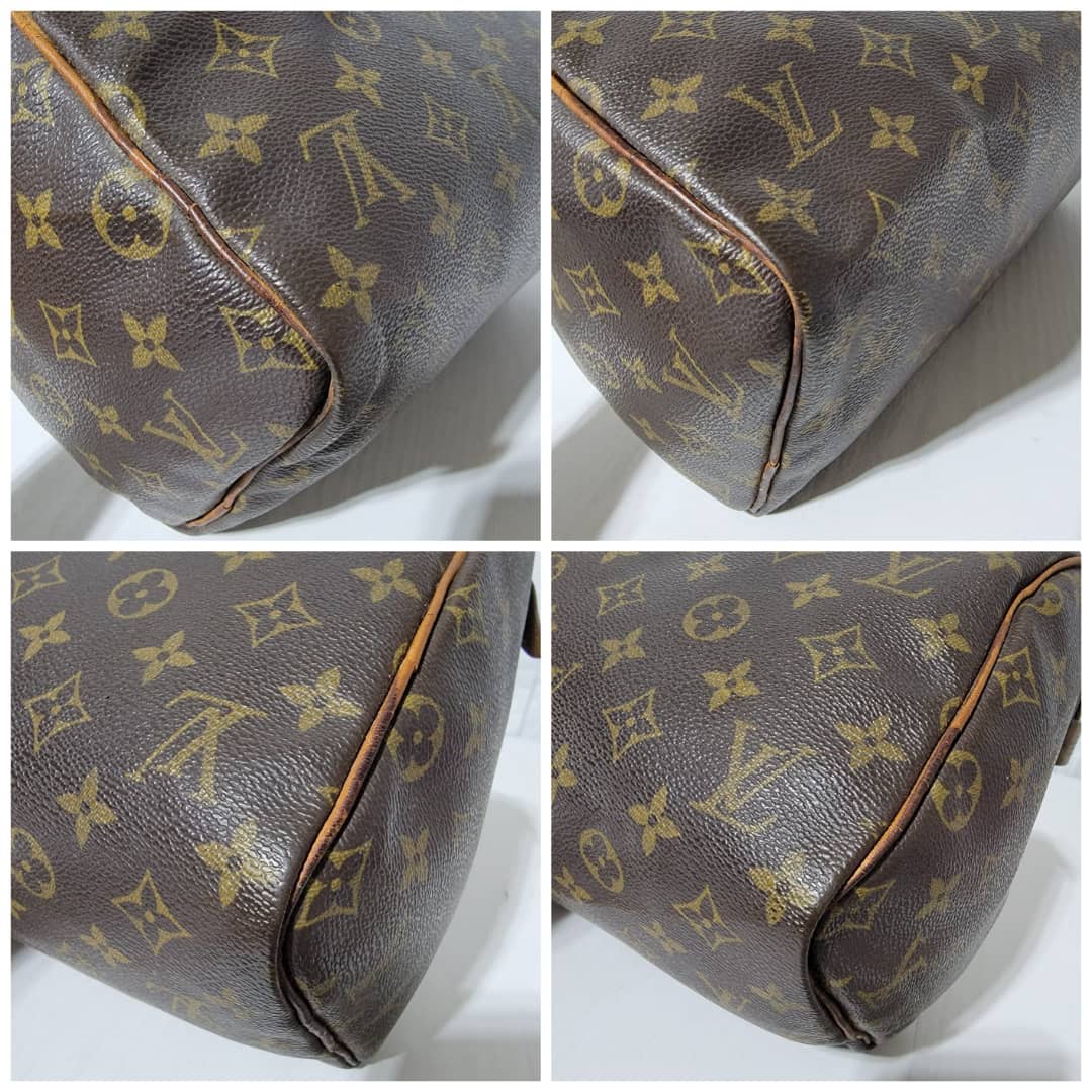 This authentic Louis Vuitton Monogram Speedy 30 Bag Brown is in it’s good pre-owned condition. The exterior monogram canvas is clean and beautiful. Interior is clean. The zipper pull leather is out.The vachatte leather on the handle shows some rubbing and honey patina wear. The trim that runs at the side of the bag shows some rubbing and light cracks (Kindly review pictures above).