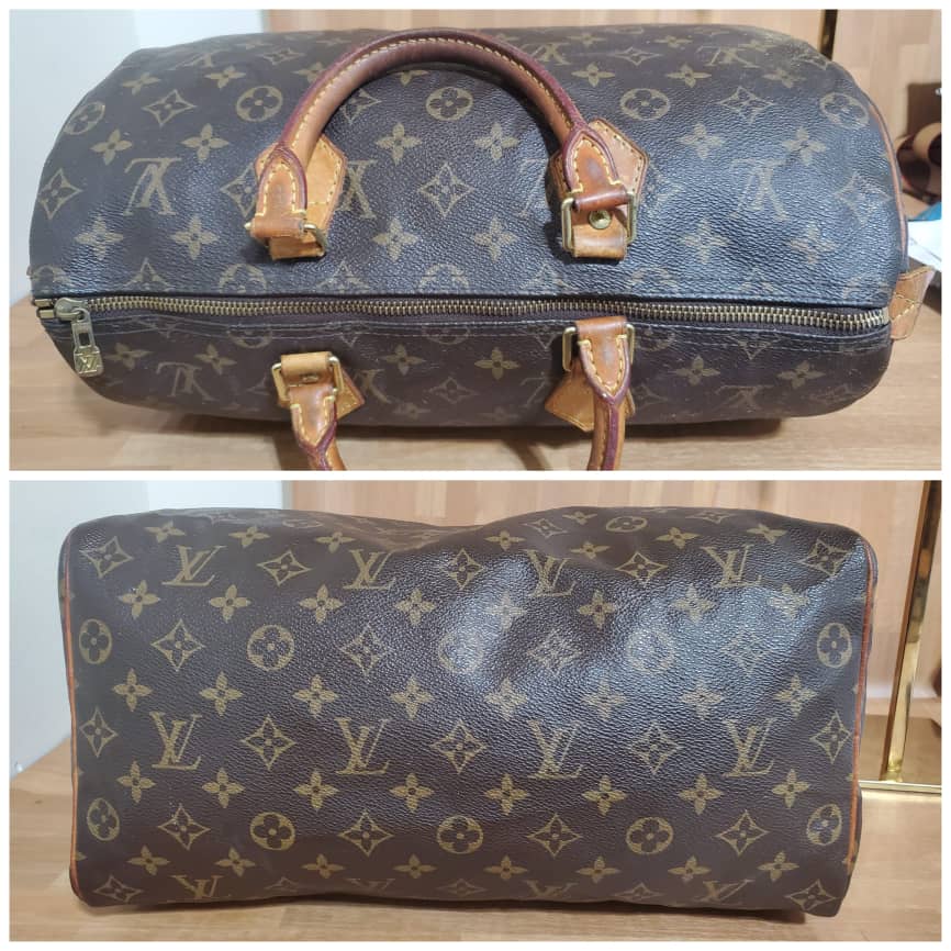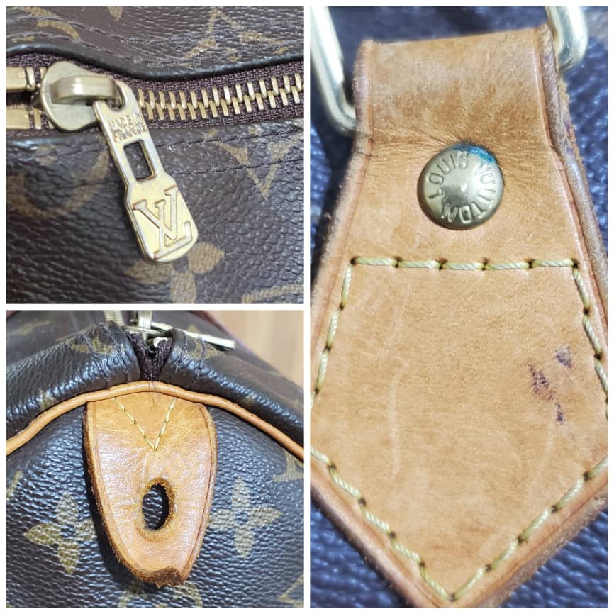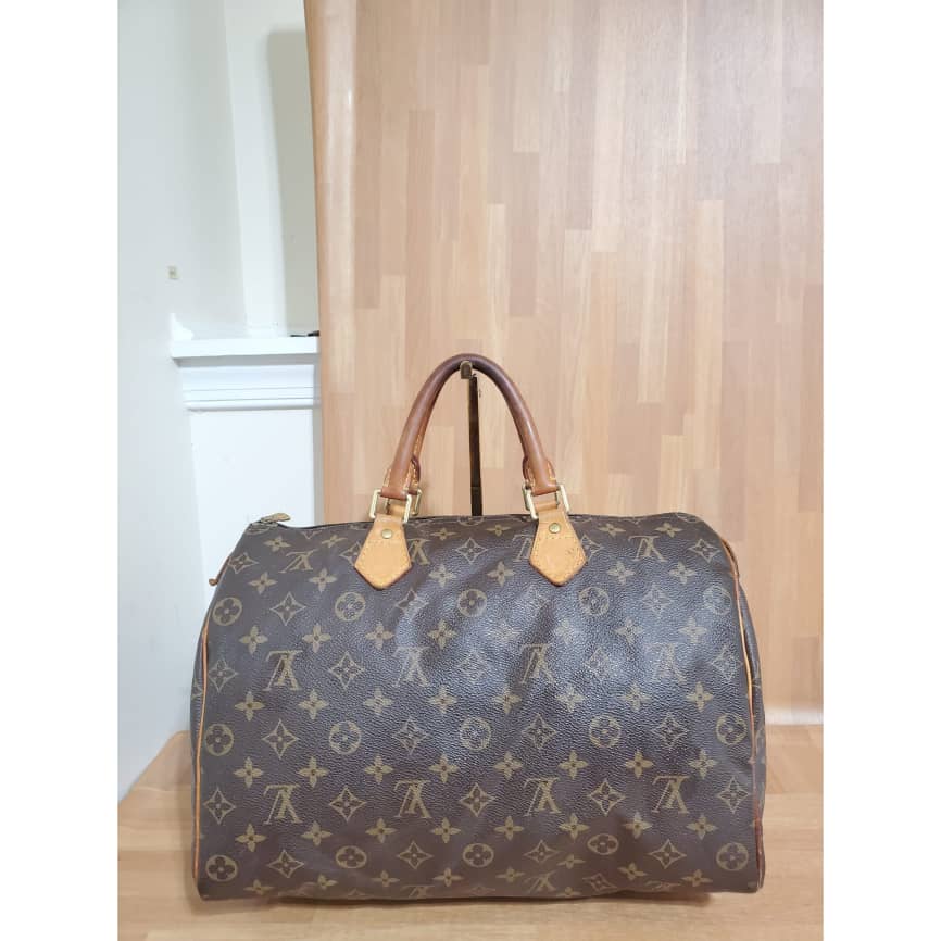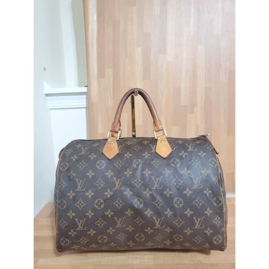 This authentic LOUIS VUITTON Monogram Speedy 35 is in it’s good pre-owned condition. Has sign of use. The exterior coated Monogram canvas is clean and beautiful .interior is clean. The vachatte leather throughout shows water mark and honey patina also on the handles.
