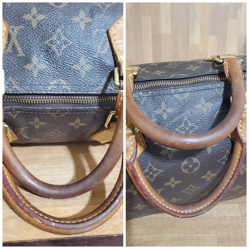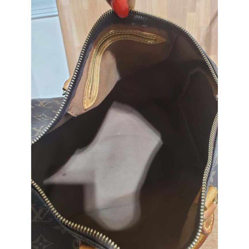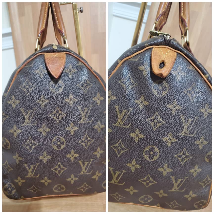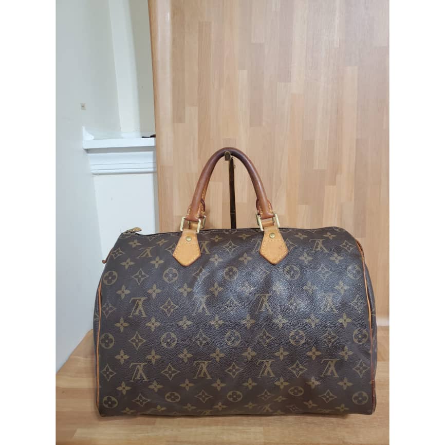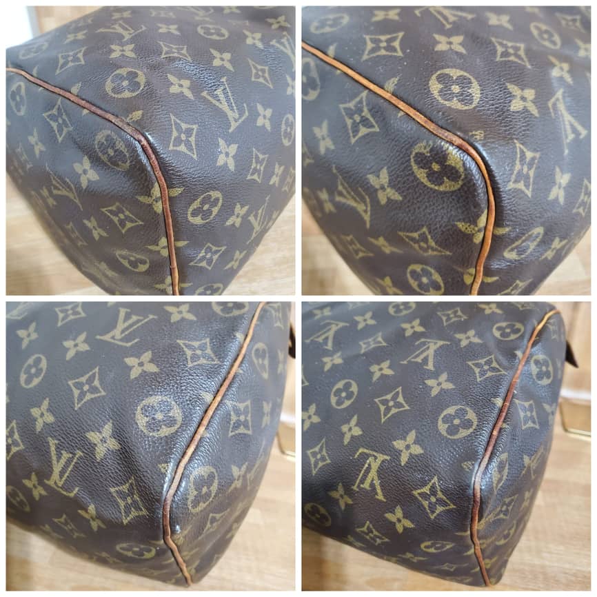 This authentic LOUIS VUITTON Monogram Speedy 35 is in it’s good pre-owned condition. Has sign of use. The exterior coated Monogram canvas is clean and beautiful .interior is clean. The vachatte leather throughout shows water mark and honey patina also on the handles.