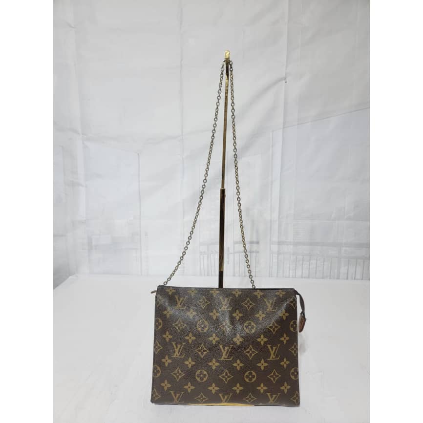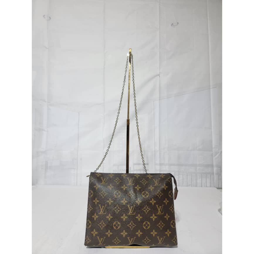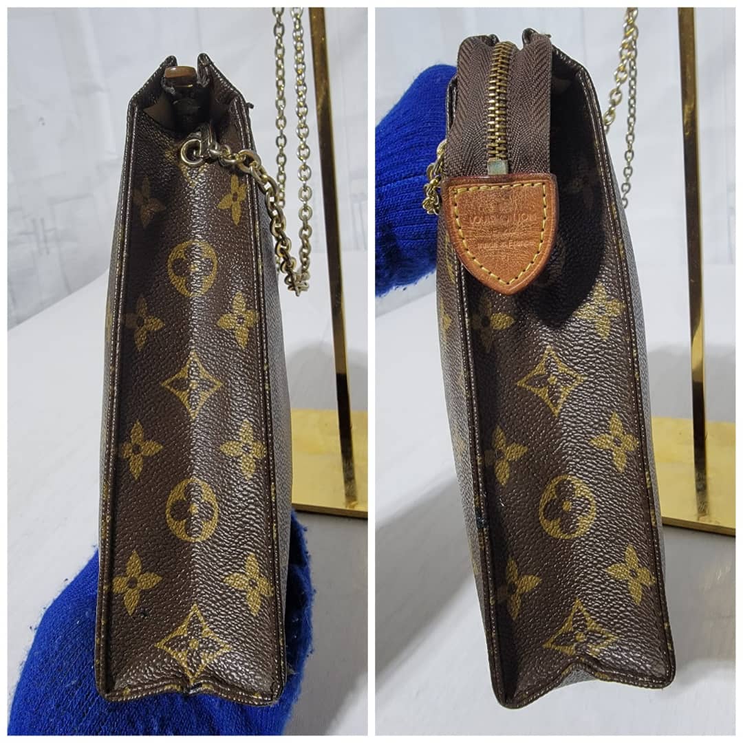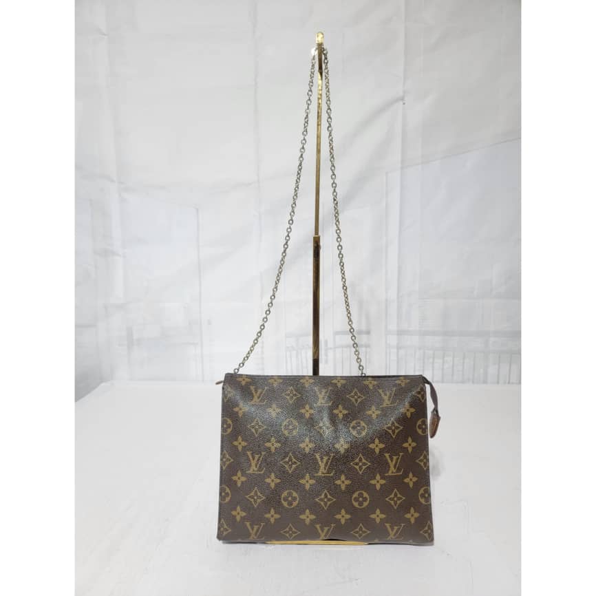 Monogram Toiletry Pouch 26 with chain Strap. Is in it’s good pre-owned condition. The exterior coated canvas is clean and beautiful. Interior is clean. I attached a detachable chain strap by the side. So it can be worn as a clutch or crossbody/shoulder bag.