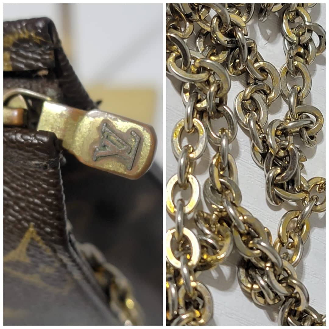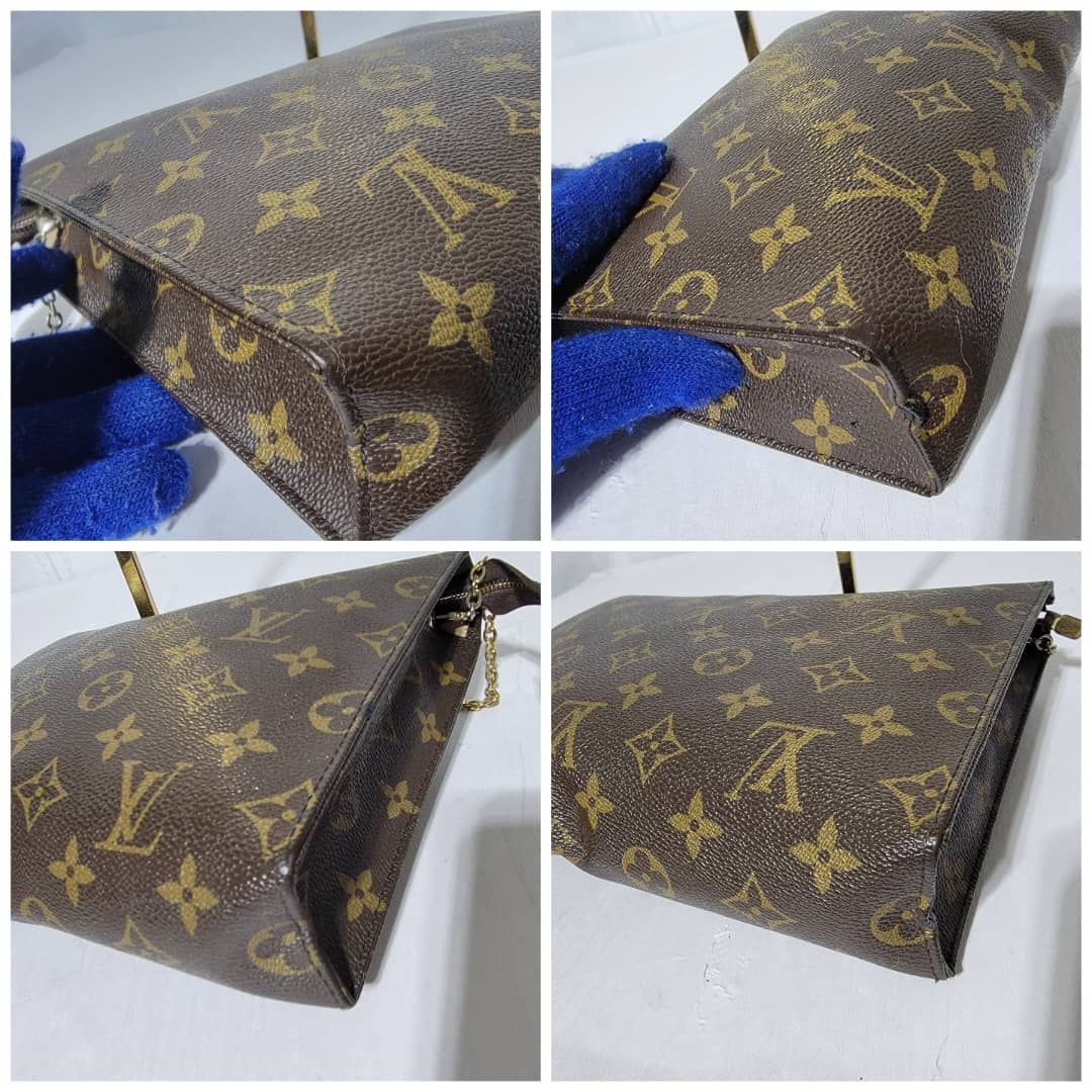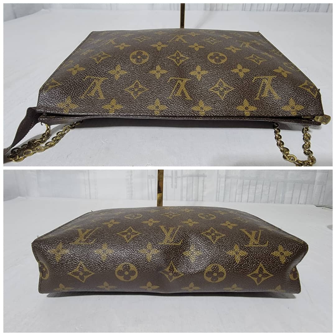 Monogram Toiletry Pouch 26 with chain Strap. Is in it’s good pre-owned condition. The exterior coated canvas is clean and beautiful. Interior is clean. I attached a detachable chain strap by the side. So it can be worn as a clutch or crossbody/shoulder bag.