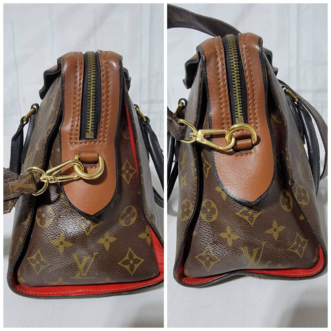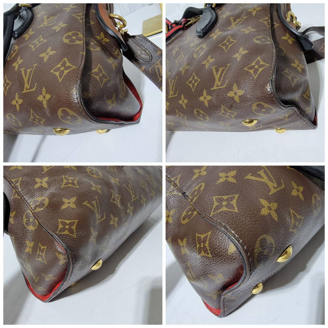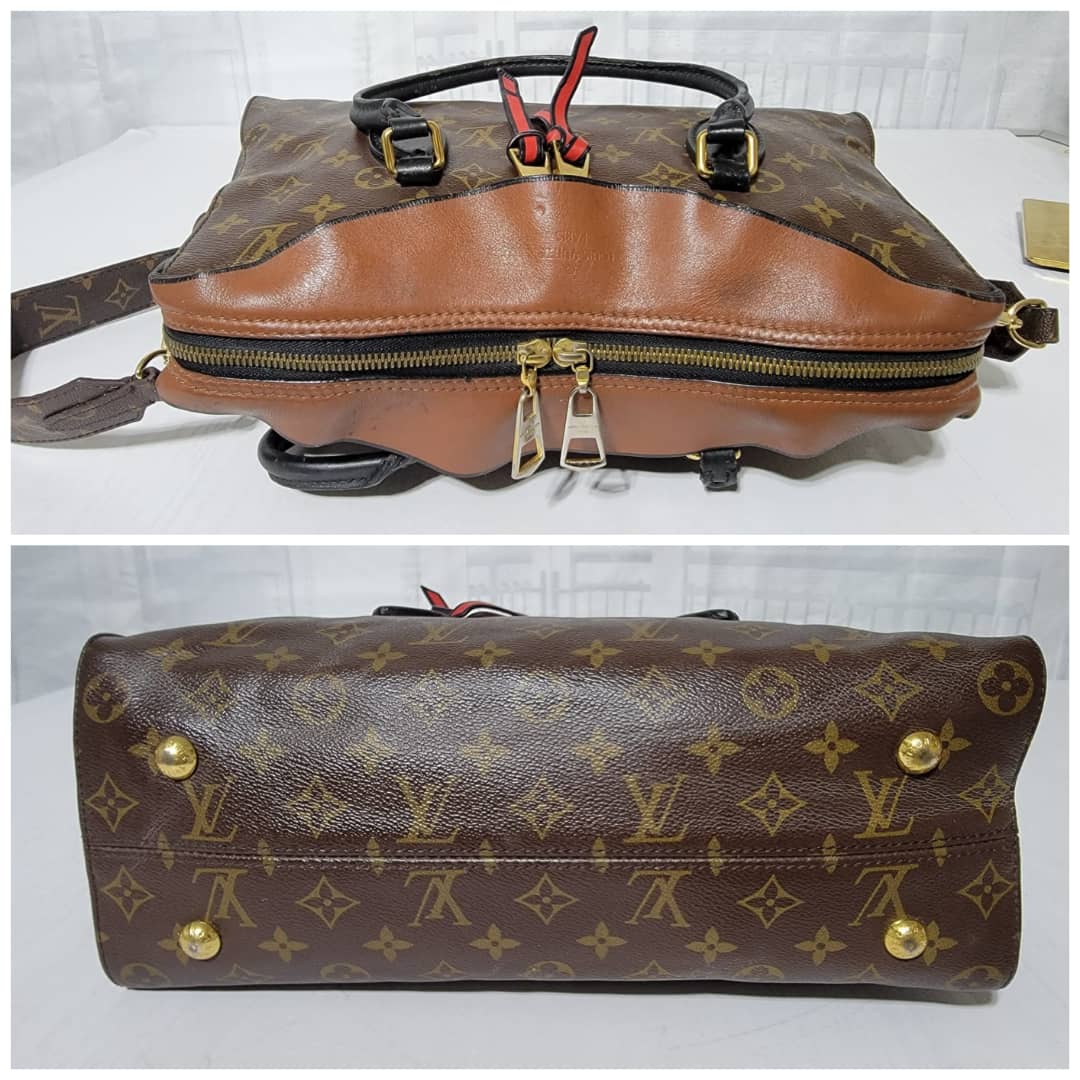 This authentic Louis Vuitton monogram tuileries tote bag Brown is in it’s good pre-owned condition. The exterior canvas and leather is clean and beautiful. Interior is clean. Gold hardware shows little scratches. The strap is a generic strap. There are little scratches on the brown leather that runs on top across the bag (Kindly look at pictures above).