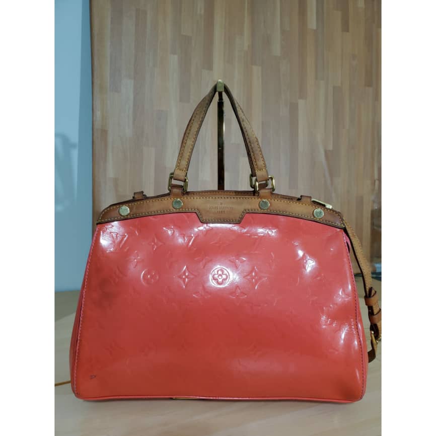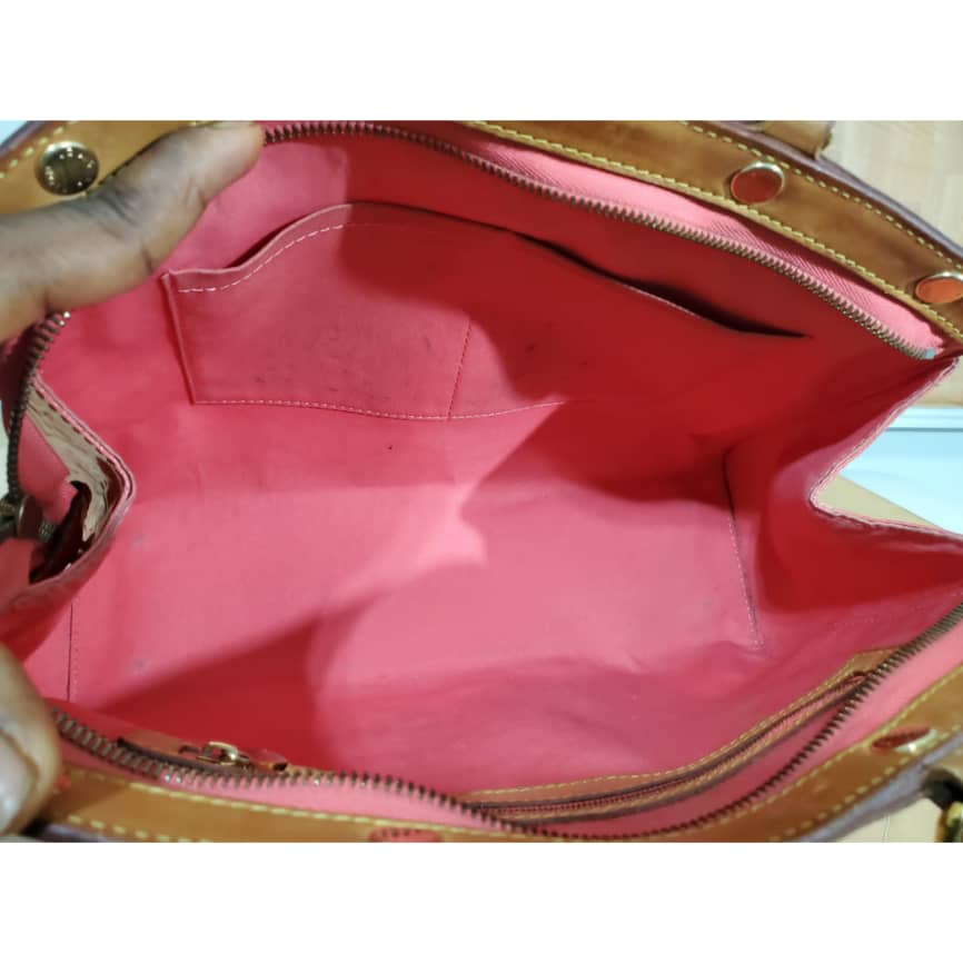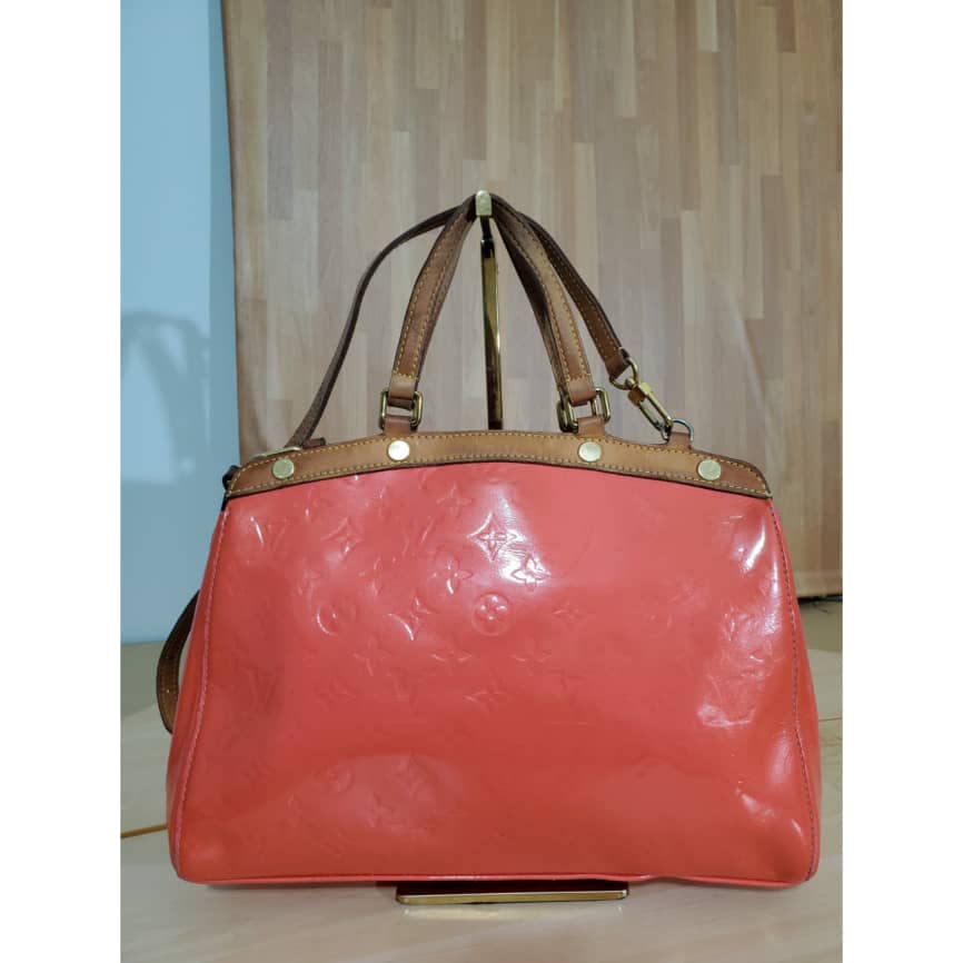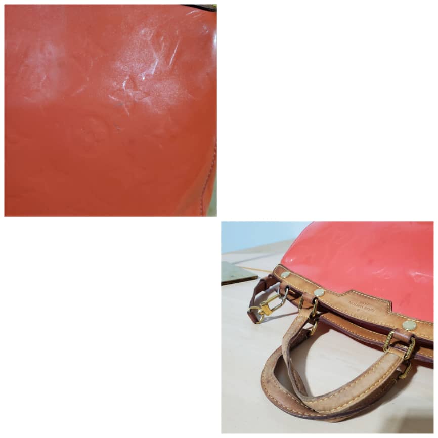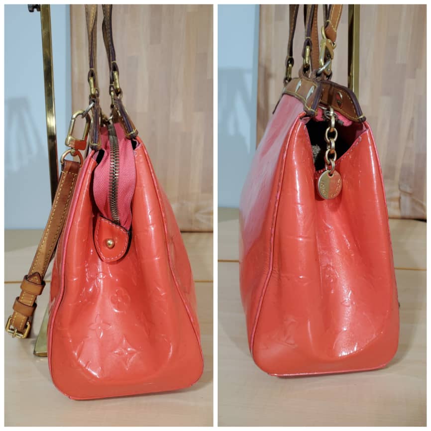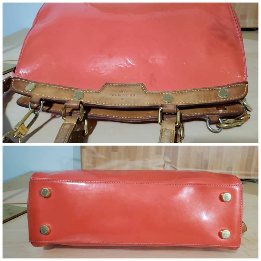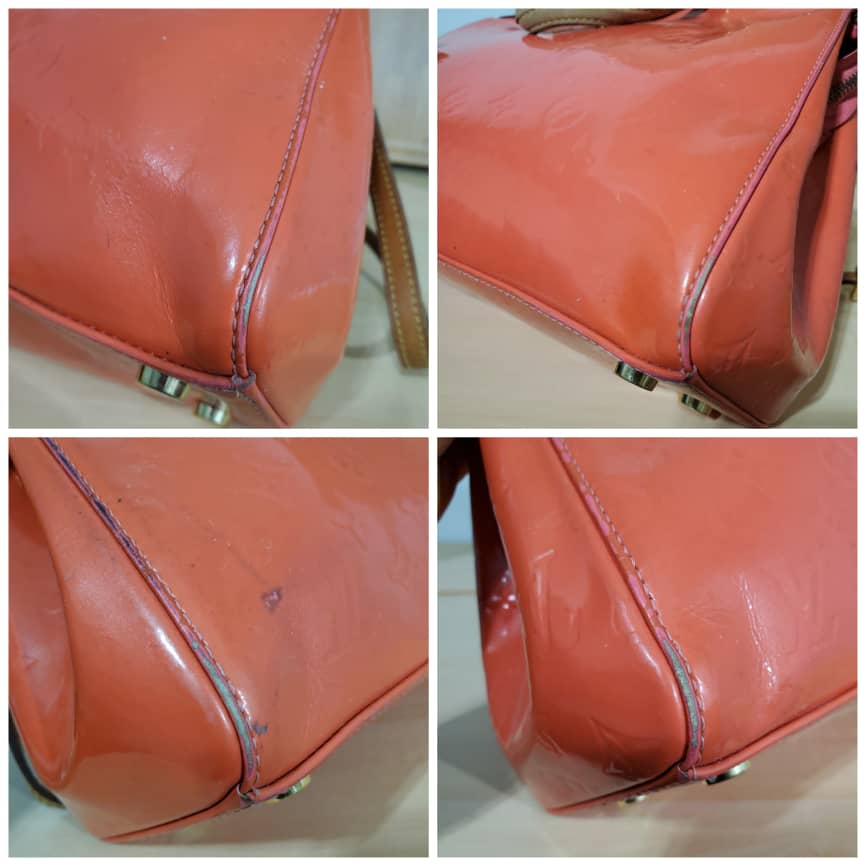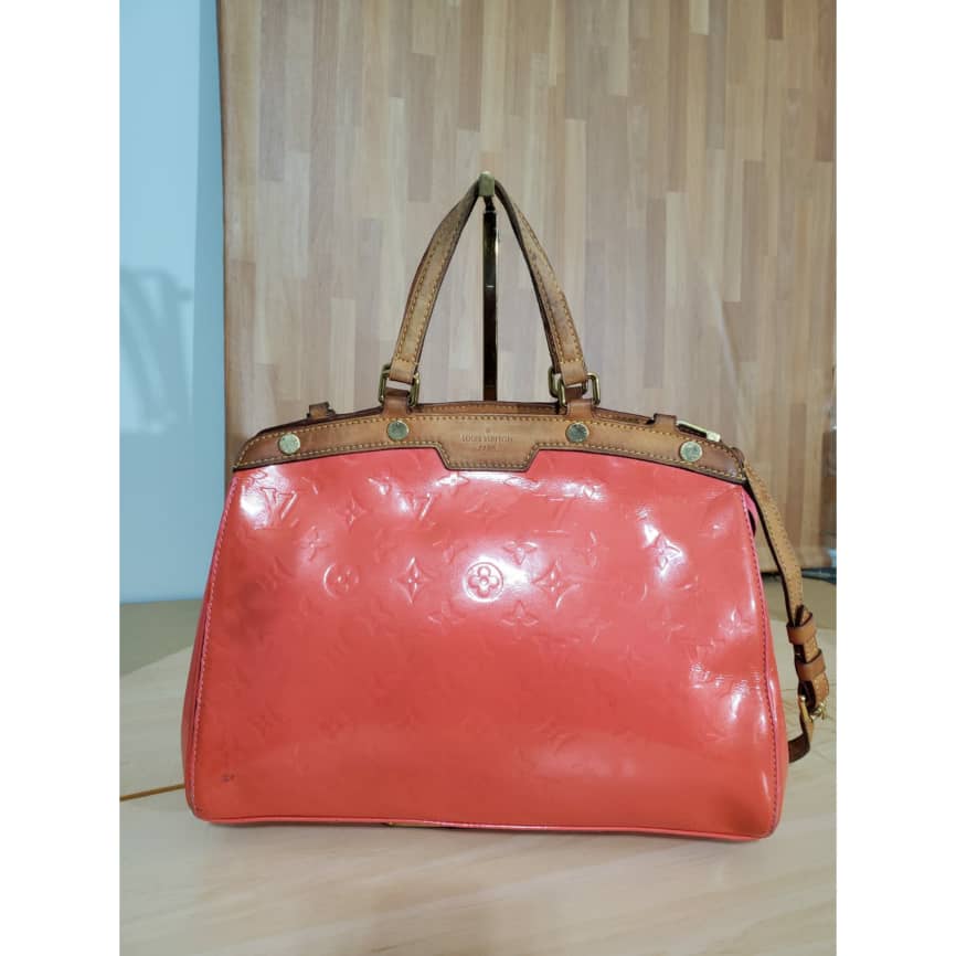 Rose Indian Monogram Vernis Brea MM Bag is in it’s pre-owned condition.has sign of use. The exterior patent leather is clean. Shows light color transfer by the corner . Interior is clean. The vachatte leather handles and trim shows honey patina rubbing and water mark. The edges shows little scratches. Kindly look at pictures