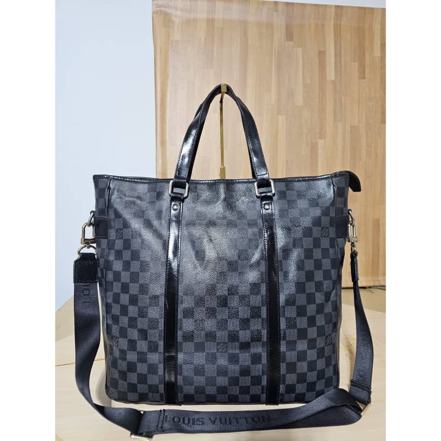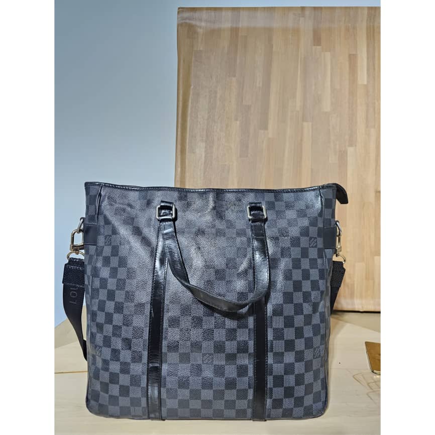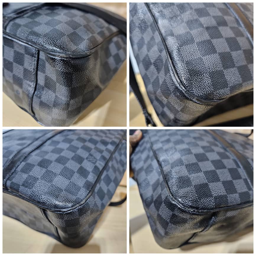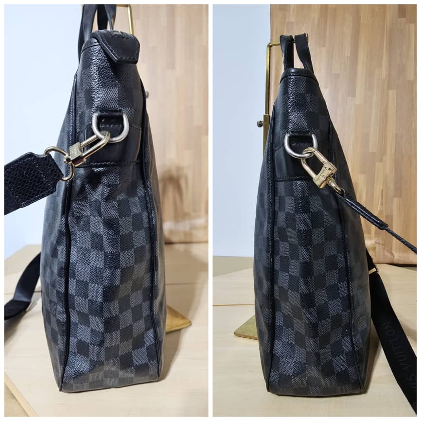 This authentic LOUIS VUITTON Tadao PM Damier Graphite Bag is in it’s good pre-owned condition. The exterior canvas is clean and beautiful. The interior is clean. It has a silver hardware. The strap is from a different Louis Vuitton bag with a gold hardware.