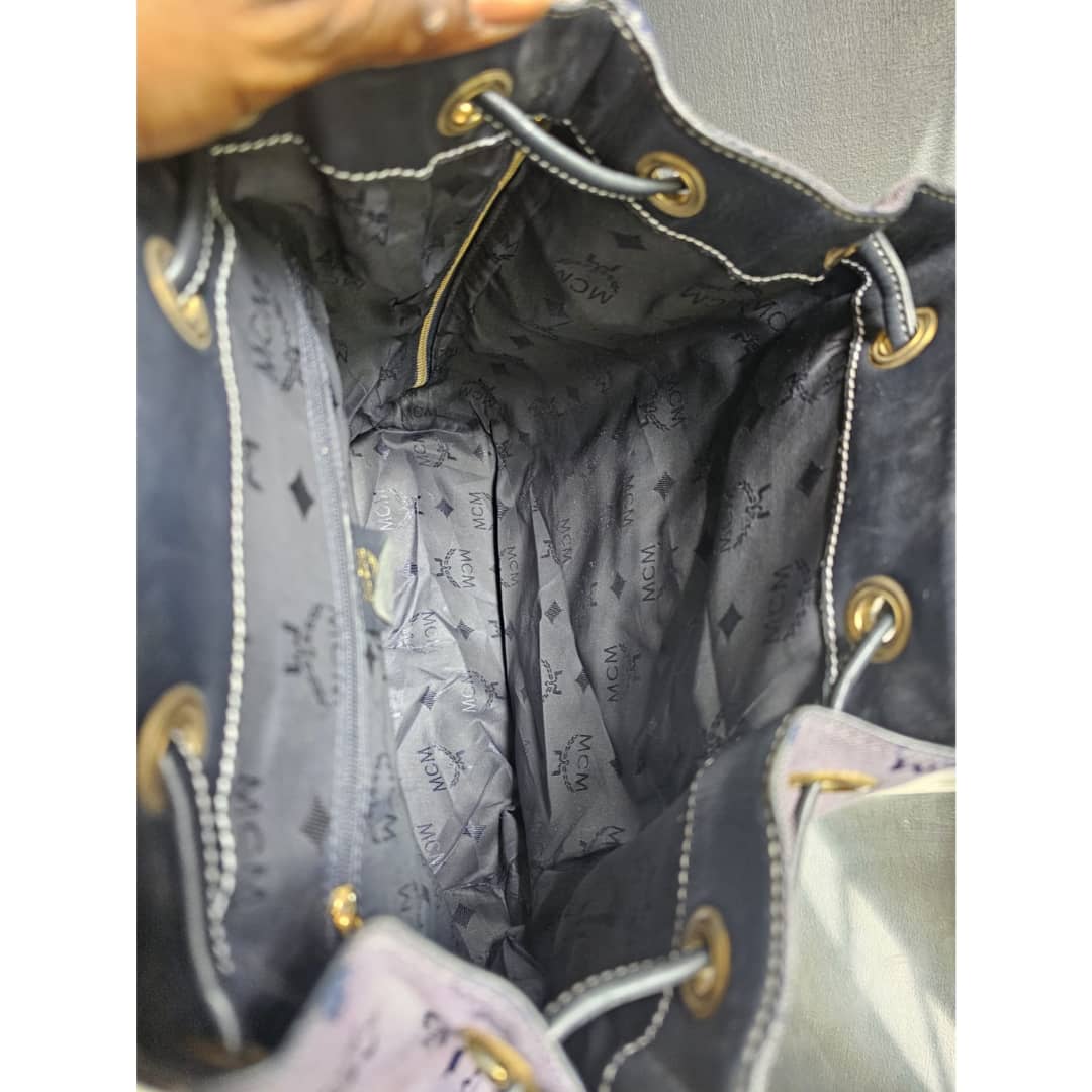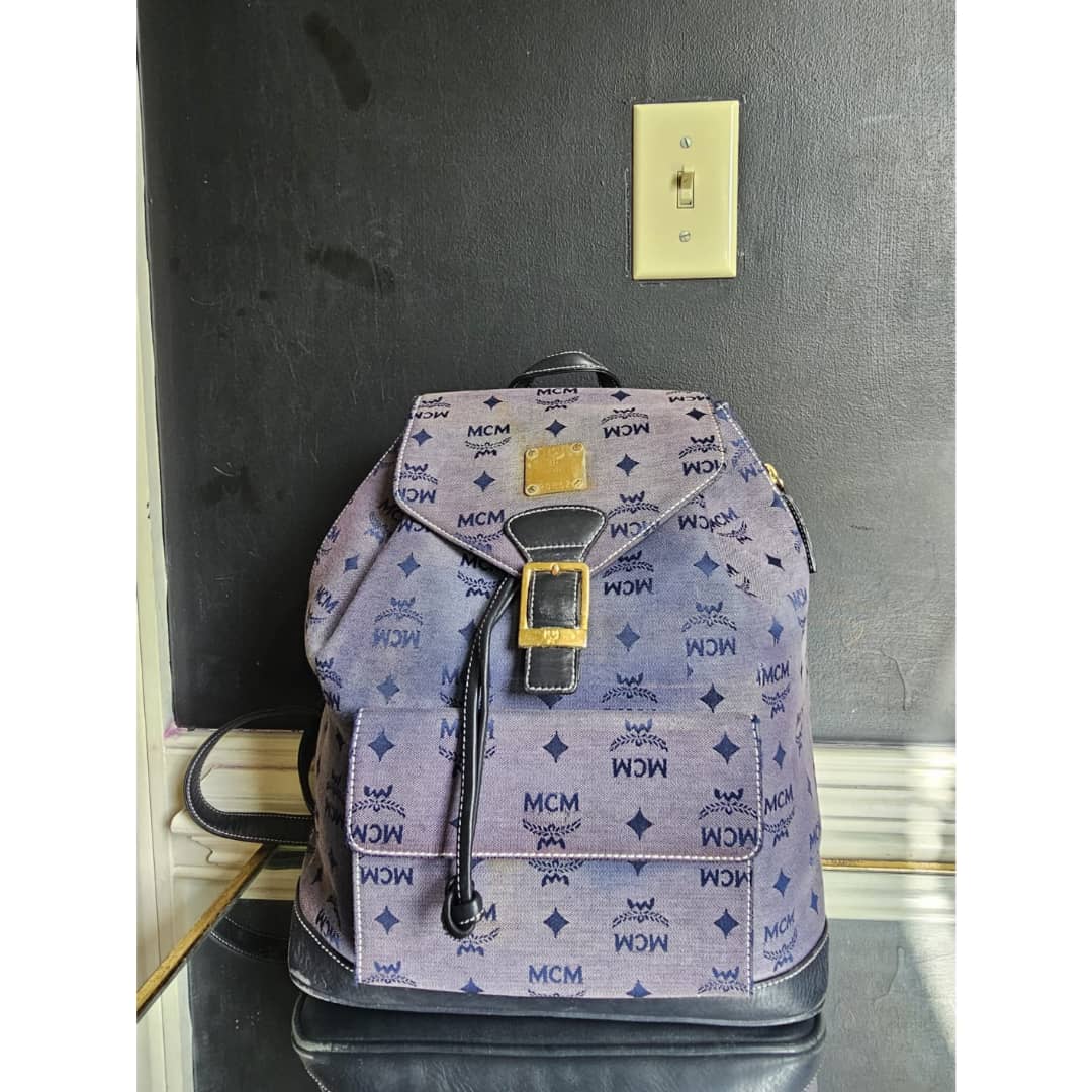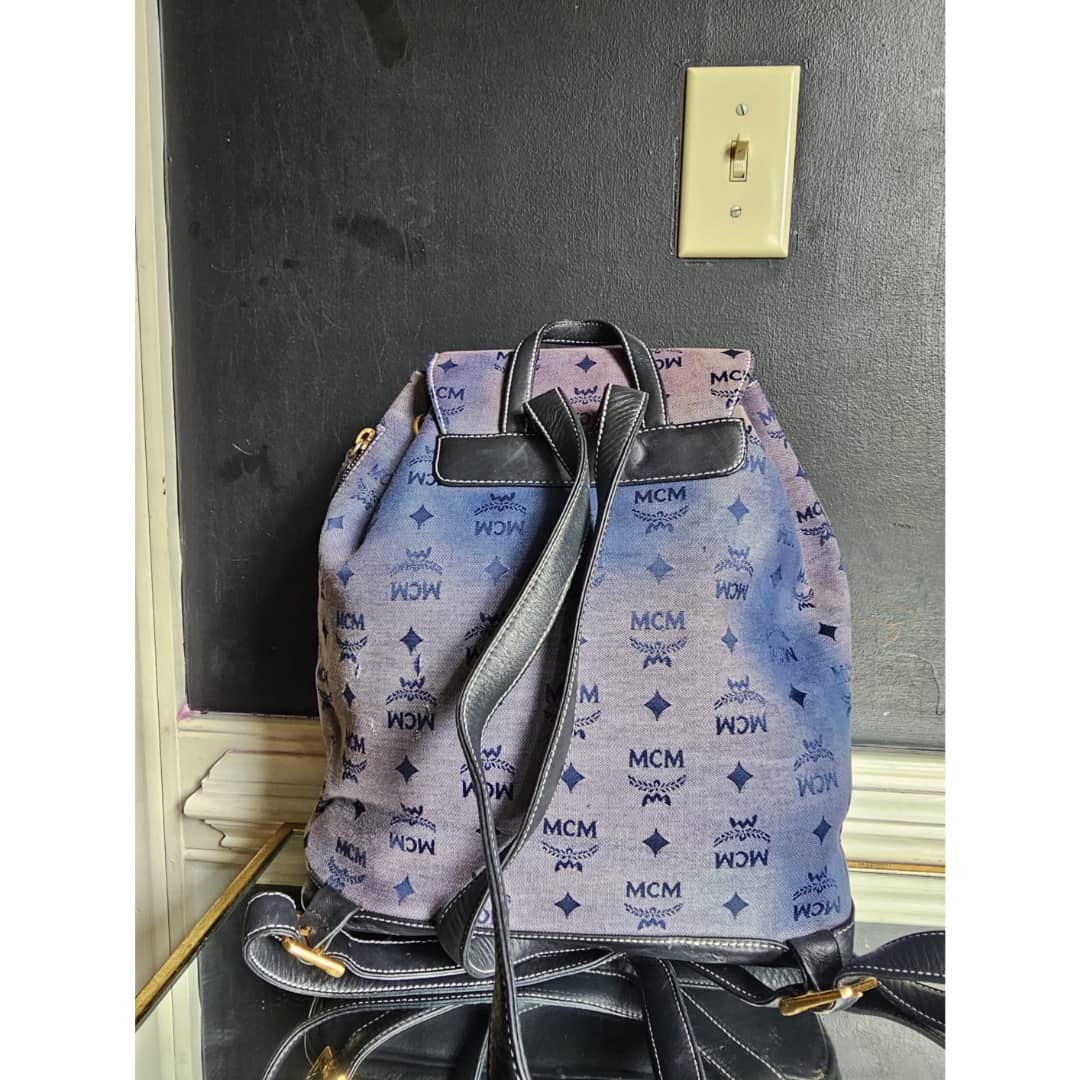This authentic MCM canvas leather backpack gray blue is in it’s good pre-owned condition. The exterior blue canvas is clean but faded. The navy blue leather trim is clean. Interior is clean.