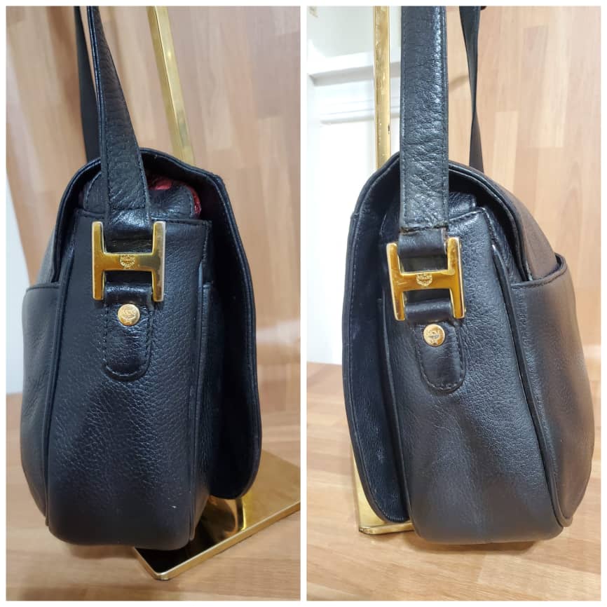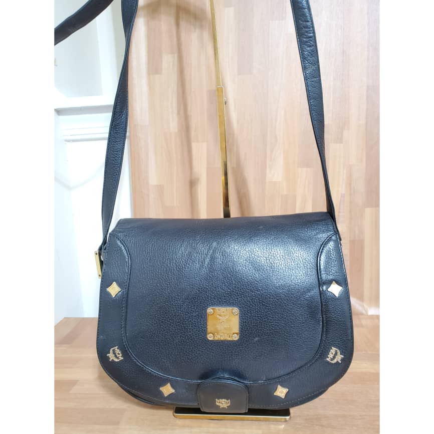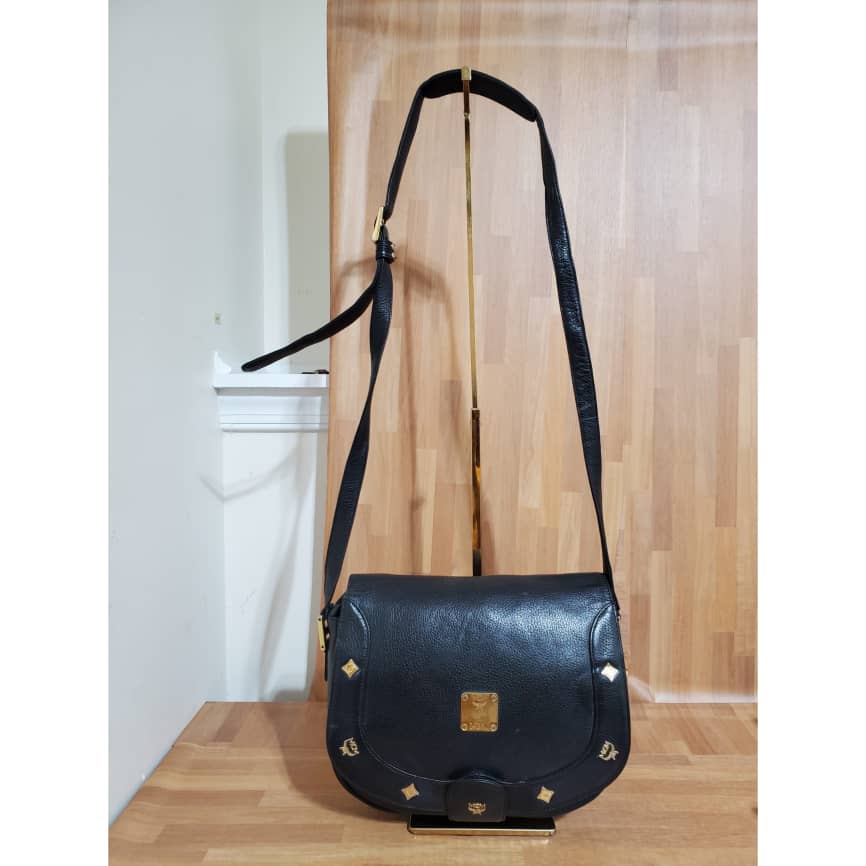 This authentic MCM Vintage Black Leather Flap Embellished Gold Crossbody Bag is in it’s pre-owned condition.has sign of use. The exterior leather is clean and beautiful. Interior is clean. The hardware shows scratches on in it.