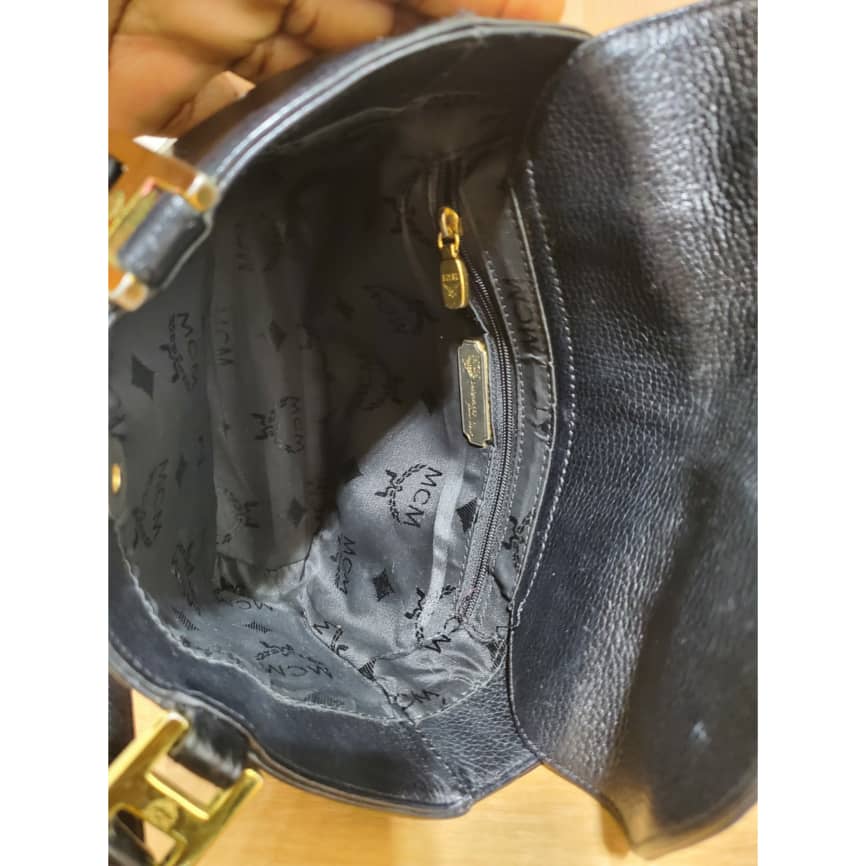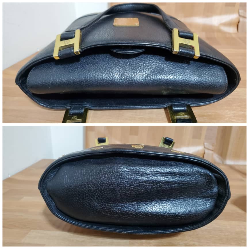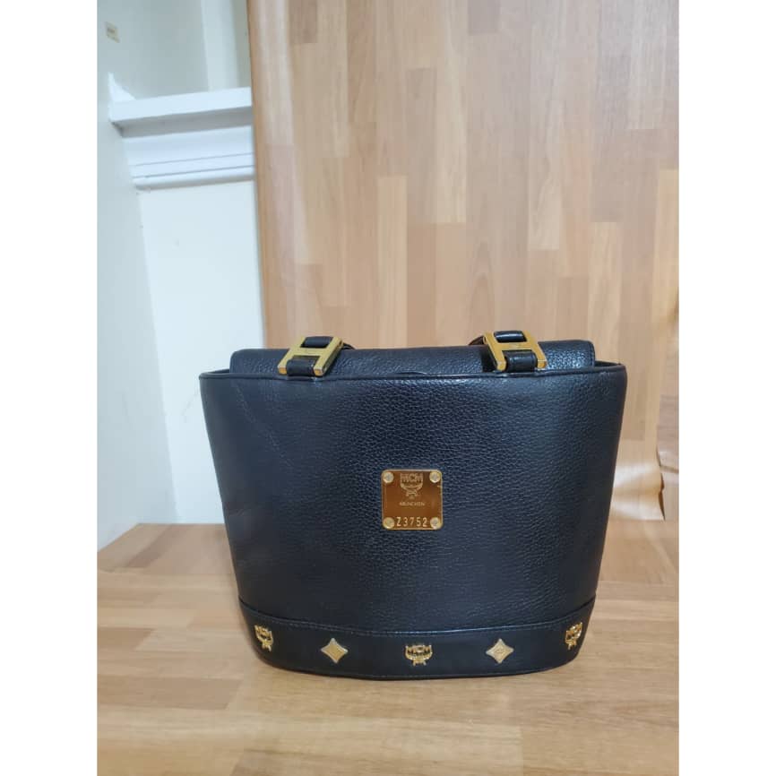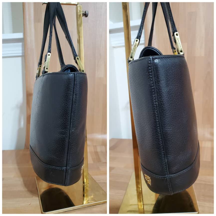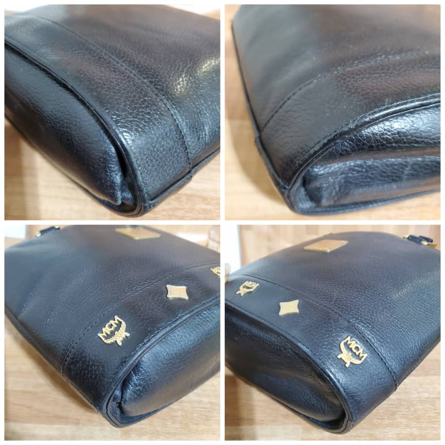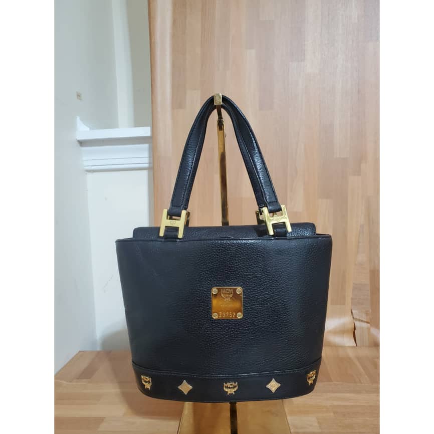 This authentic MCM Black Leather Vintage Logo Embellished Small Tote is in its pre-owned good condition. Has sign of use. The exterior leather is clean and beautiful. Gold hardware is bright and crispy. Interior is clean. Great condition overall. It’s a beautiful small tote