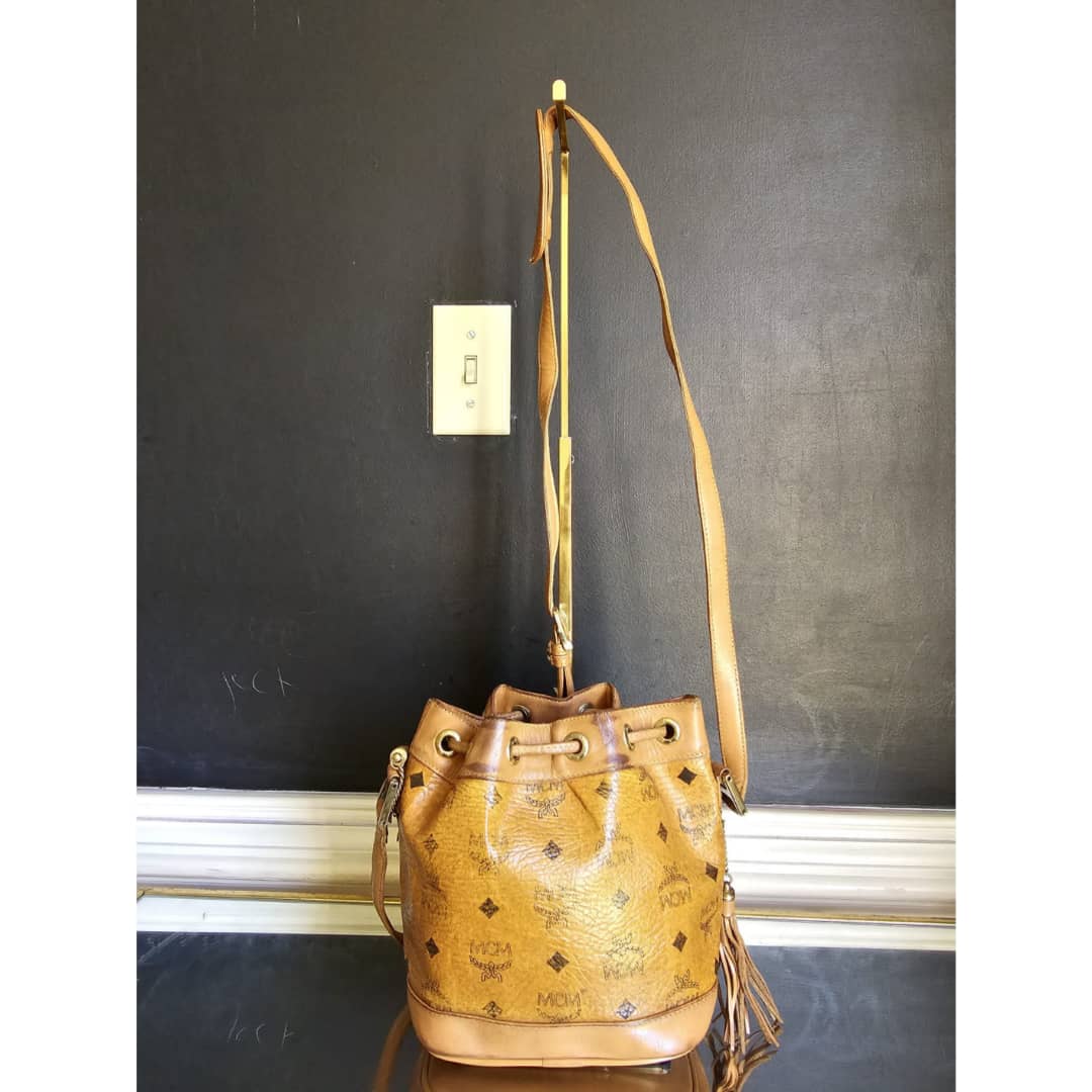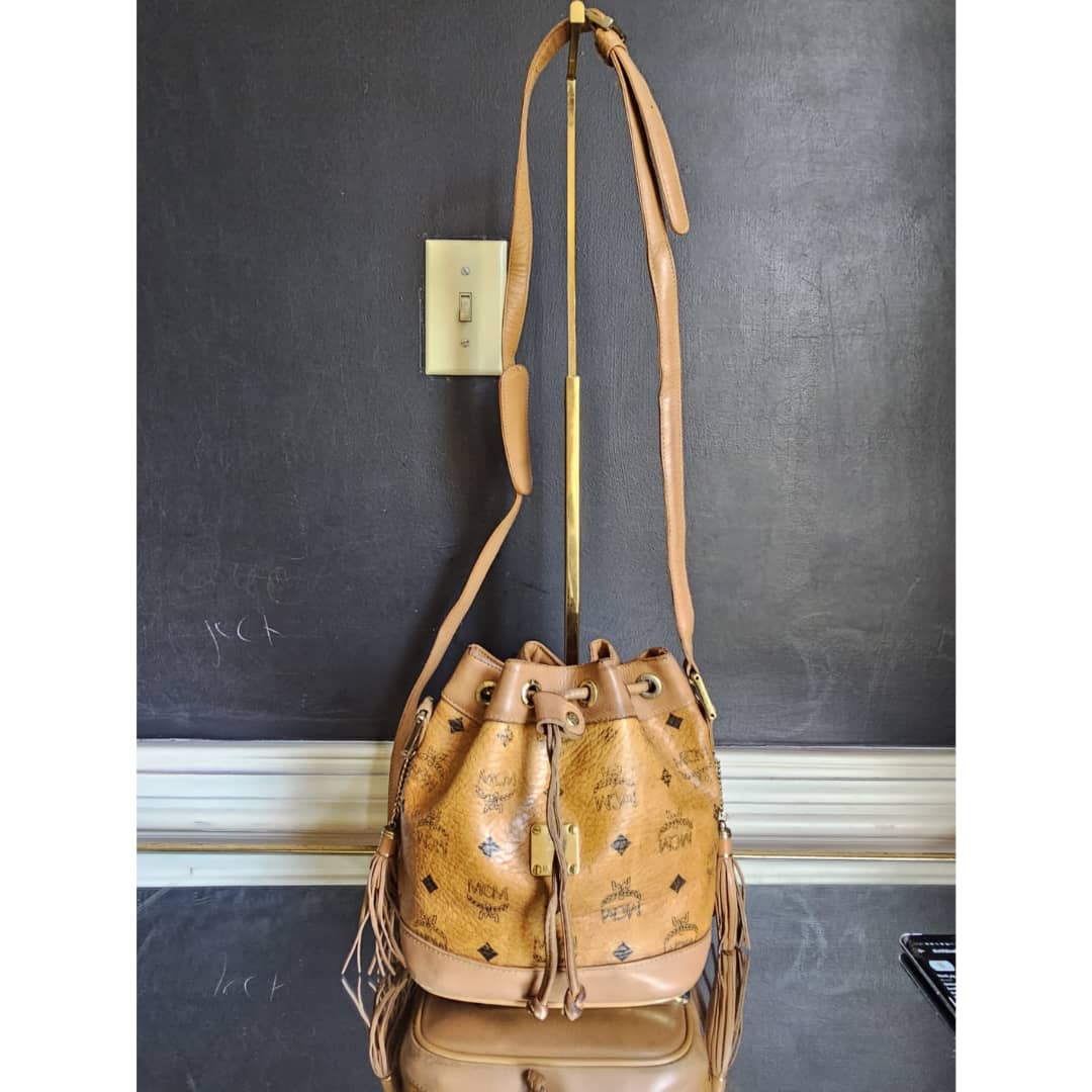 This authentic MCM Brown Visetos Leather Drawstring Bucket Bag is in it’s good pre-owned condition. The exterior leather is clean and beautiful. The MCM logo on the exterior canvas is slightly faded. The base edges shows little scuffing and scratches. The overall trim which includes the drawstring, the long strap and the base edges shows rubbing and scratches. Interior is clean.
