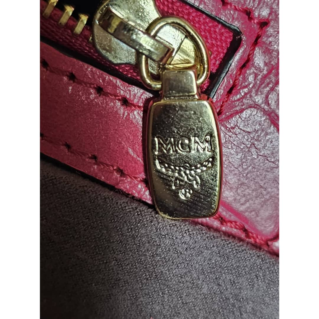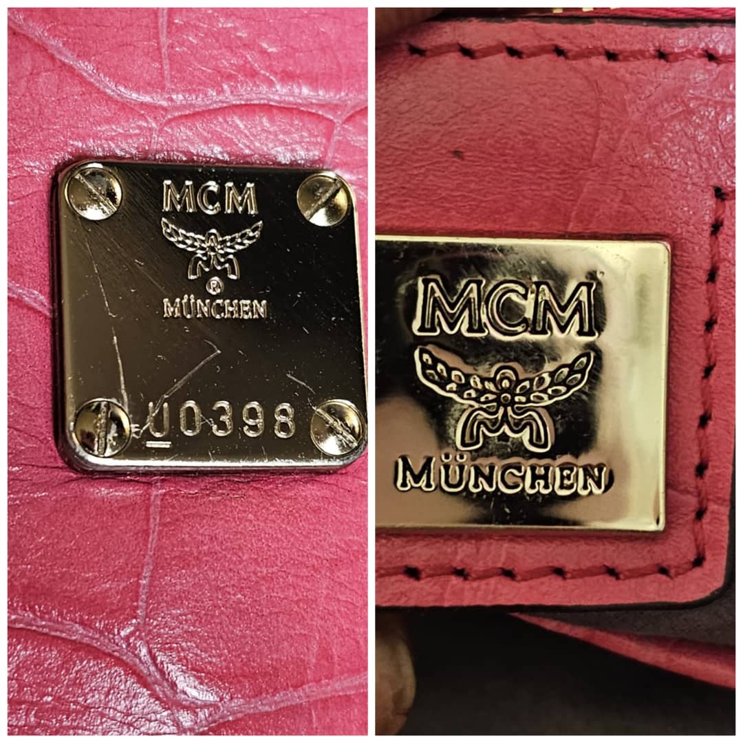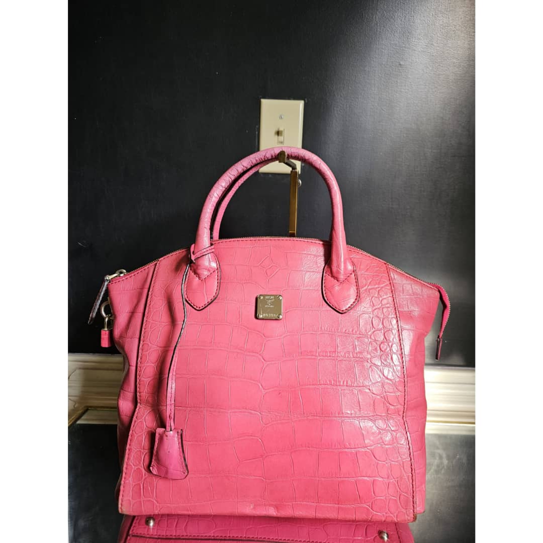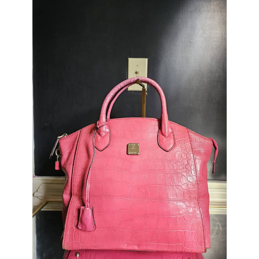 This authentic MCM Calfskin Crocodile Embossed Tote Pink is in it’s good pre-owned condition. The exterior leather is clean and beautiful. Base edges shows some scratches, handle shows rubbing. Interior is clean. Comes with a key and padlock. No long strap.