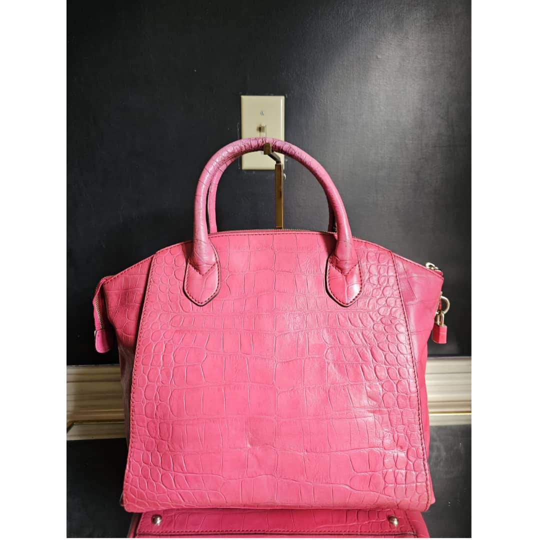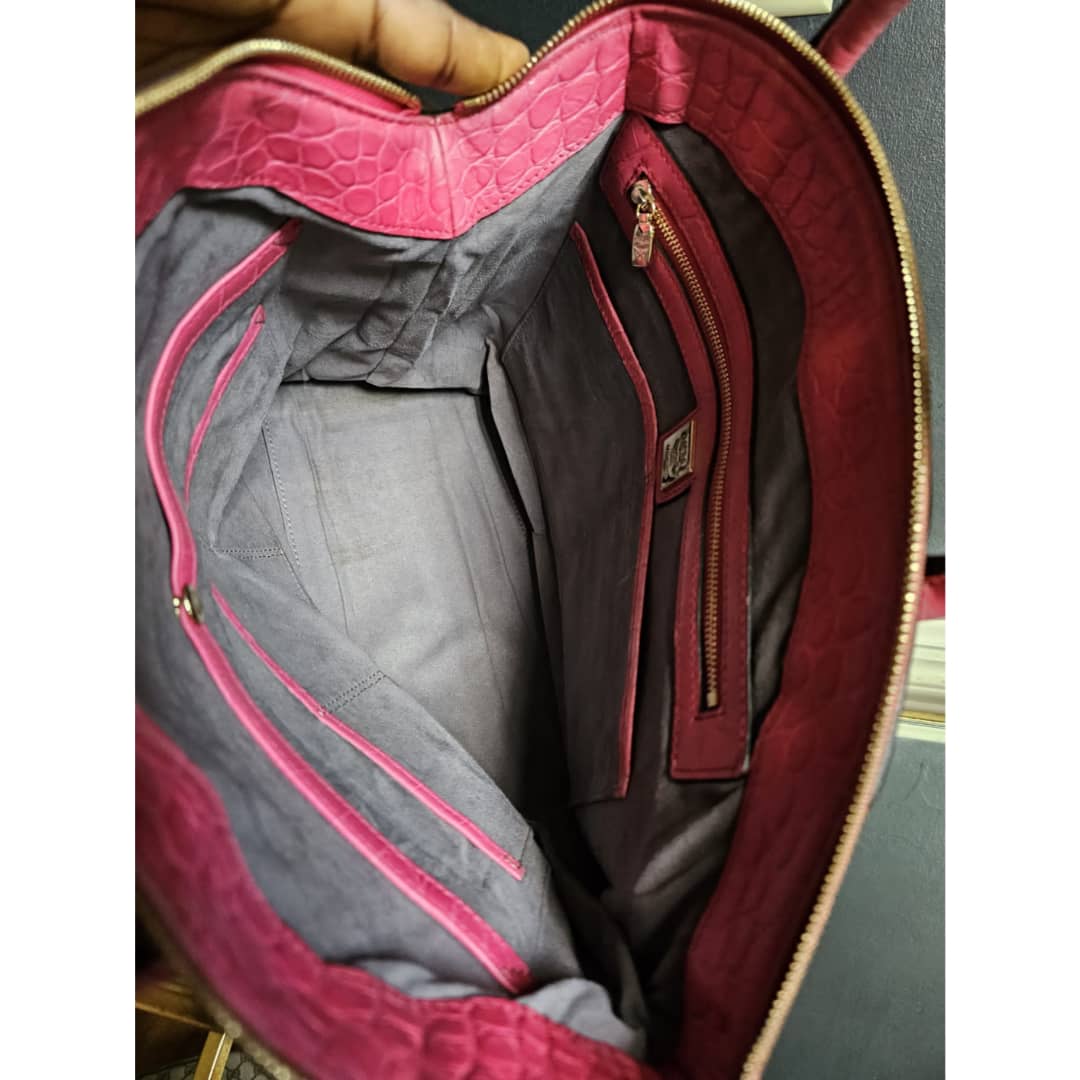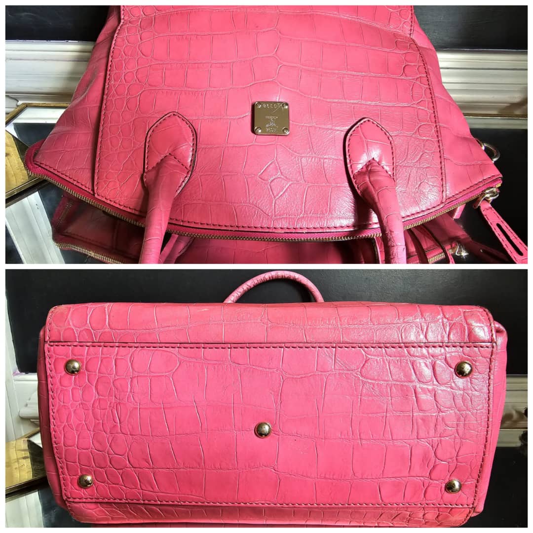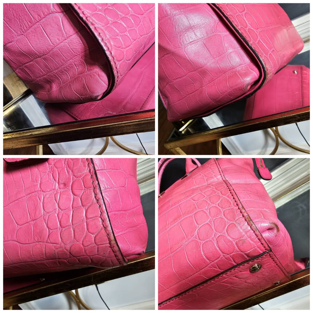 This authentic MCM Calfskin Crocodile Embossed Tote Pink is in it’s good pre-owned condition. The exterior leather is clean and beautiful. Base edges shows some scratches, handle shows rubbing. Interior is clean. Comes with a key and padlock. No long strap.