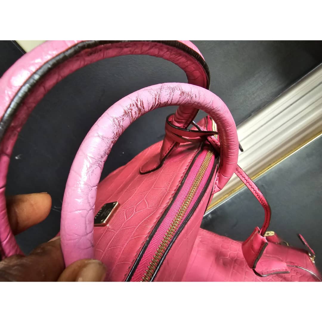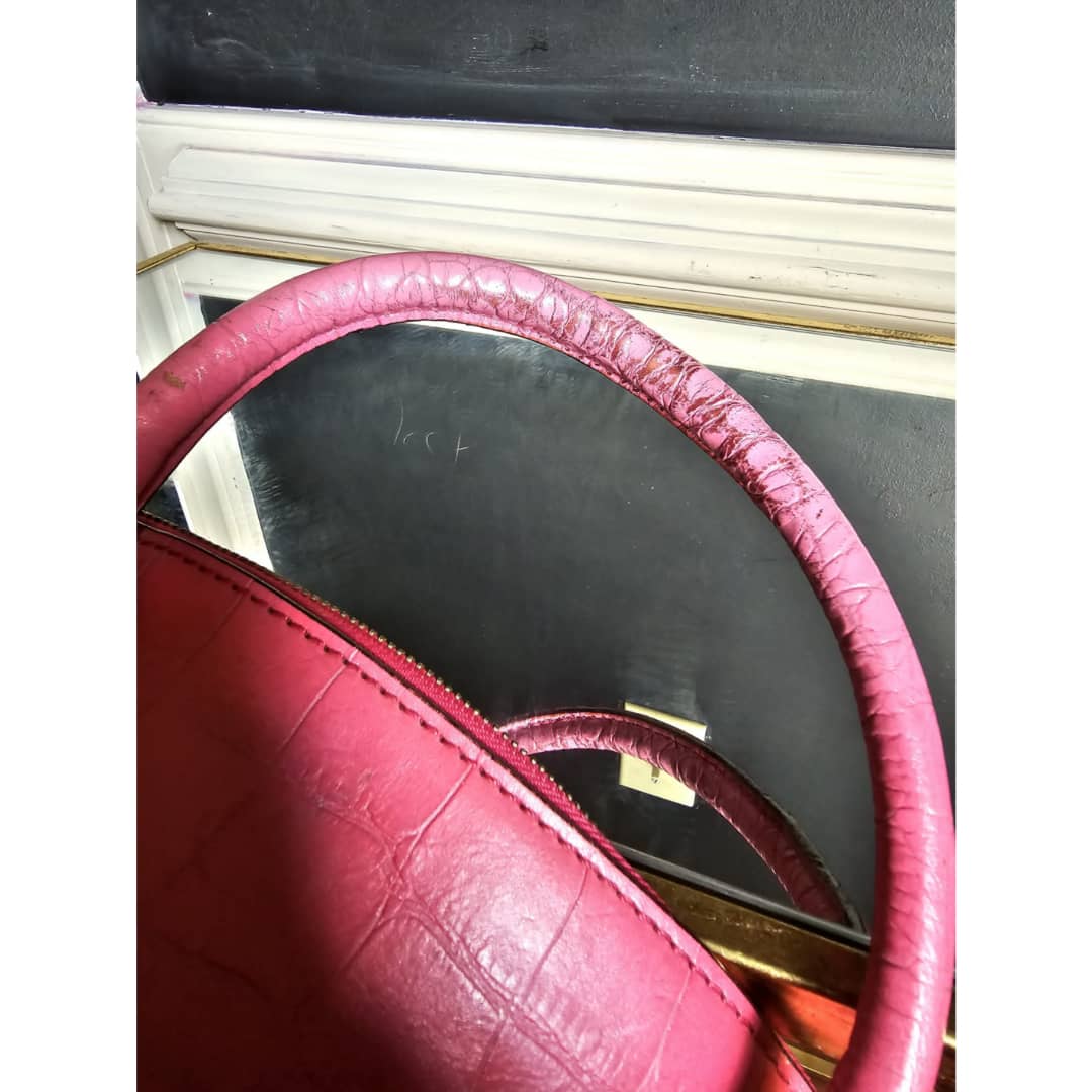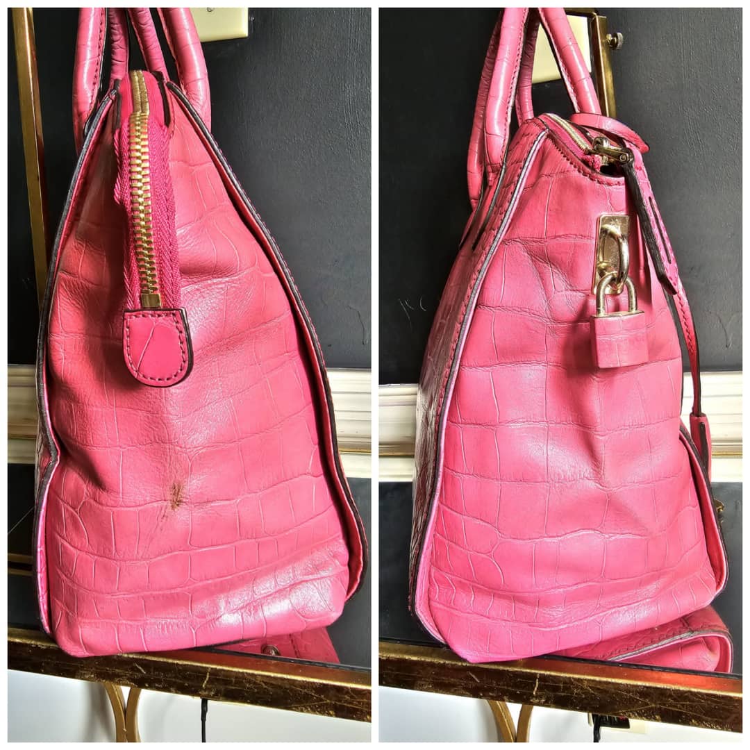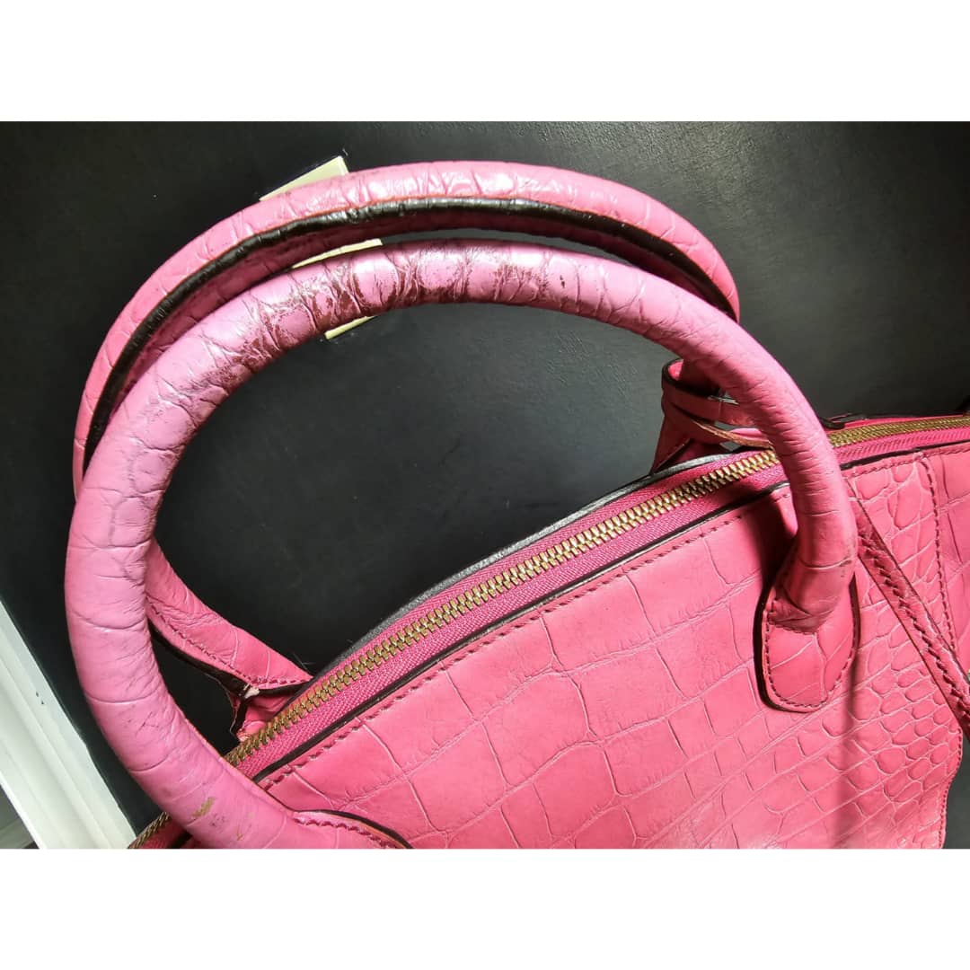 This authentic MCM Calfskin Crocodile Embossed Tote Pink is in it’s good pre-owned condition. The exterior leather is clean and beautiful. Base edges shows some scratches, handle shows rubbing. Interior is clean. Comes with a key and padlock. No long strap.