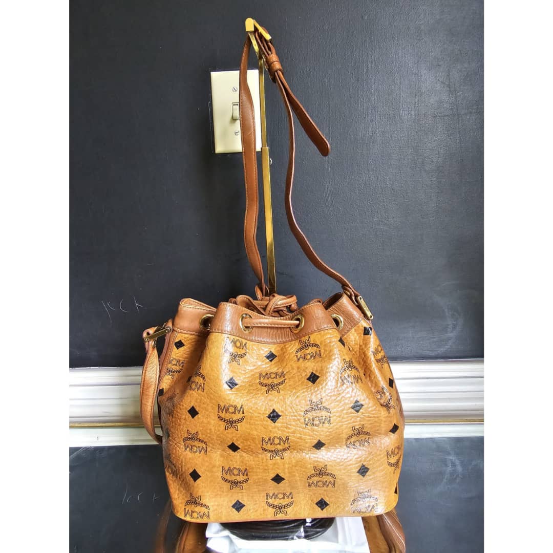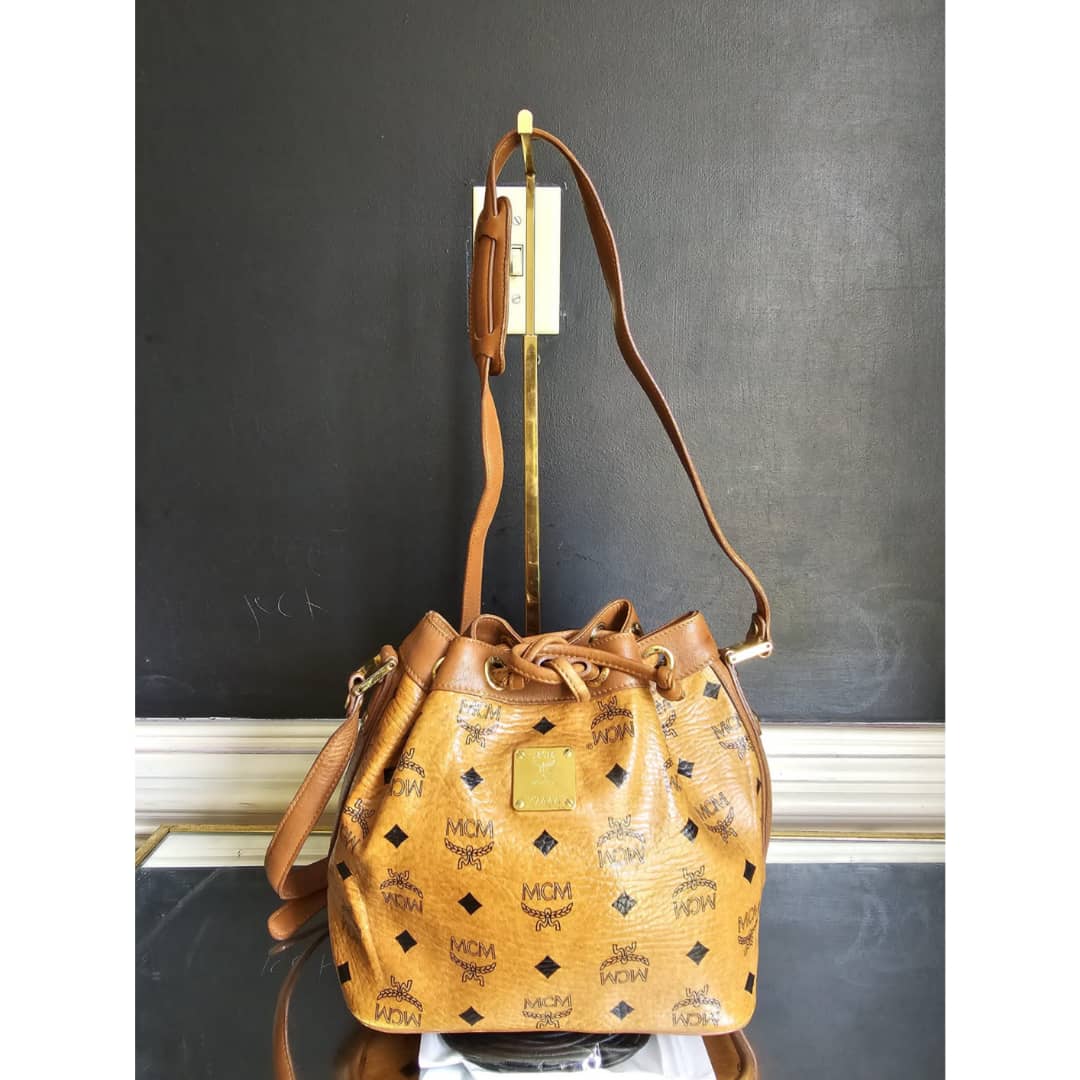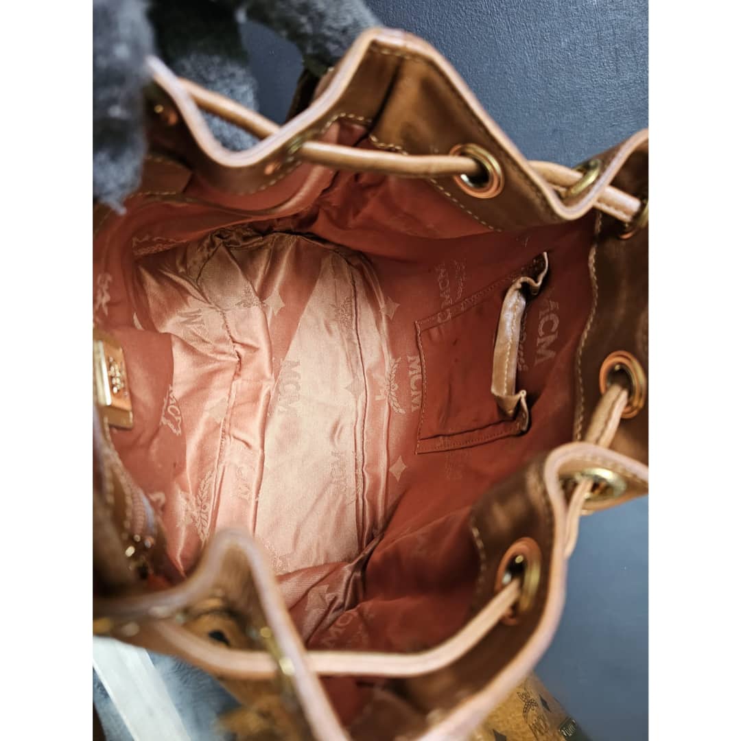 This authentic MCM Cognac Visetos Coated Canvas Heritage Drawstring Bag is in it’s good pre-owned condition. The exterior canvas is clean and beautiful. Interior is clean. Gold hardware. Can be worn as a shoulder/crossbody bag.