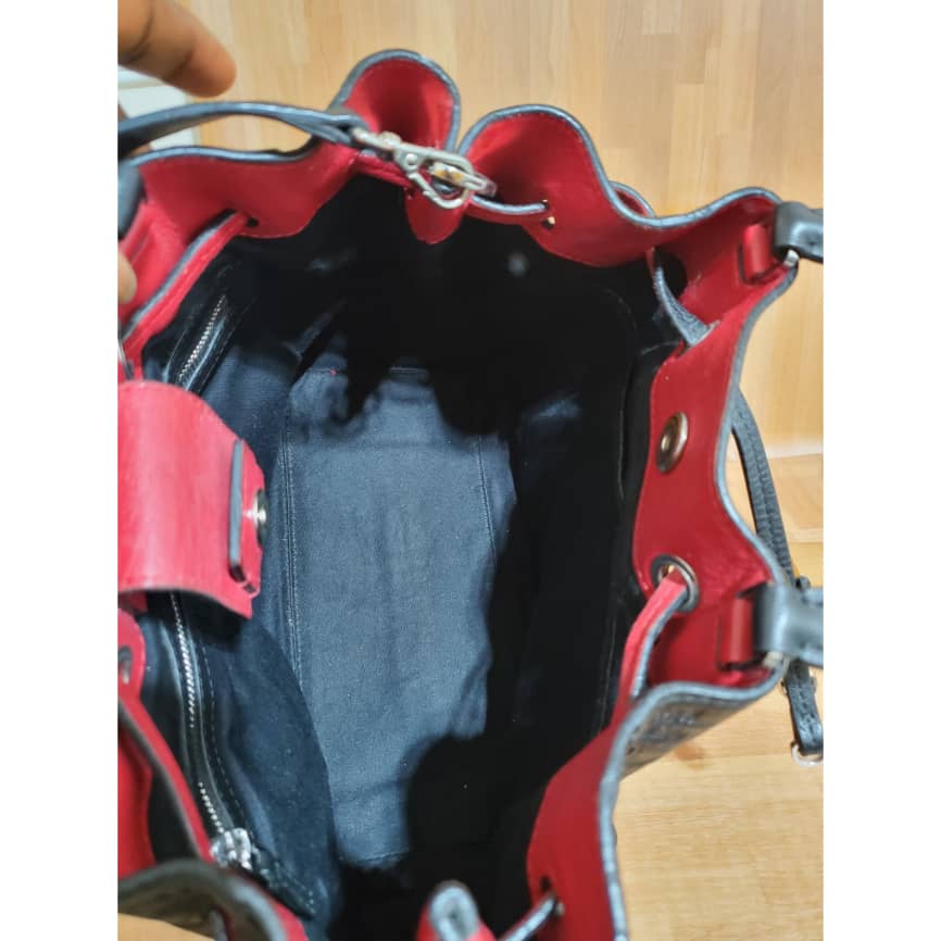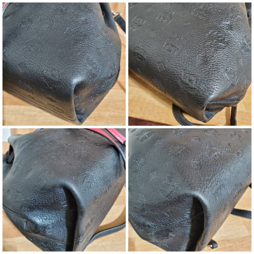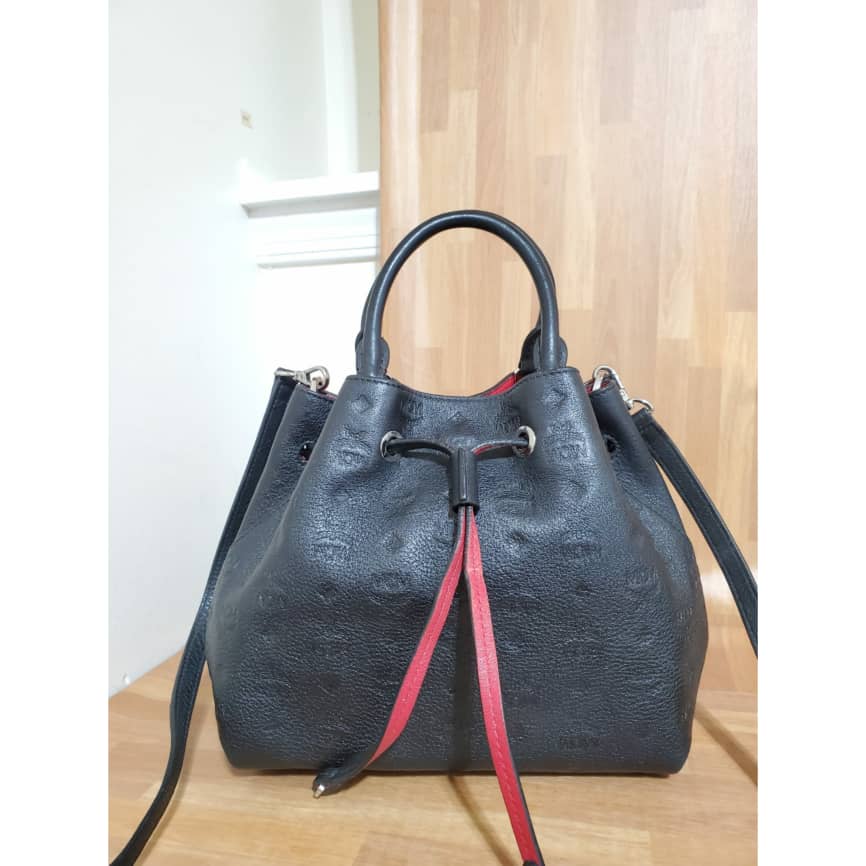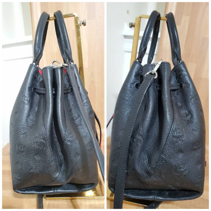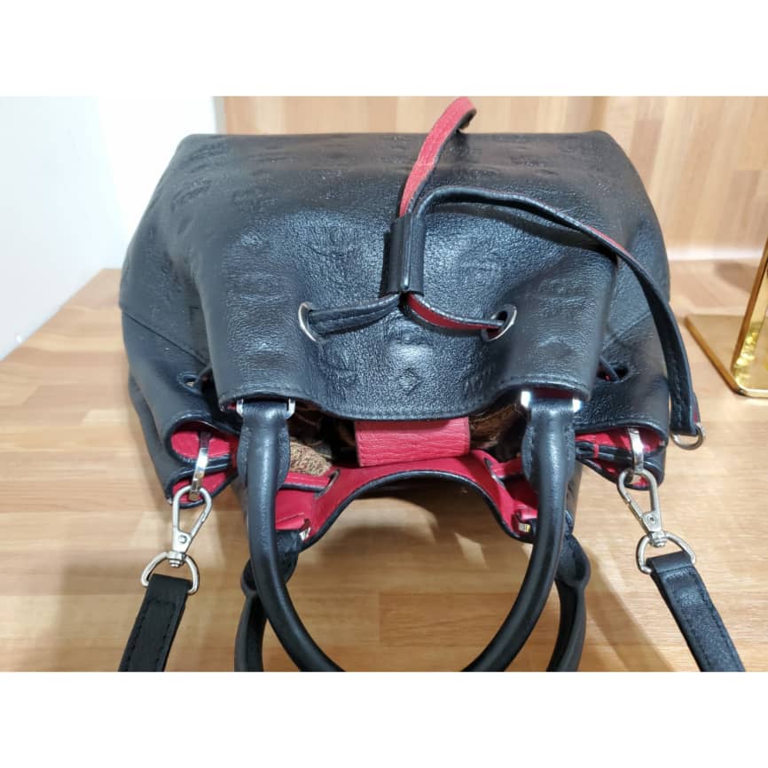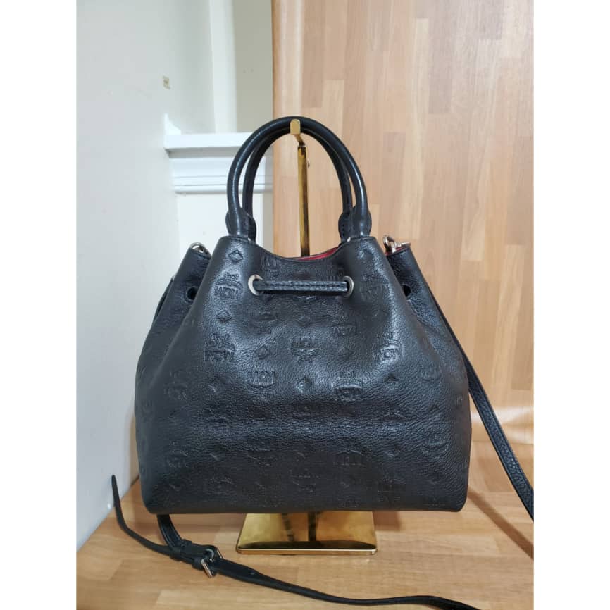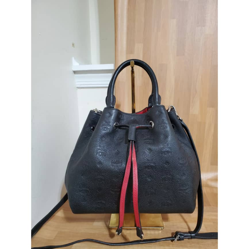 This authentic MCM Essential Drawstring Monogram Leather Shoulder Bag Black is in it’s pre-owned good condition, has sign of use. The exterior leather is clean and beautiful. The interior is clean.. good condition.