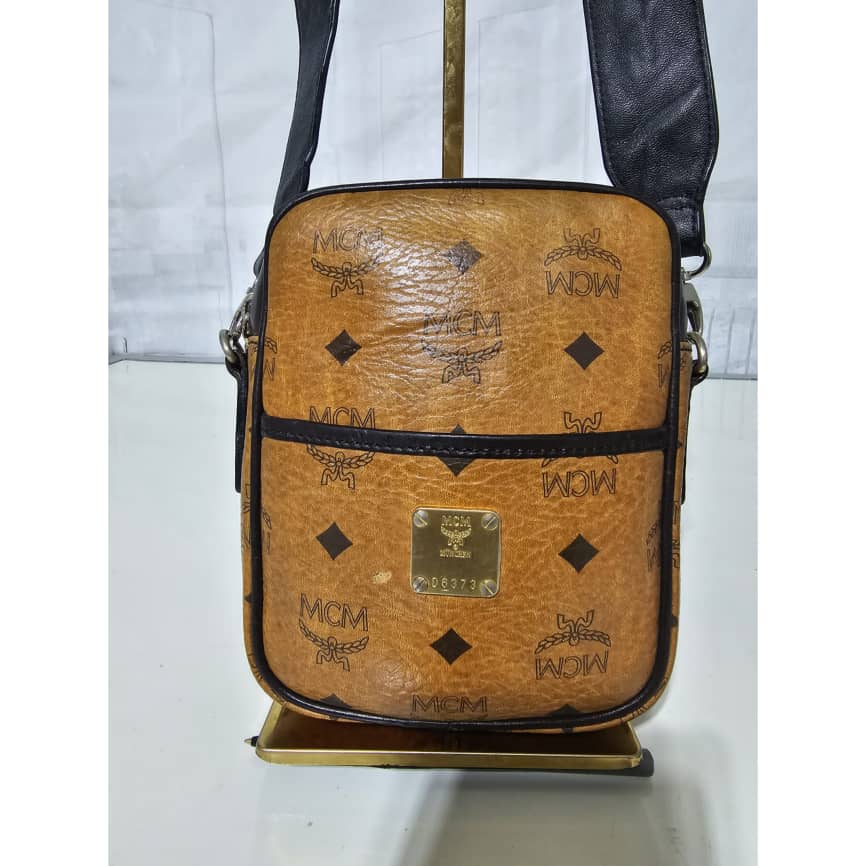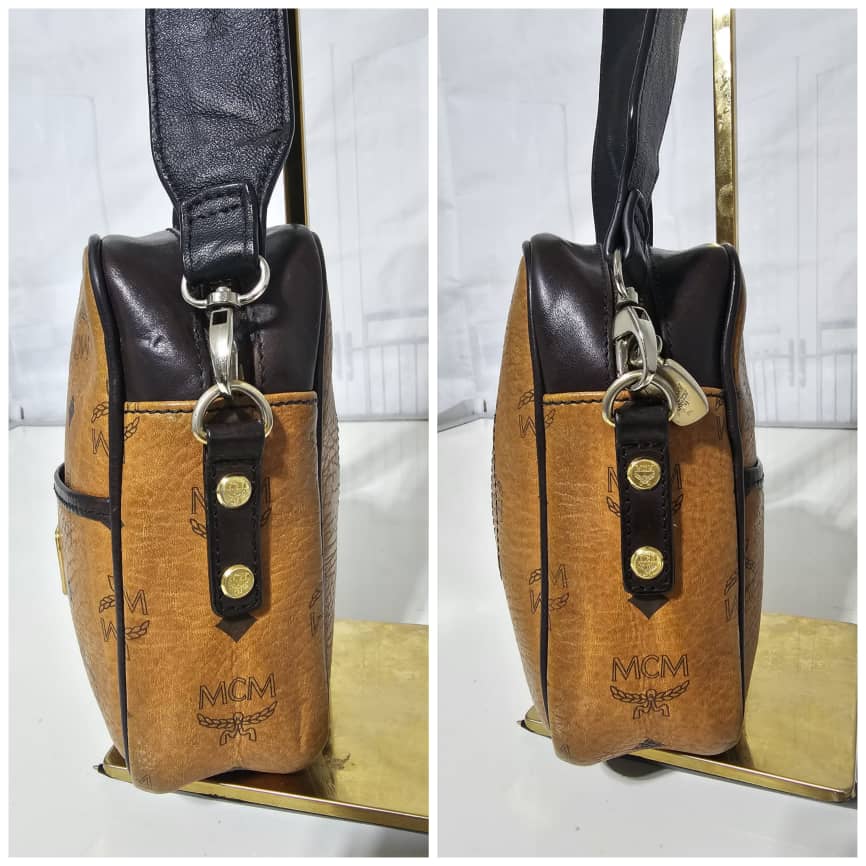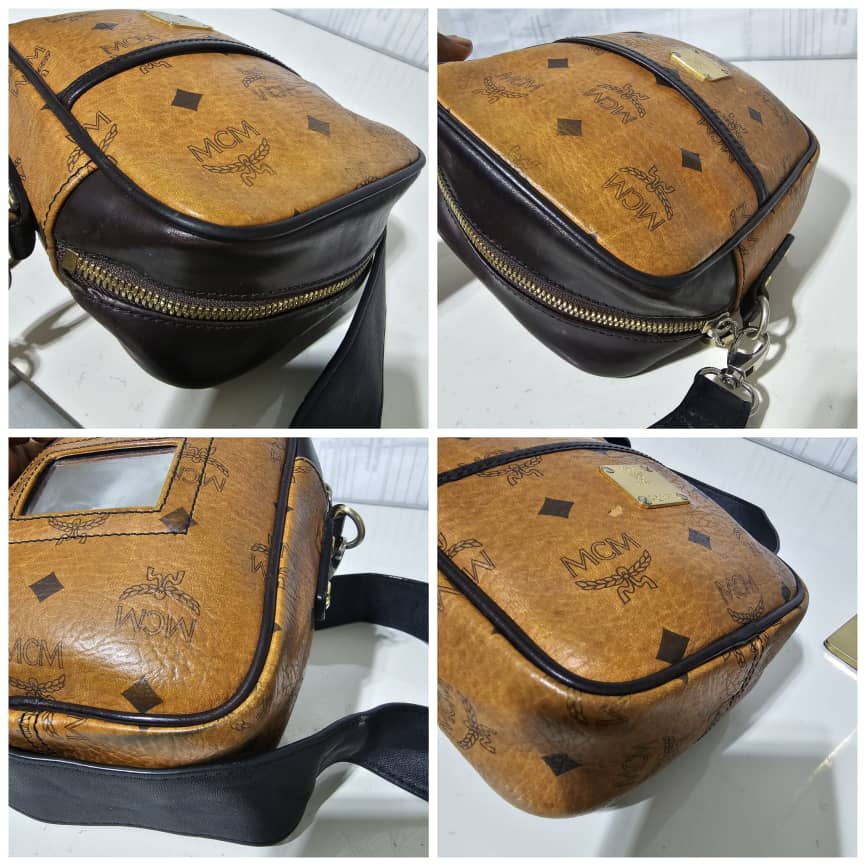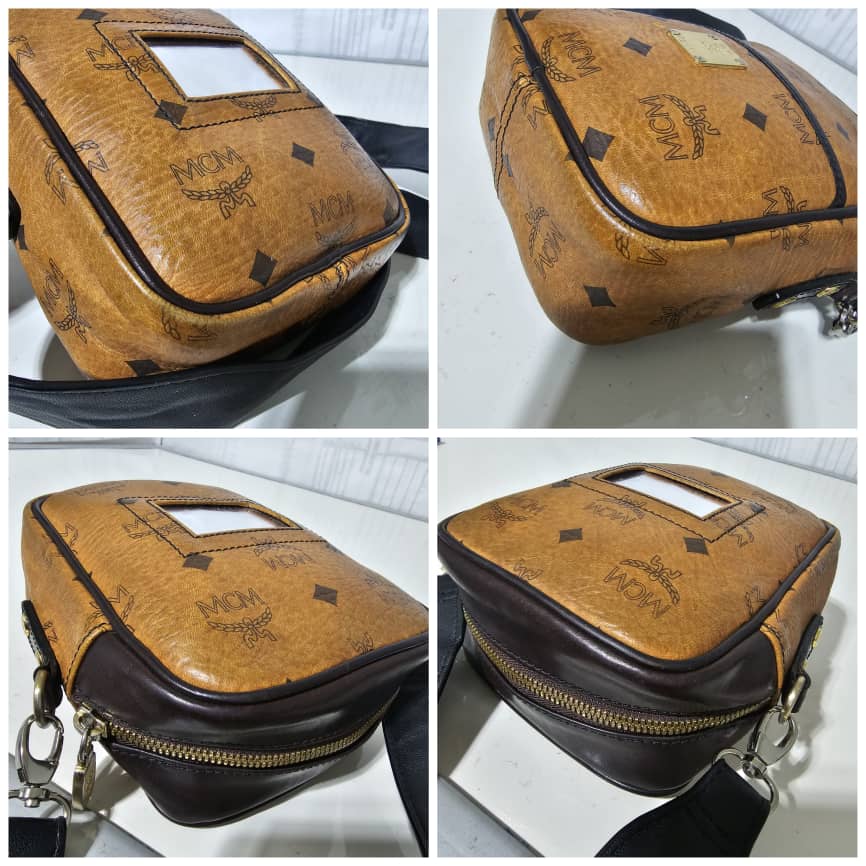 This authentic MCM KL Mini Visetos Monogram Canvas Crossbody Bag Cognac is in it’s good pre-owned condition. The exterior canvas is clean and beautiful. Interior is clean. Gold hardware. It has a deep brown trim leather, black shoulder strap which was replaced.