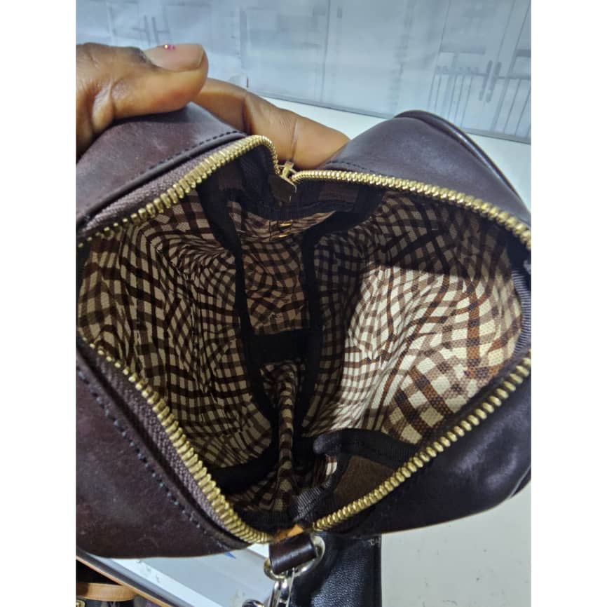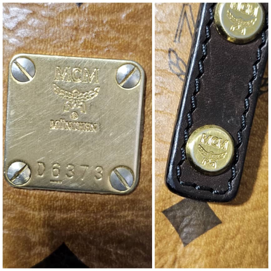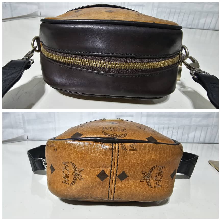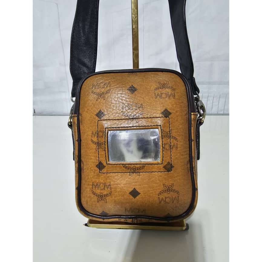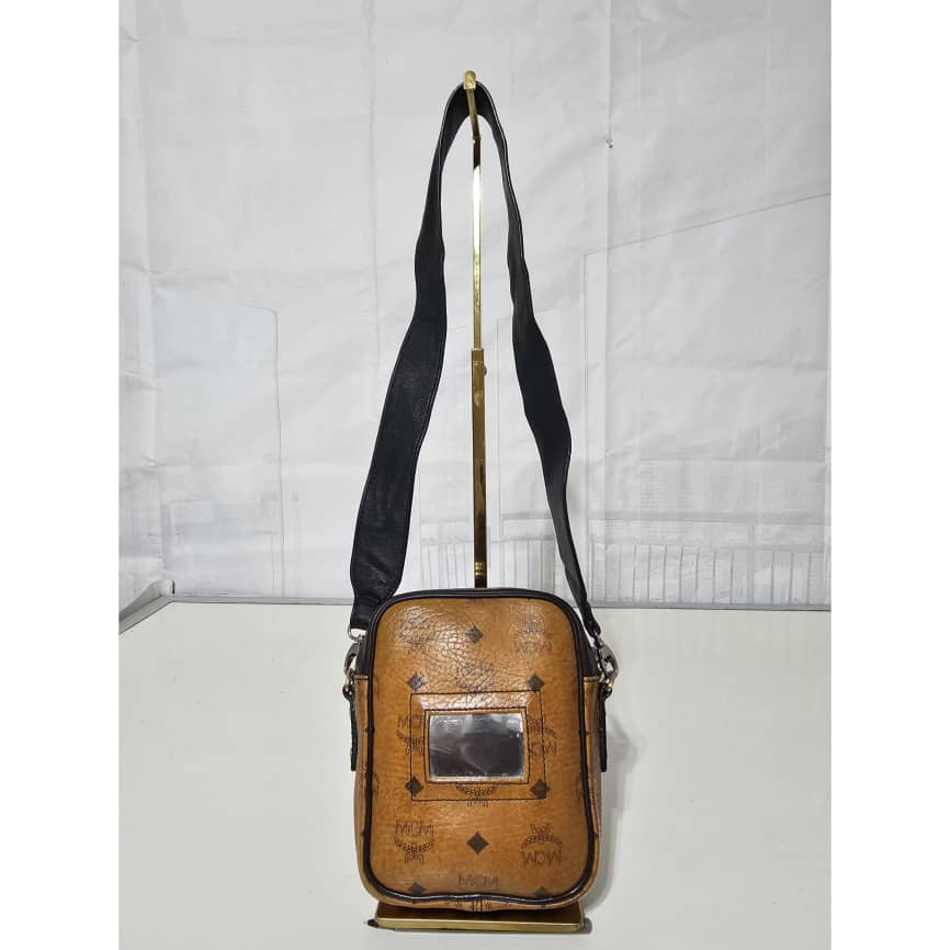 This authentic MCM KL Mini Visetos Monogram Canvas Crossbody Bag Cognac is in it’s good pre-owned condition. The exterior canvas is clean and beautiful. Interior is clean. Gold hardware. It has a deep brown trim leather, black shoulder strap which was replaced.