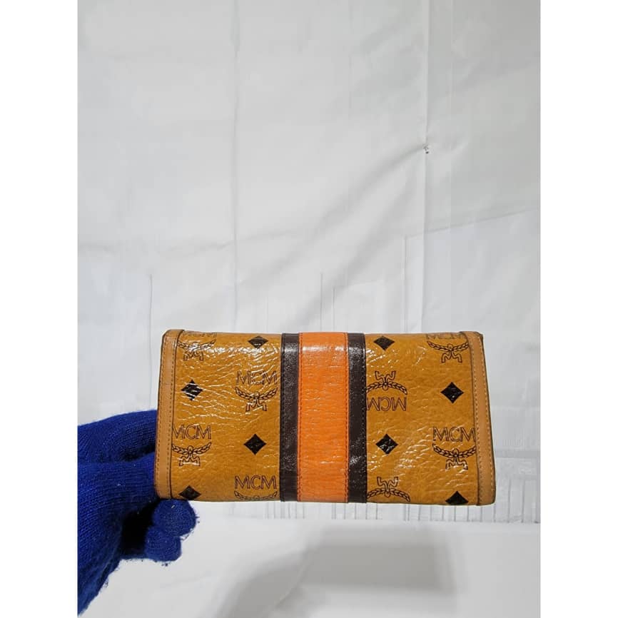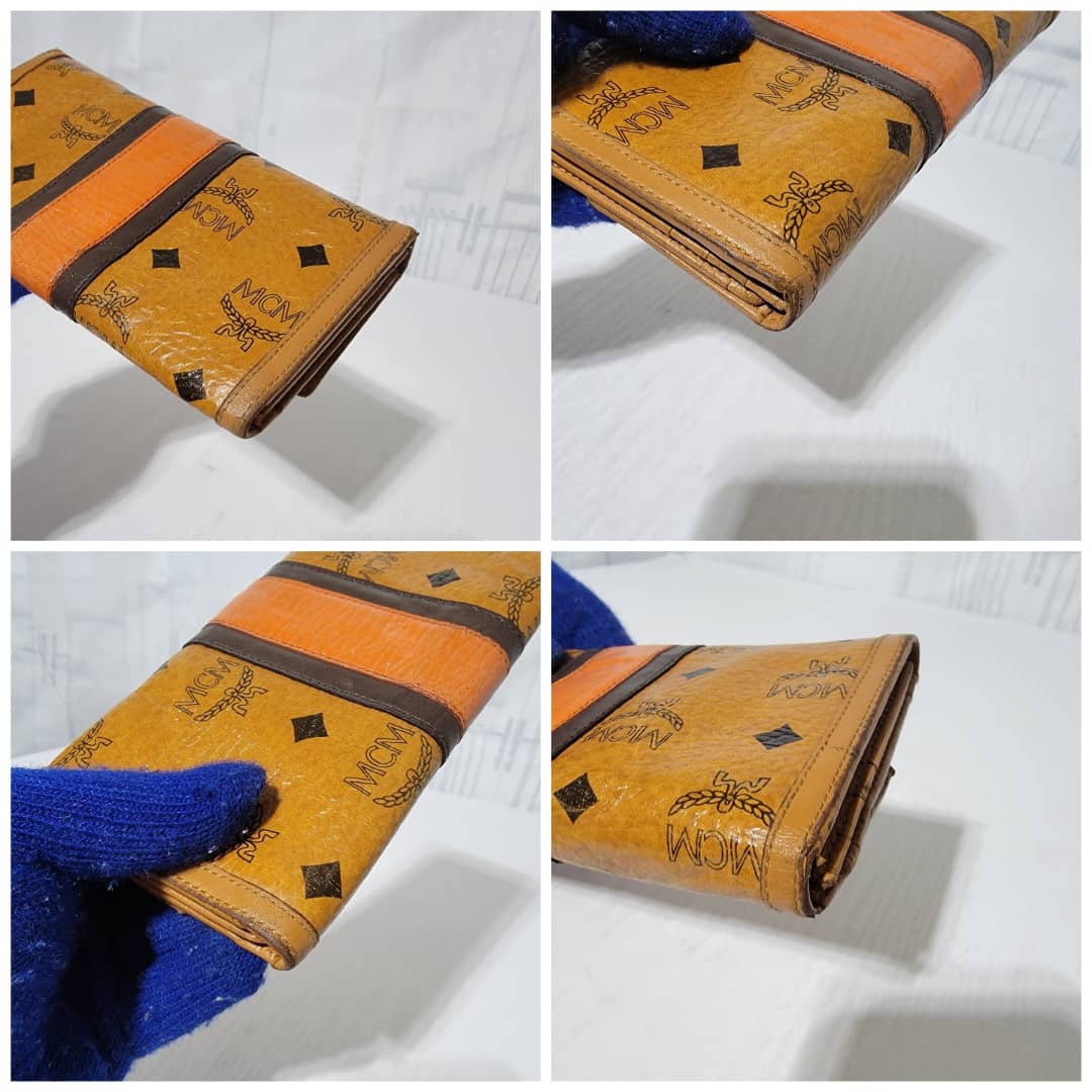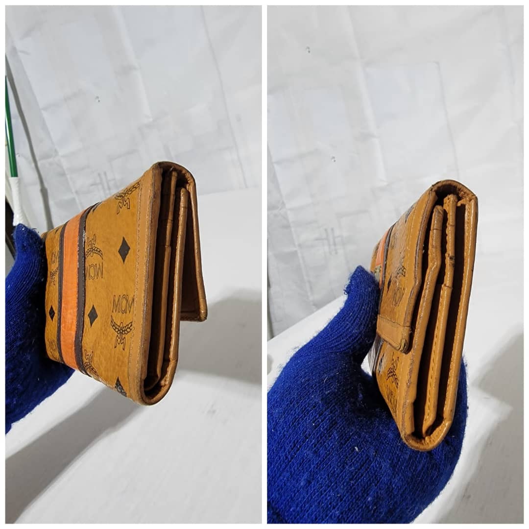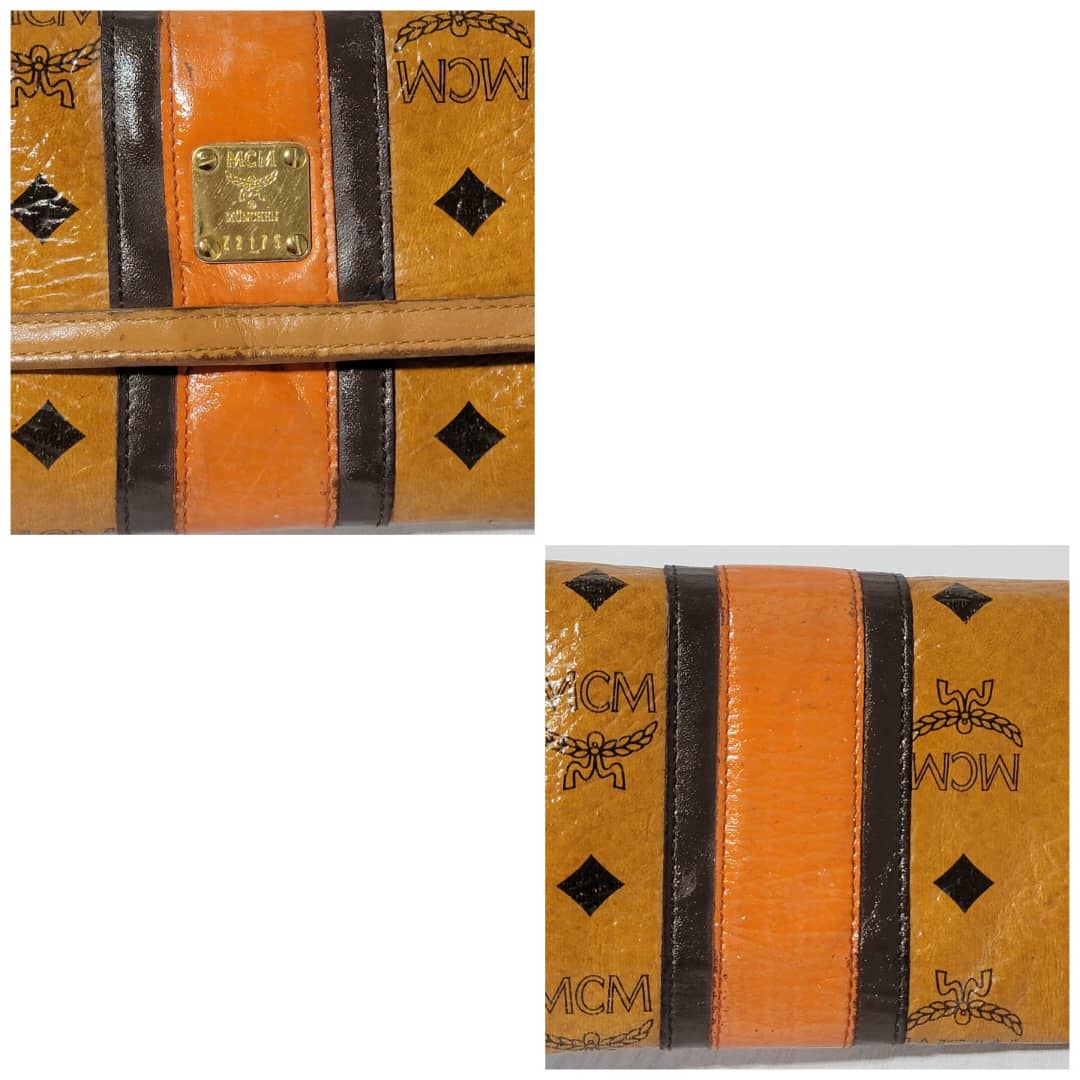 This authentic MCM Multicolor Visetos Coated canvas and leather Trifold wallet is in it’s good pre-owned condition. The exterior and interior is clean. The edges shows rubbing and scratches also the orange leather trim that runs as the strip in between the wallet shows a sign of rubbing and fade to the leather.