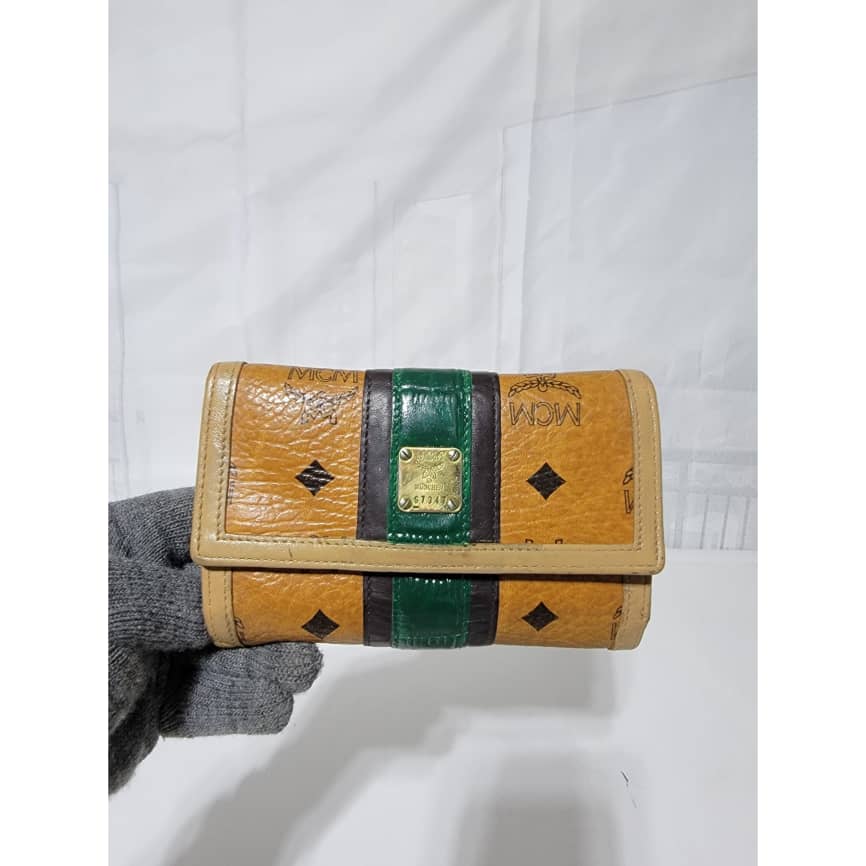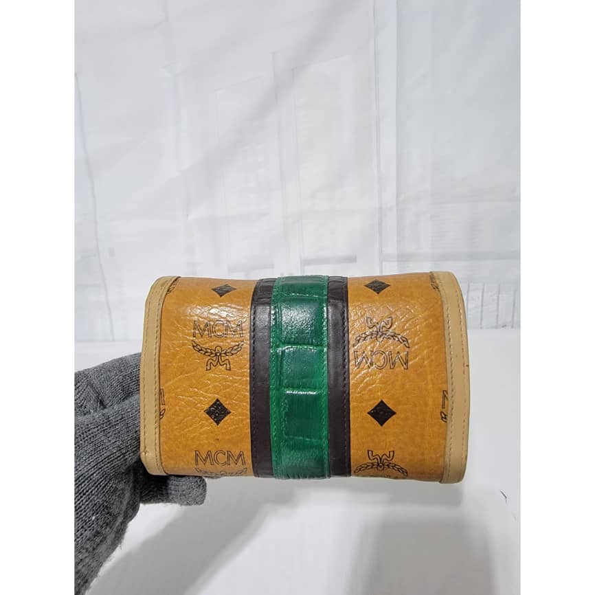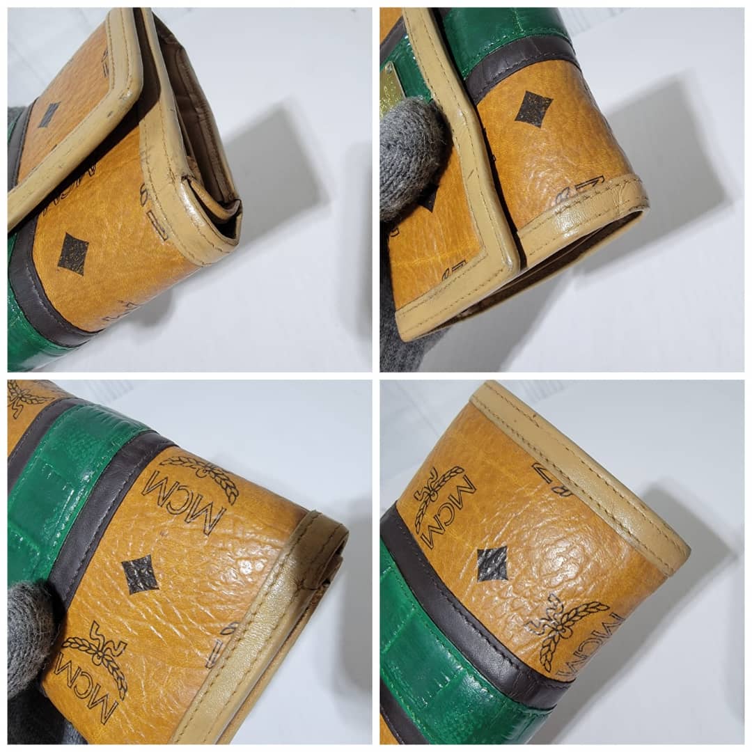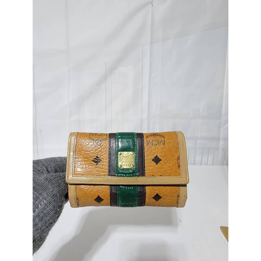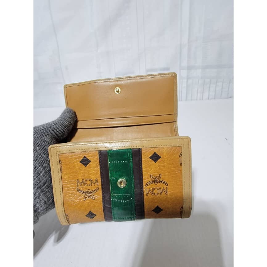 This authentic MCM Small Trifold Wallet Green/Brown is in it’s pre-owned condition. The exterior cognac print is clean and beautiful. The interior is clean. Kindly note that the green trim that runs across the wallet, the color was retouched. Gold hardware. The edges shows some rubbing (Kindly look at pictures above).