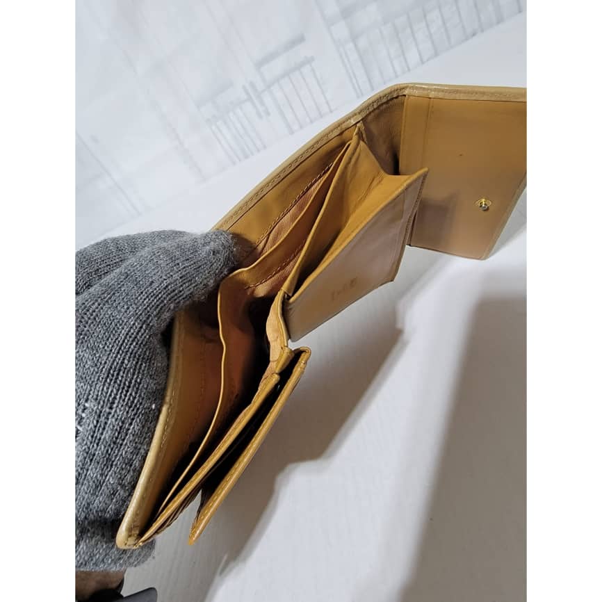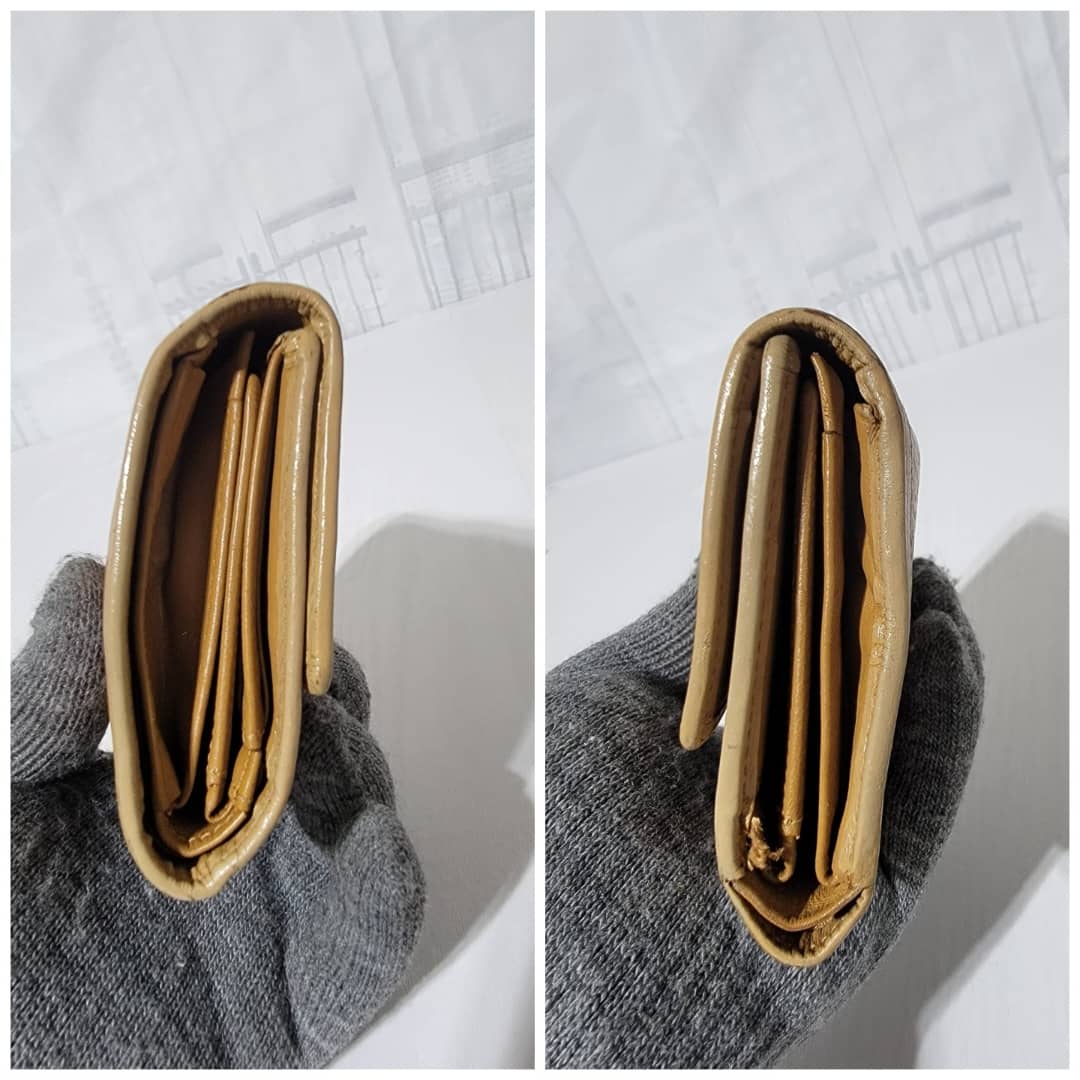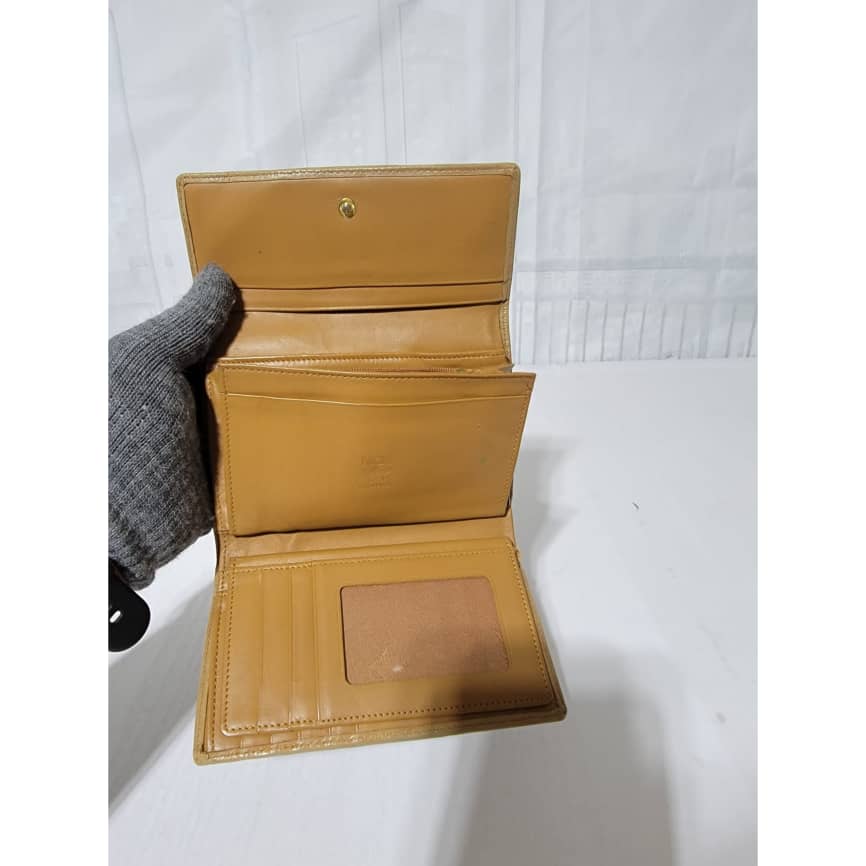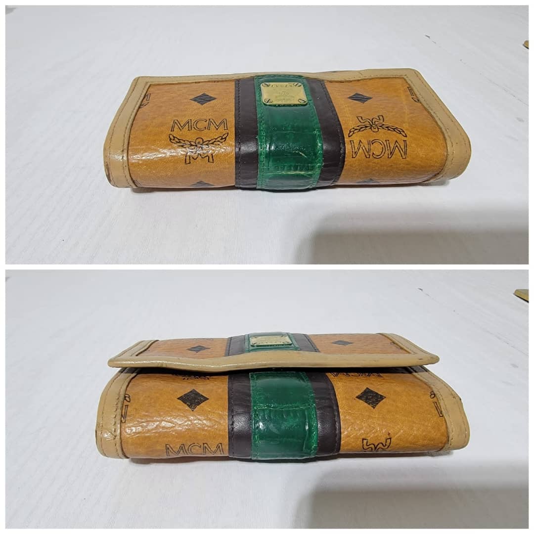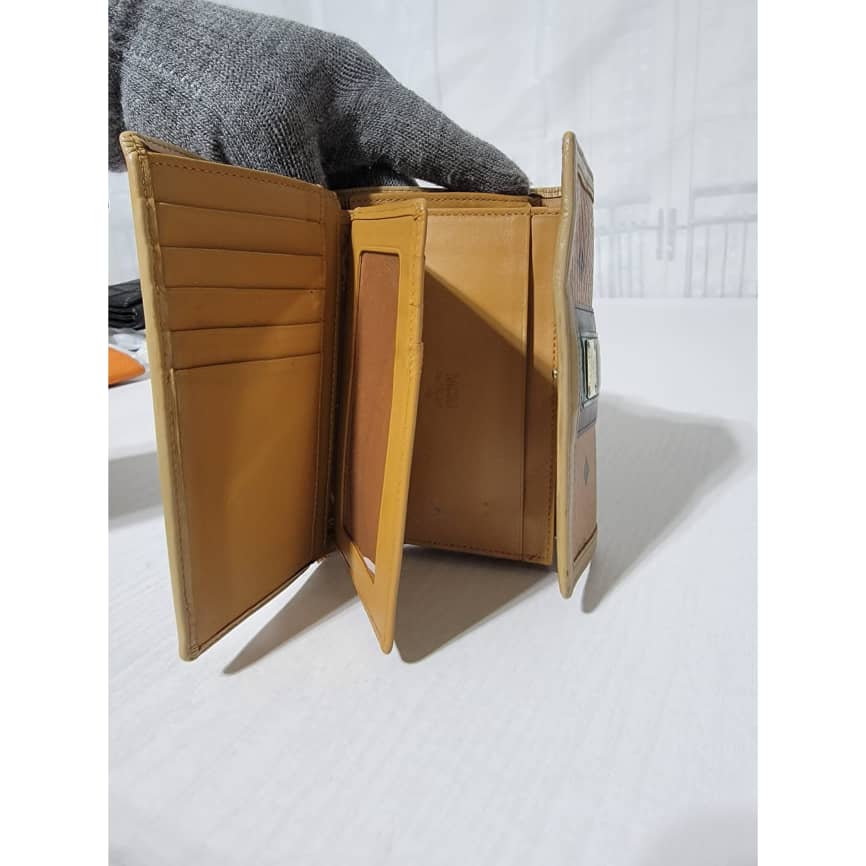 This authentic MCM Small Trifold Wallet Green/Brown is in it’s pre-owned condition. The exterior cognac print is clean and beautiful. The interior is clean. Kindly note that the green trim that runs across the wallet, the color was retouched. Gold hardware. The edges shows some rubbing (Kindly look at pictures above).