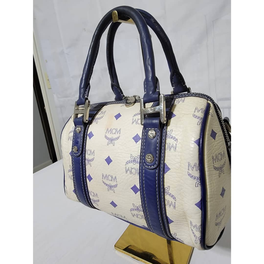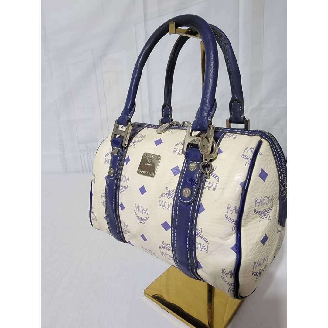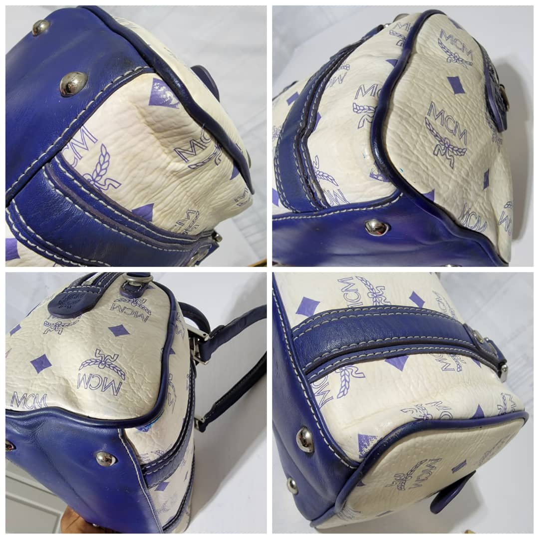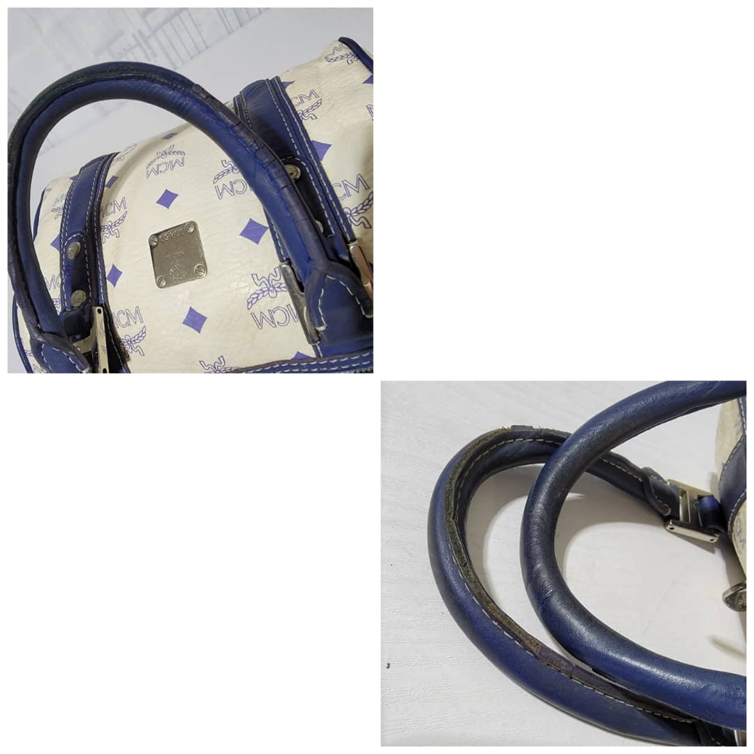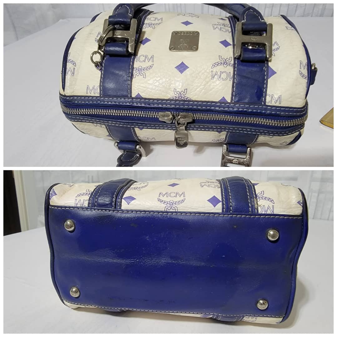 This authentic MCM Small Visetos Coated Canvas and Leather Boston Bag White/Blue is in it’s good pre-owned condition. The exterior coated canvas is clean and beautiful, it shows little dirt wear on it. Interior is clean. The blue leather trim that runs across the bag shows little sign of scratches and scuffing on the base edges. The handles shows some soiling and sign of wear (Kindly look at pictures above). Silver hardware.