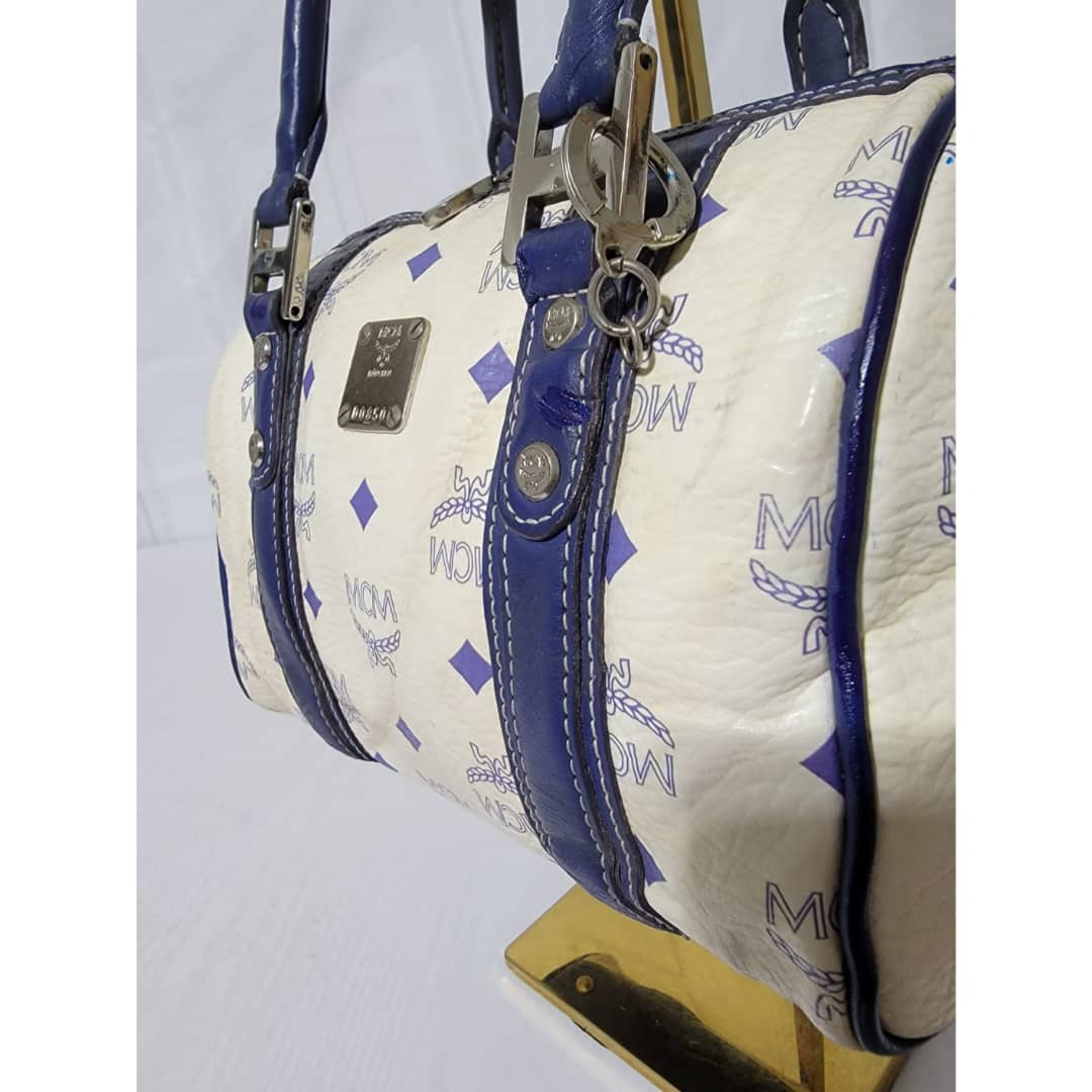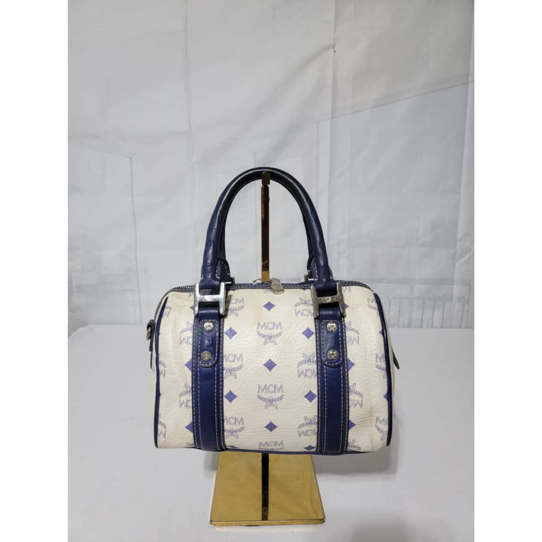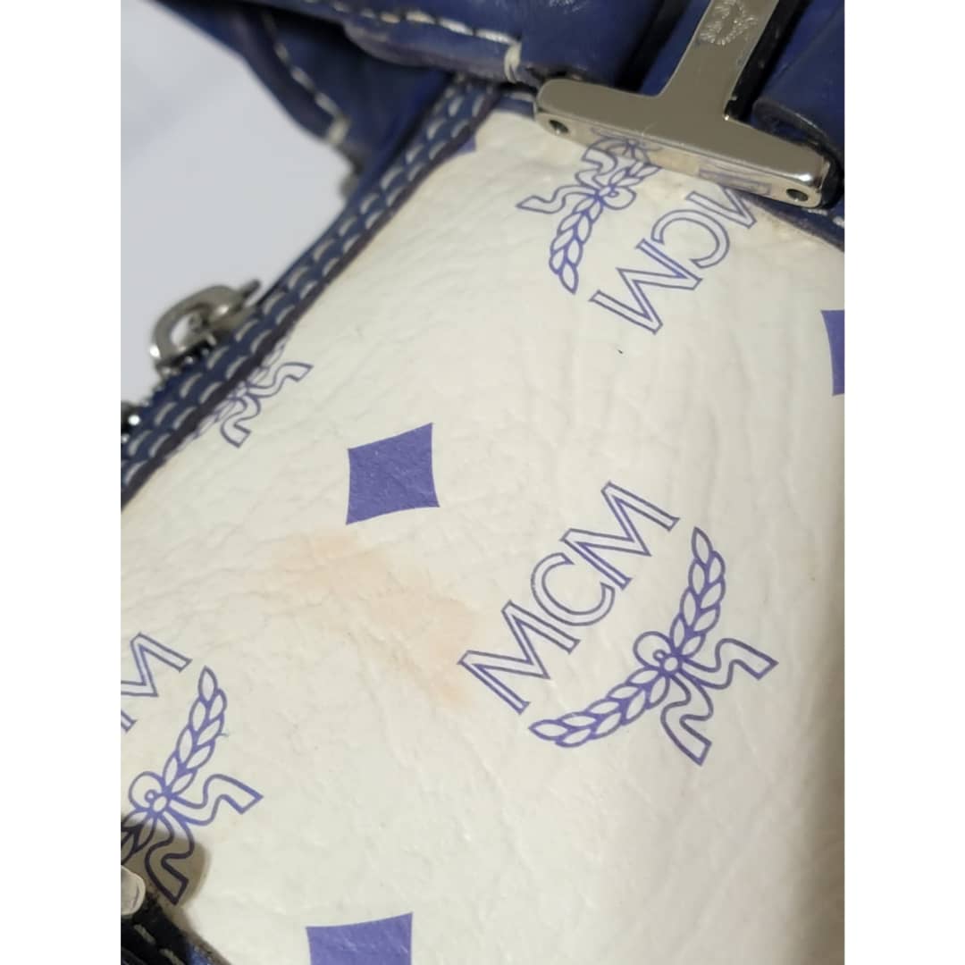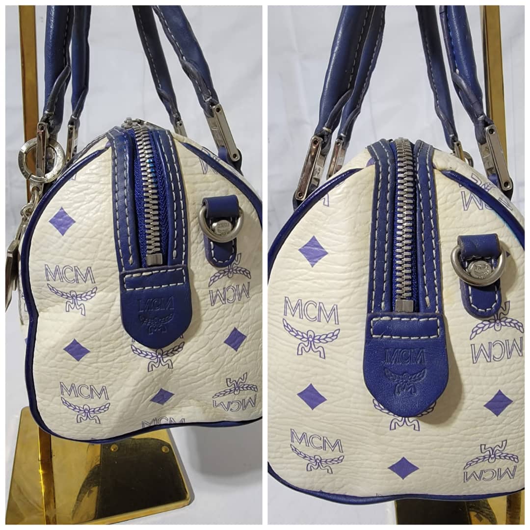 This authentic MCM Small Visetos Coated Canvas and Leather Boston Bag White/Blue is in it’s good pre-owned condition. The exterior coated canvas is clean and beautiful, it shows little dirt wear on it. Interior is clean. The blue leather trim that runs across the bag shows little sign of scratches and scuffing on the base edges. The handles shows some soiling and sign of wear (Kindly look at pictures above). Silver hardware.