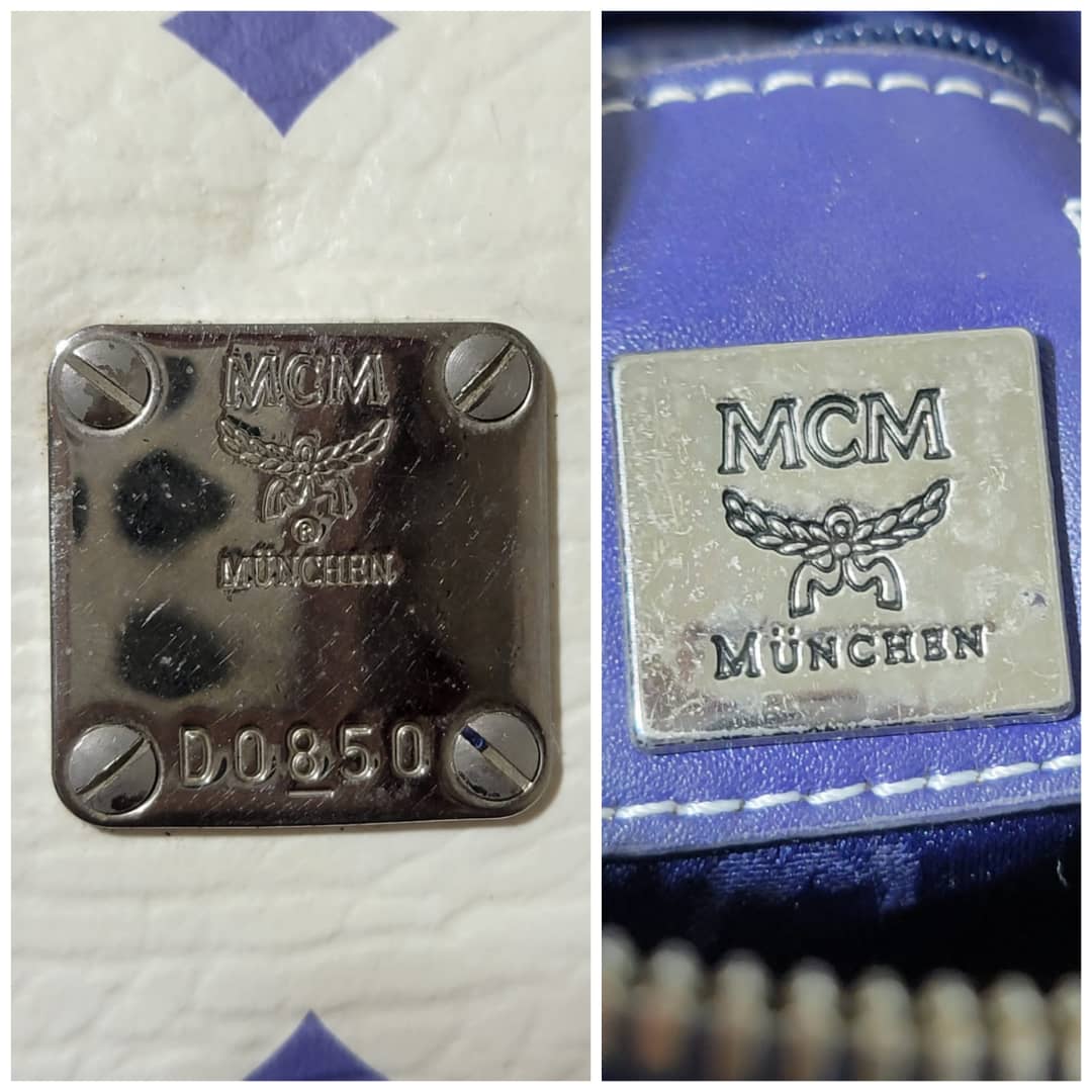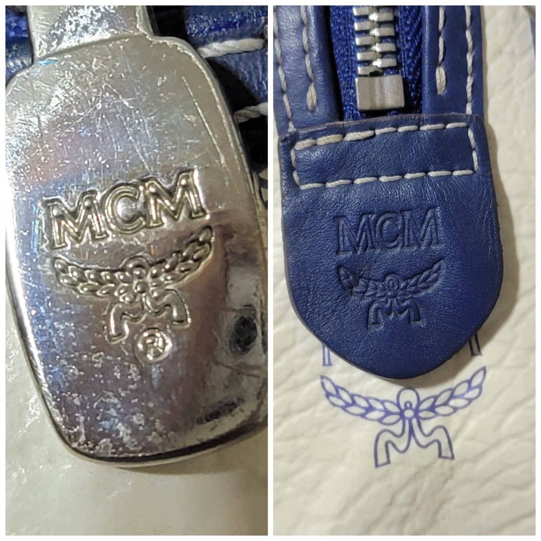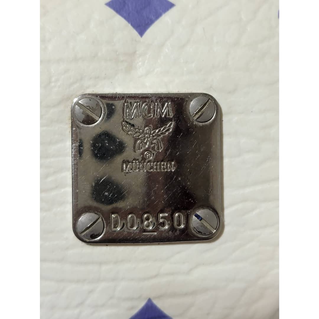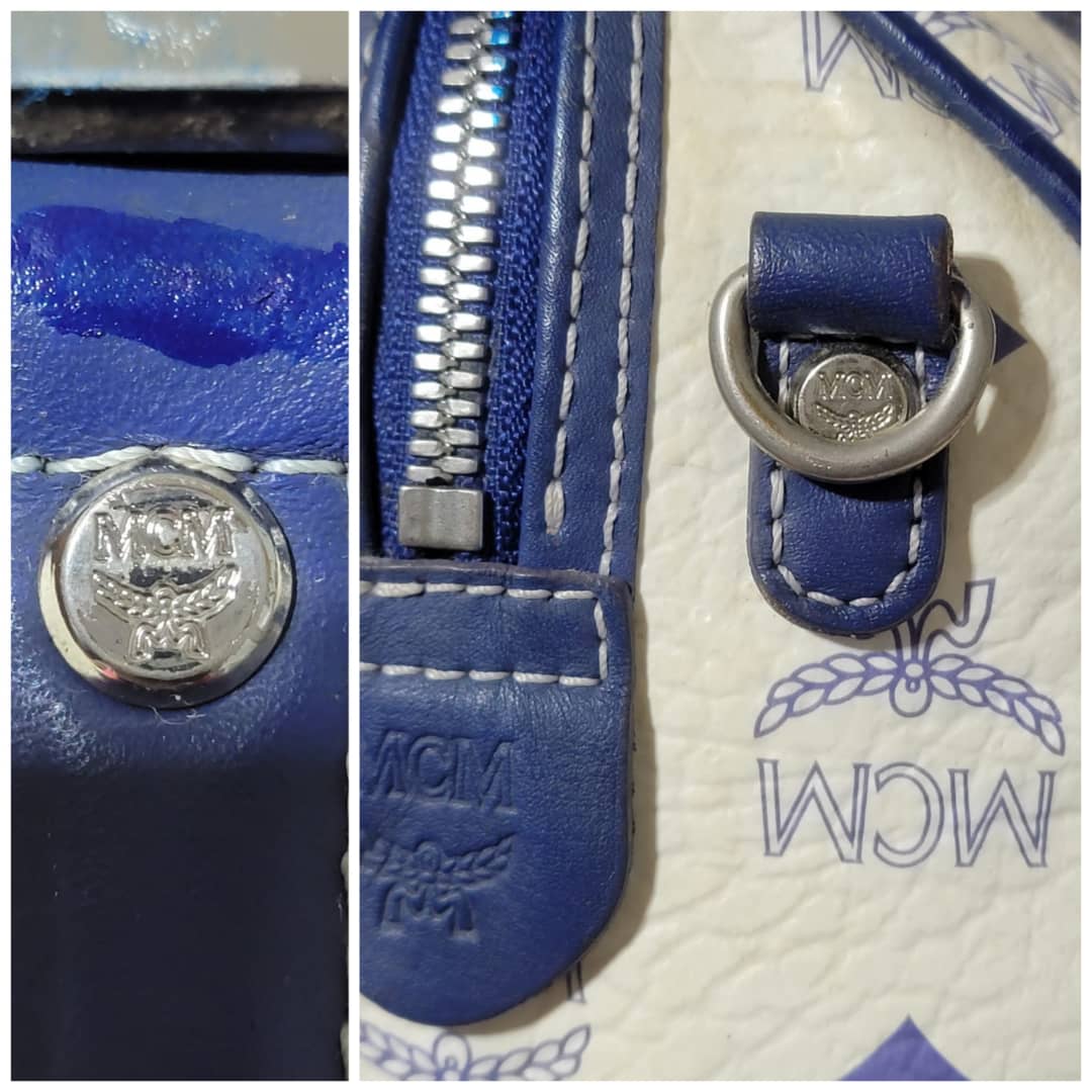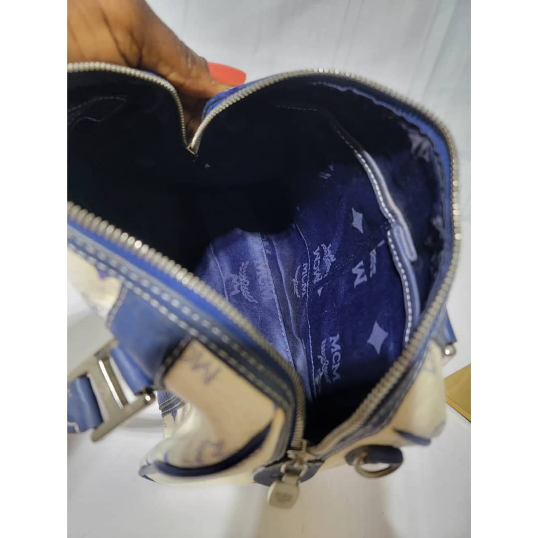 This authentic MCM Small Visetos Coated Canvas and Leather Boston Bag White/Blue is in it’s good pre-owned condition. The exterior coated canvas is clean and beautiful, it shows little dirt wear on it. Interior is clean. The blue leather trim that runs across the bag shows little sign of scratches and scuffing on the base edges. The handles shows some soiling and sign of wear (Kindly look at pictures above). Silver hardware.