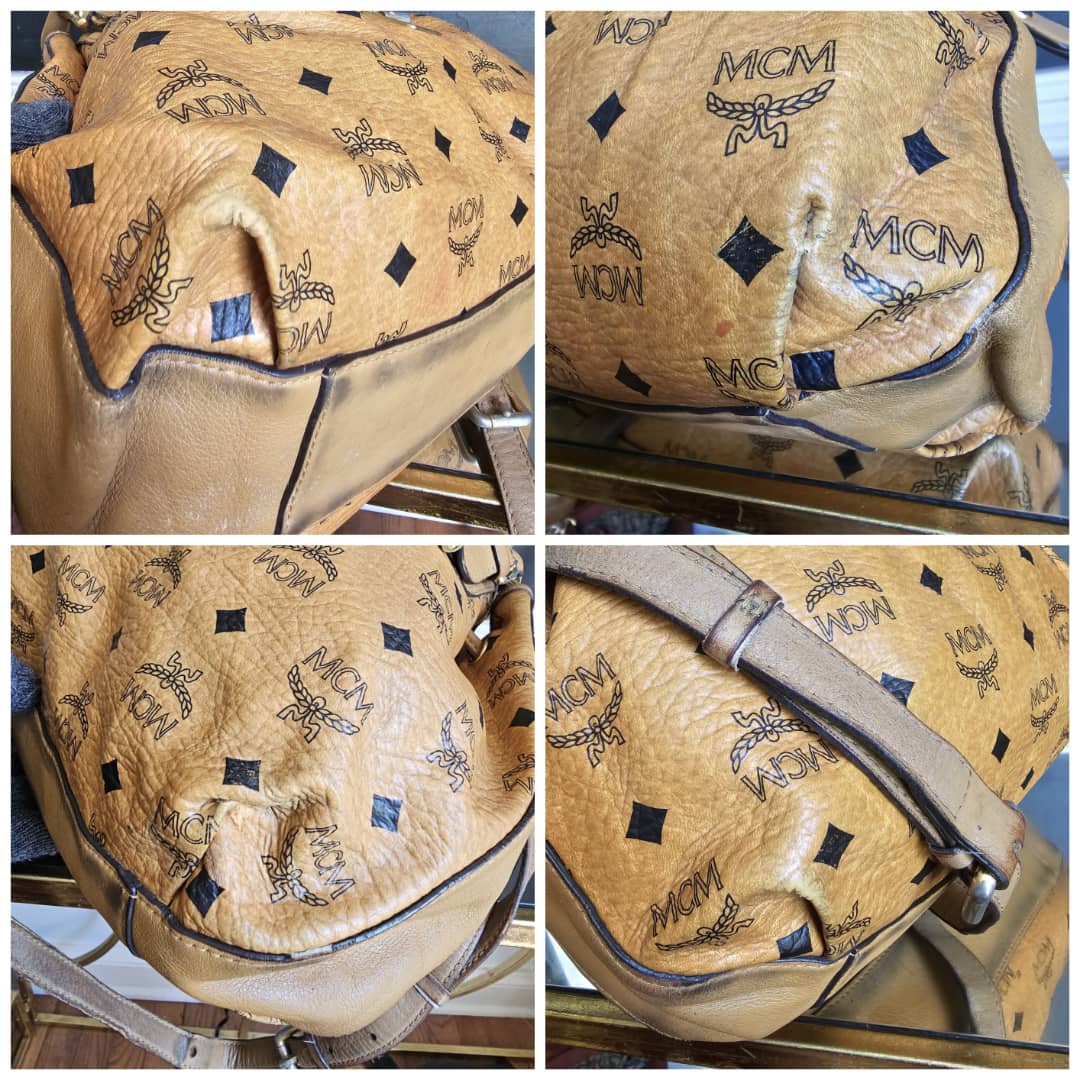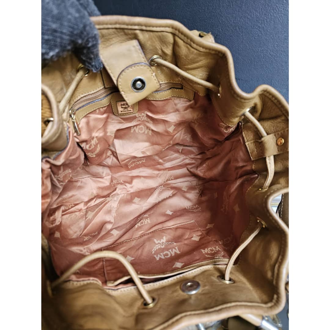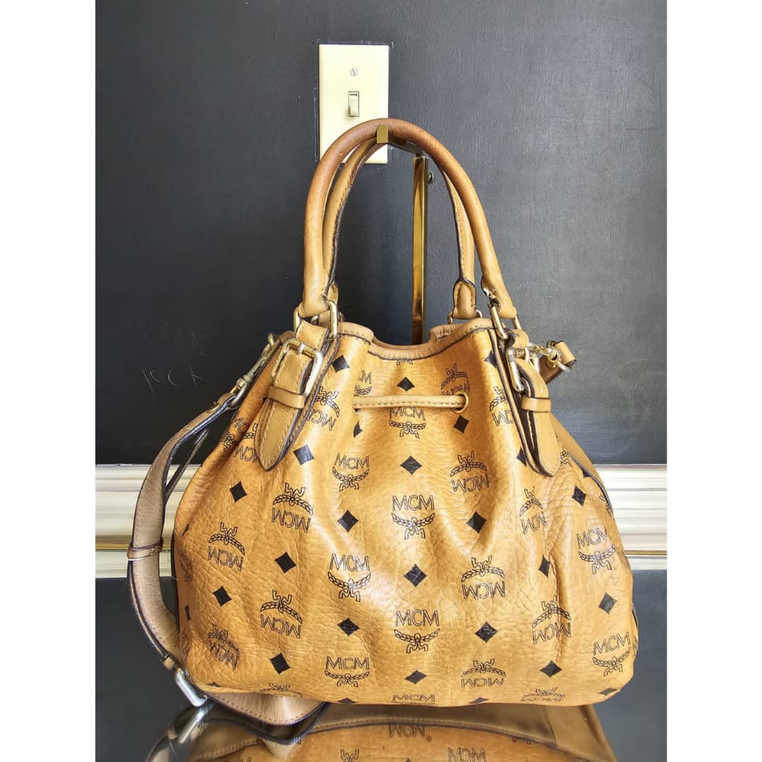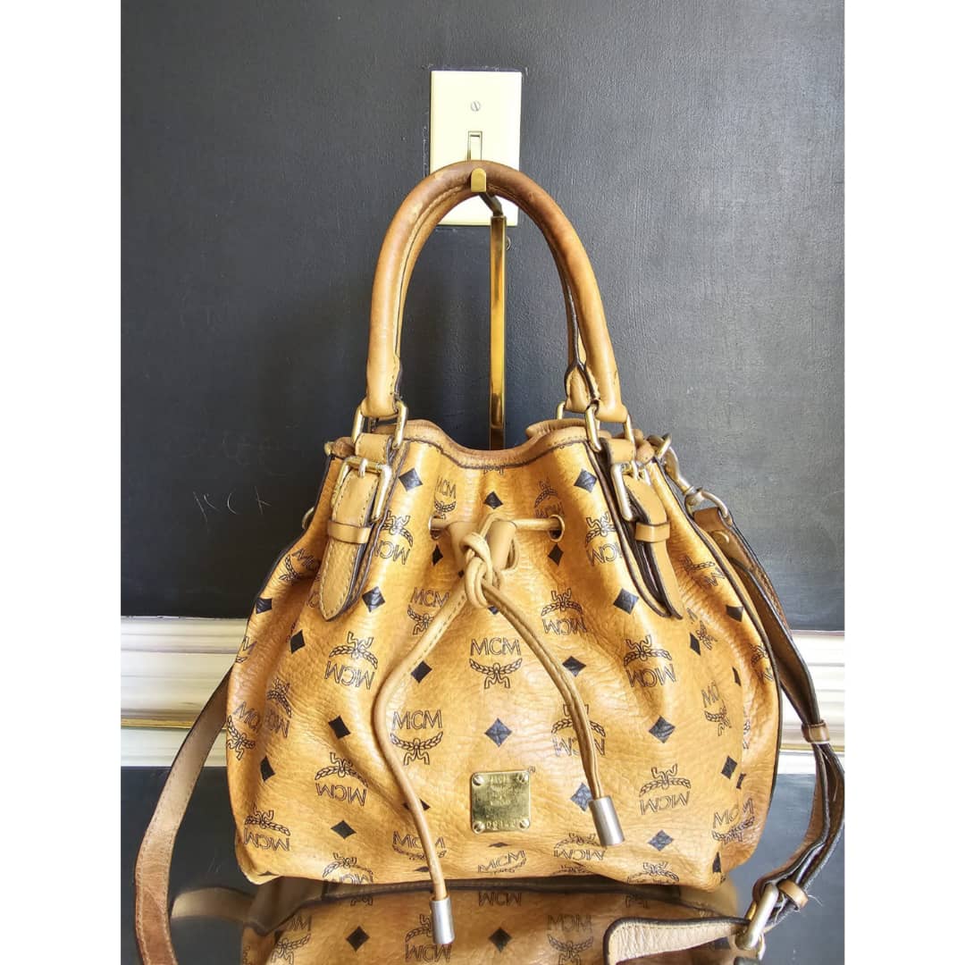 This authentic MCM Small Visetos Drawstring Bucket Bag Cognac is in it’s good pre-owned condition. The interior is clean. Handle and strap shows some rubbing and soiling. Gold hardware, shows some scratches.