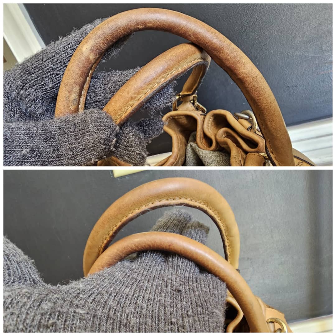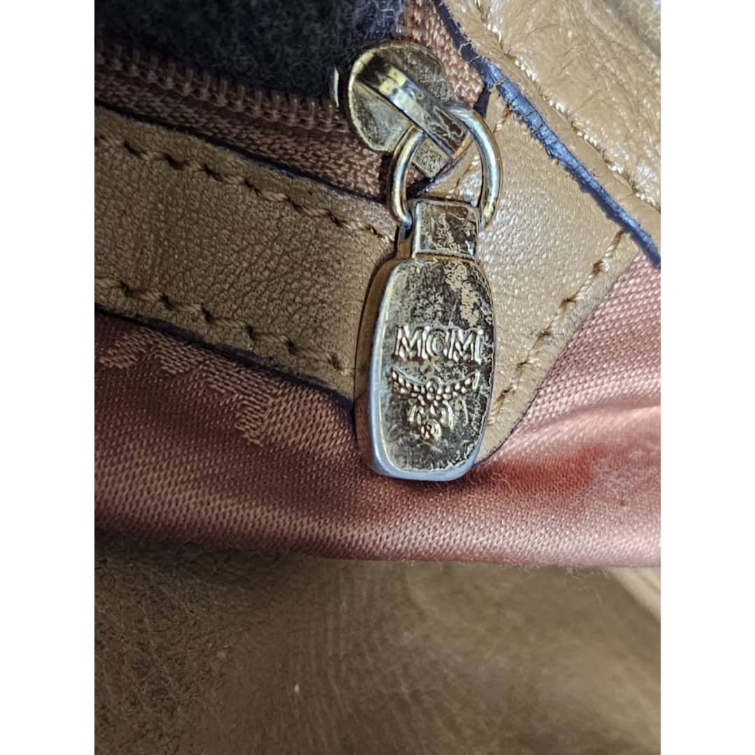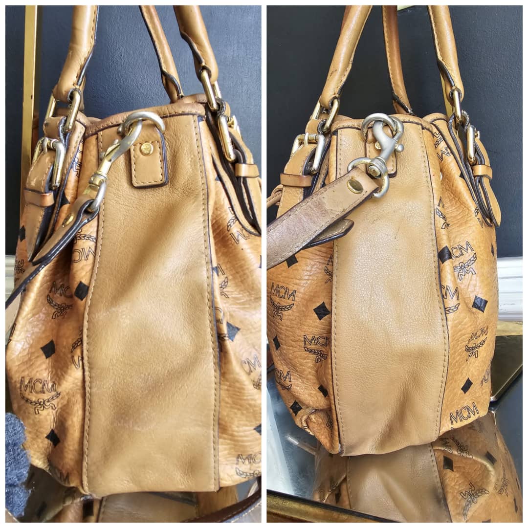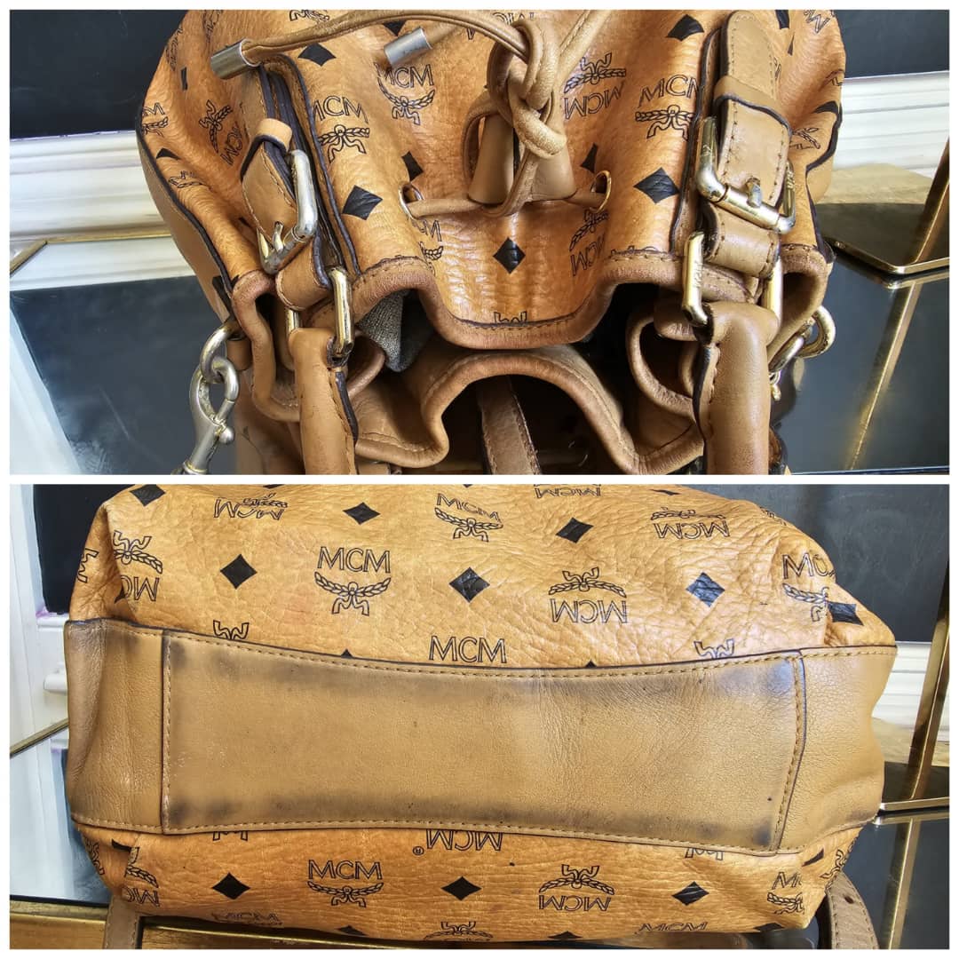 This authentic MCM Small Visetos Drawstring Bucket Bag Cognac is in it’s good pre-owned condition. The interior is clean. Handle and strap shows some rubbing and soiling. Gold hardware, shows some scratches.