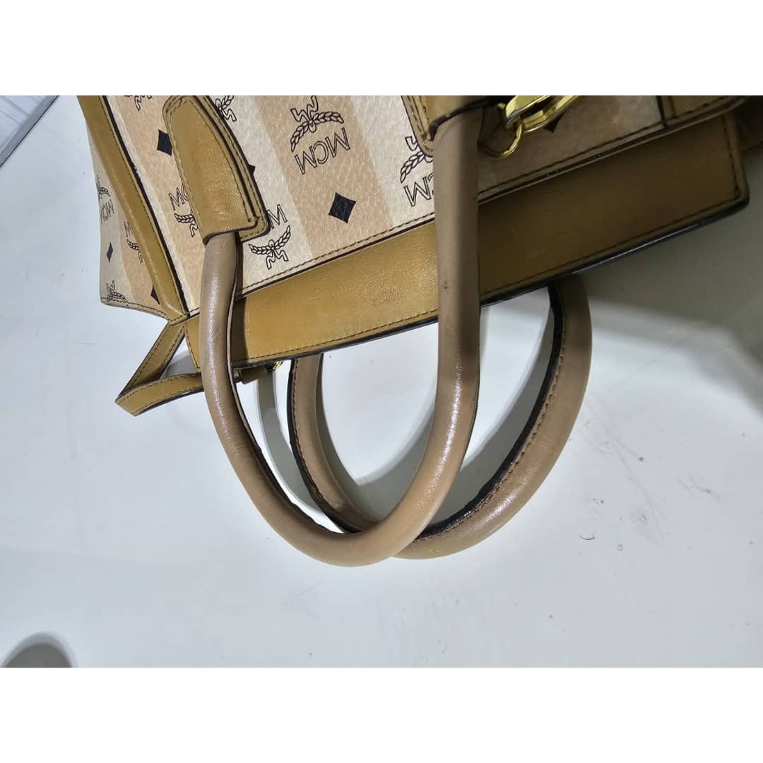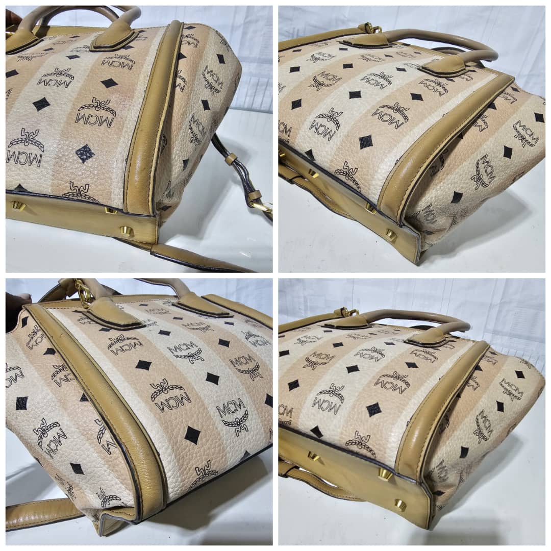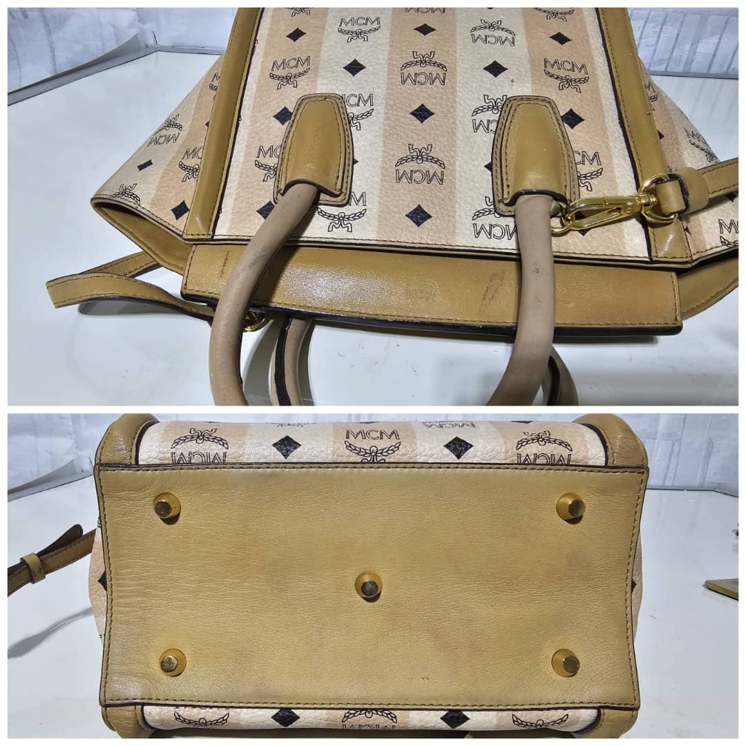 This authentic MCM Striped Visetos Small Kathy Double Zip Tote Beige is in it’s good pre-owned condition. The exterior canvas and leather is clean and beautiful. The interior is clean. The handle and top flap has little scratches (Kindly review pictures above).
