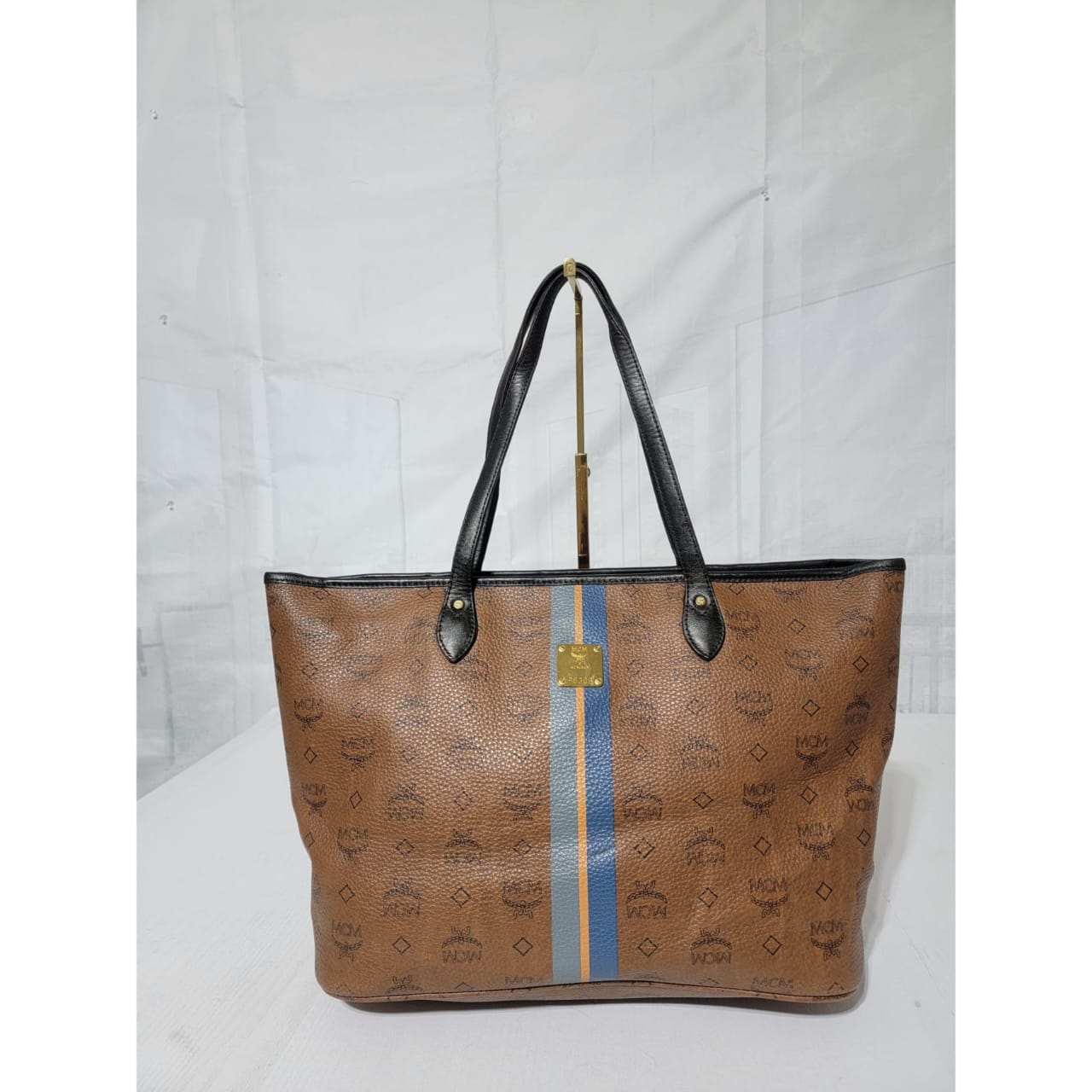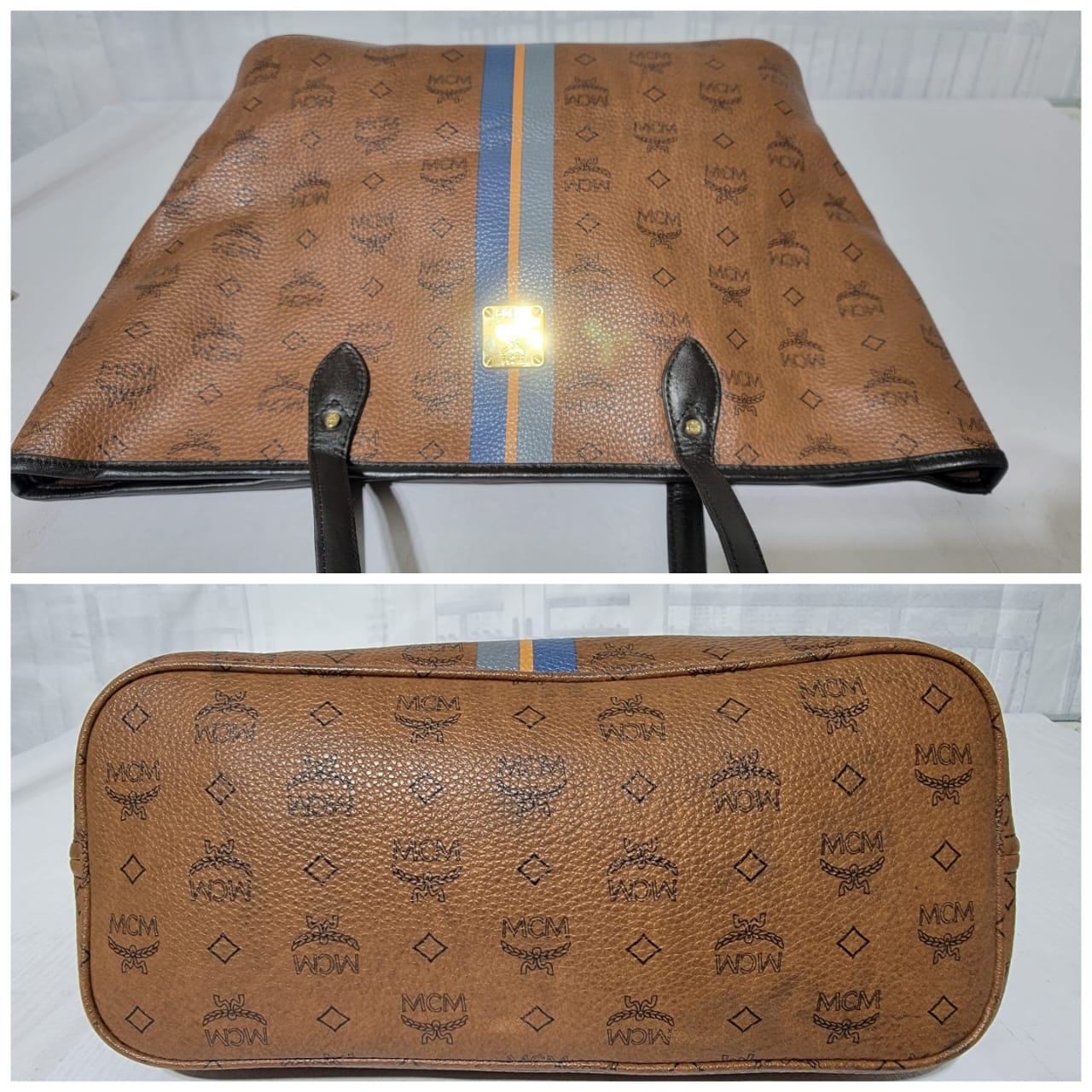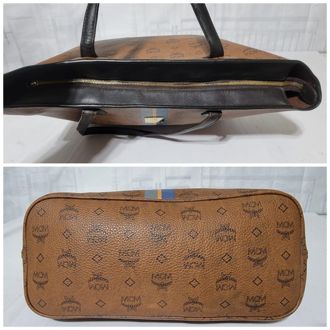 This authentic MCM Top Zip Stripped Shopper Tote Bag Brown is in it’s good pre-owned condition. The exterior is clean and beautiful. Interior is clean. Gold hardware. It has a deep brown color trim and handle.