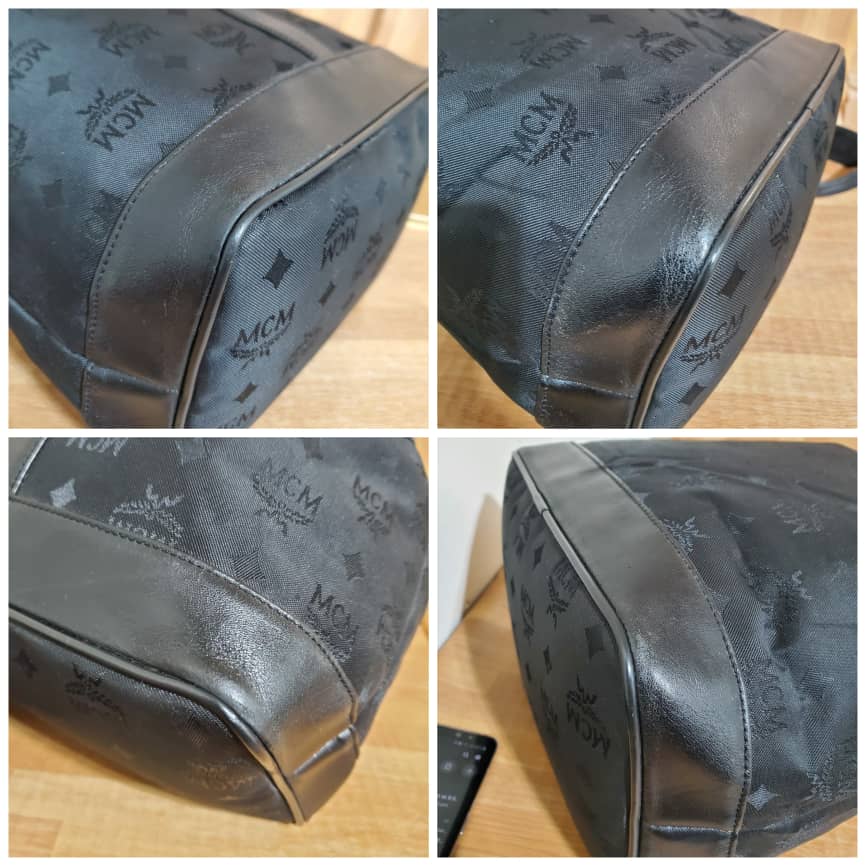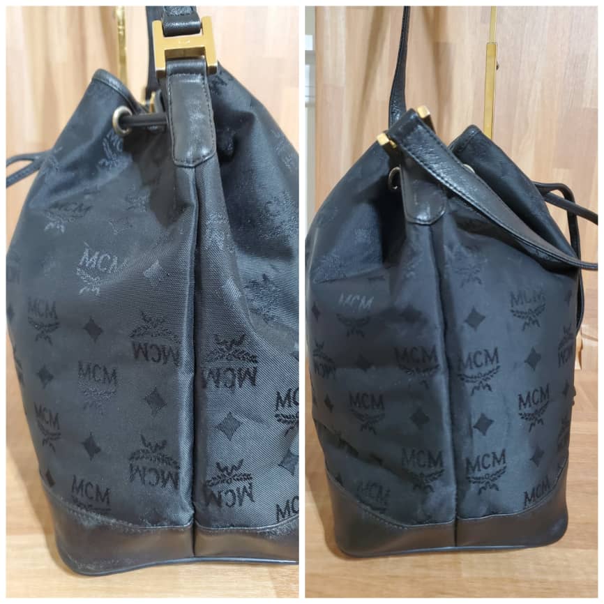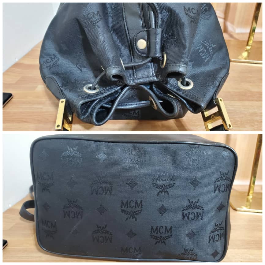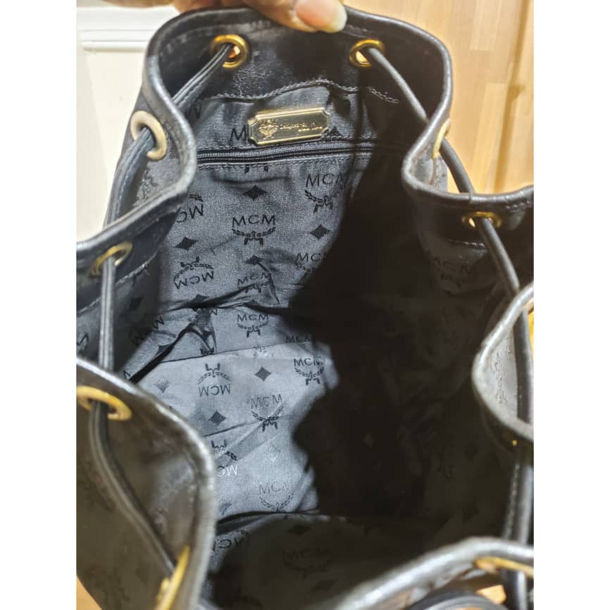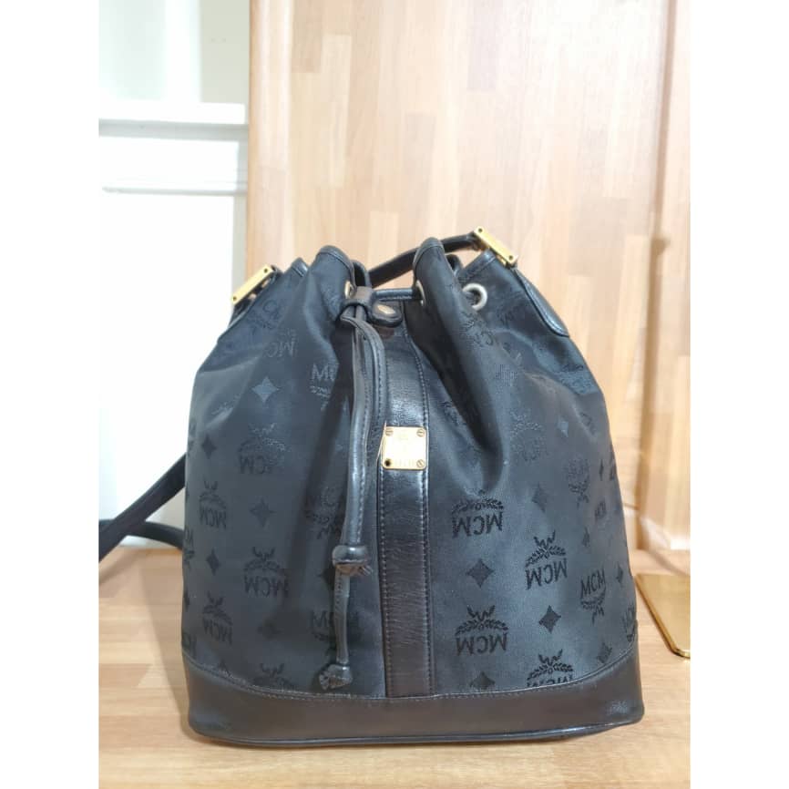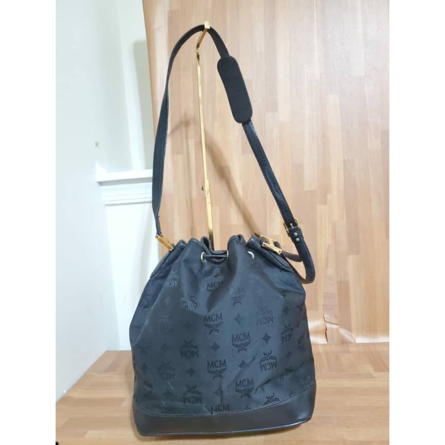 This authentic MCM Vintage Visetos Nylon black Drawstring Bucket Crossbody /Shoulder Bag is in it preowned good condition. The exterior nylon and leather is clean and beautiful. Interior is clean. Overall great condition.