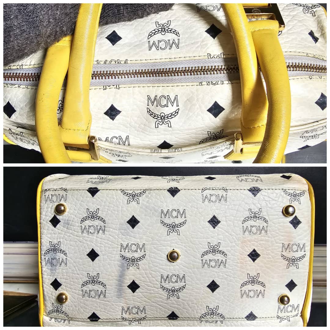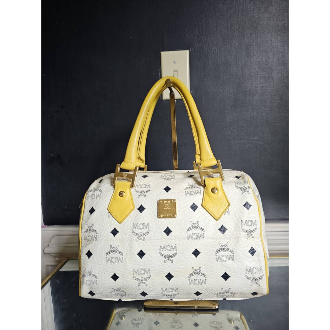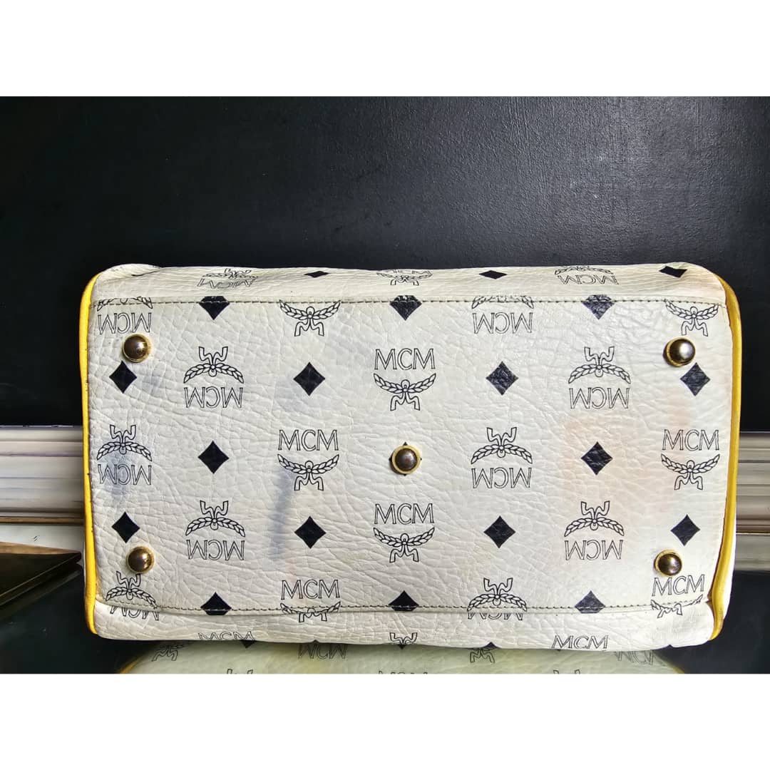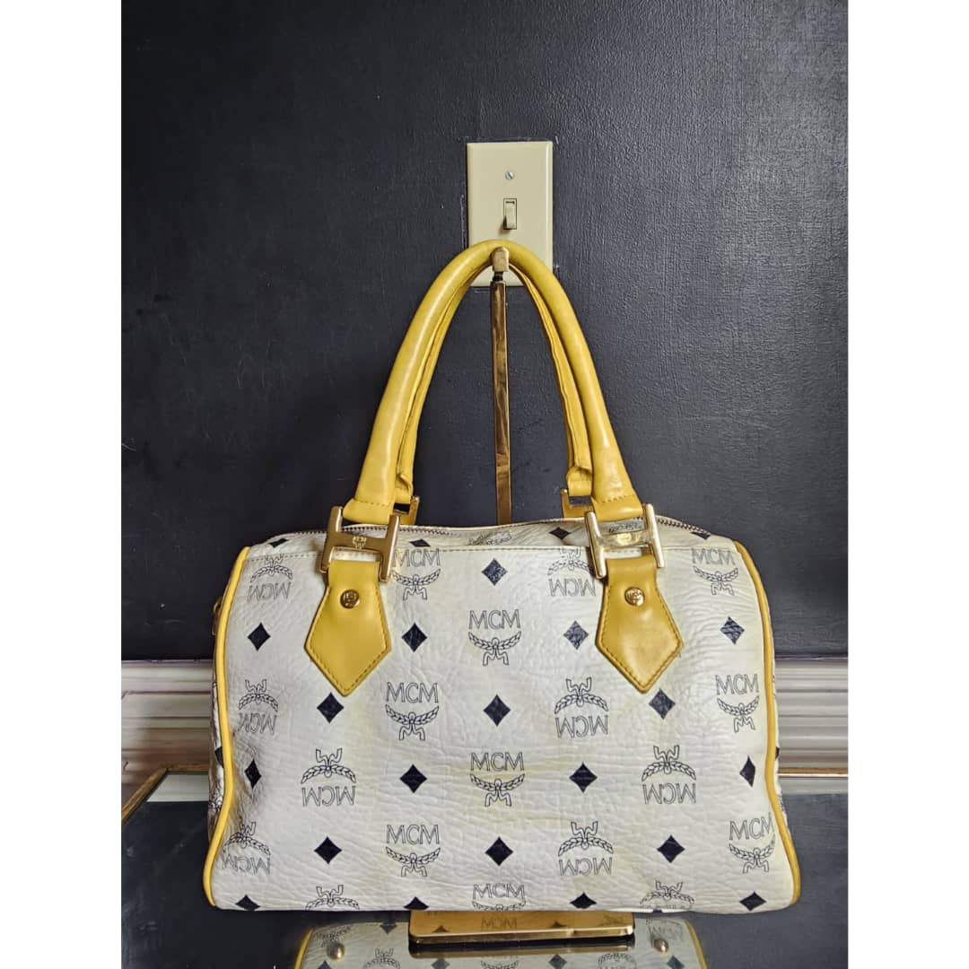 This authentic MCM Visetos Boston Bag White Yellow is in it’s good pre-owned condition. The exterior is clean and beautiful, shows little yellow color transfer on some sides of the bag because of the yellow handle. Little scratches on the leather trim by the corners (Kindly review pictures above). Interior is clean but shows sign of use and stains. Gold hardware. No long strap.