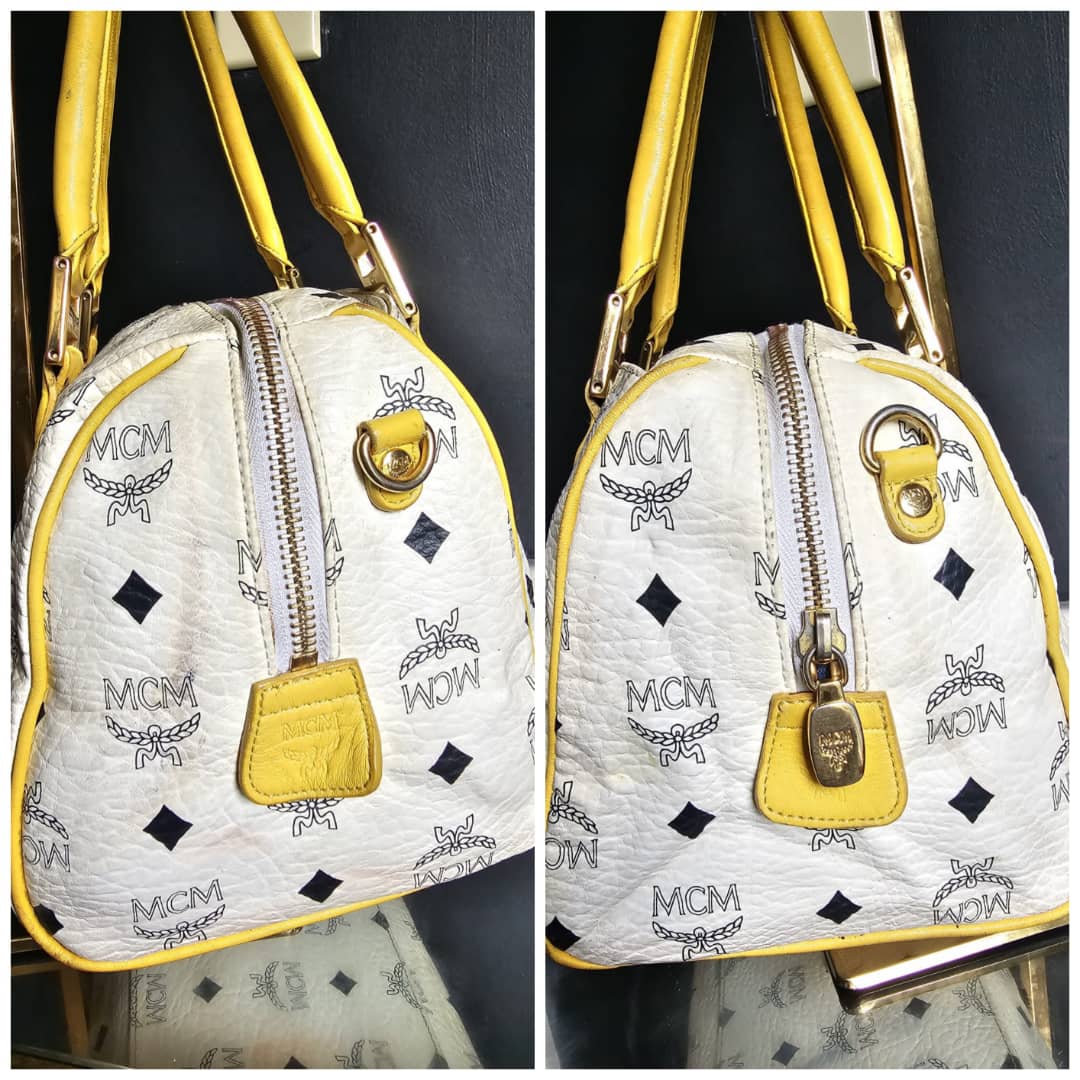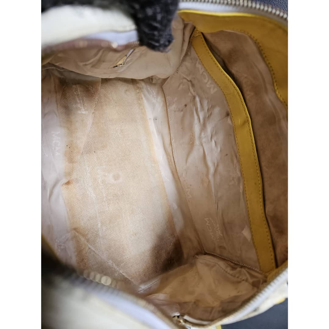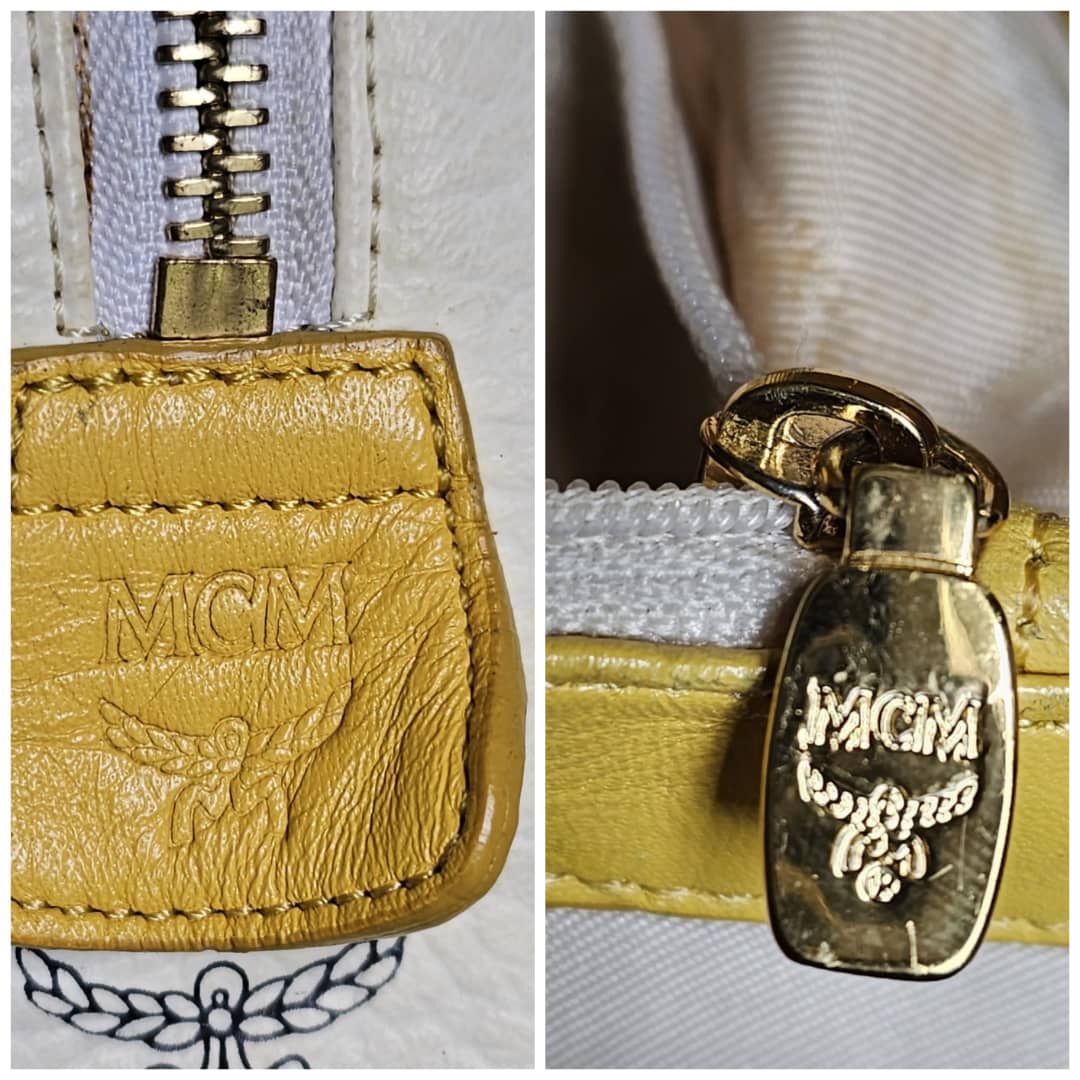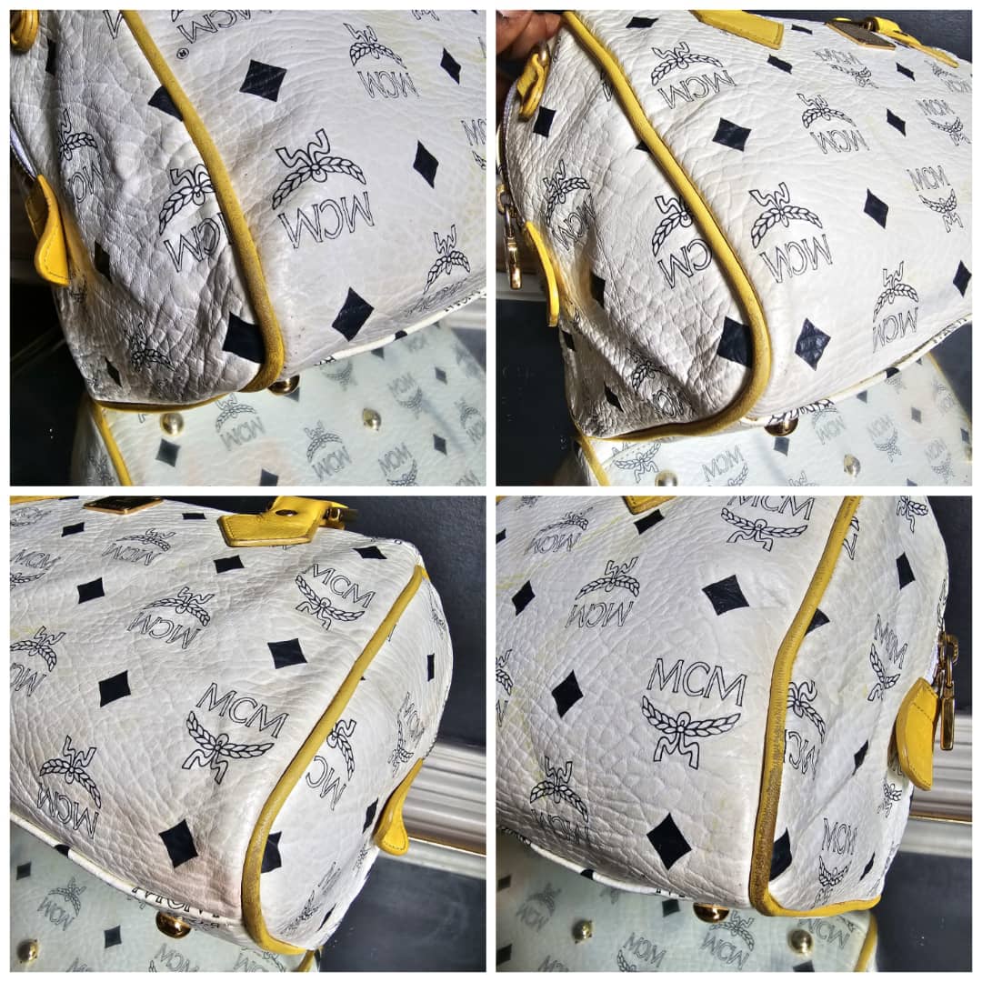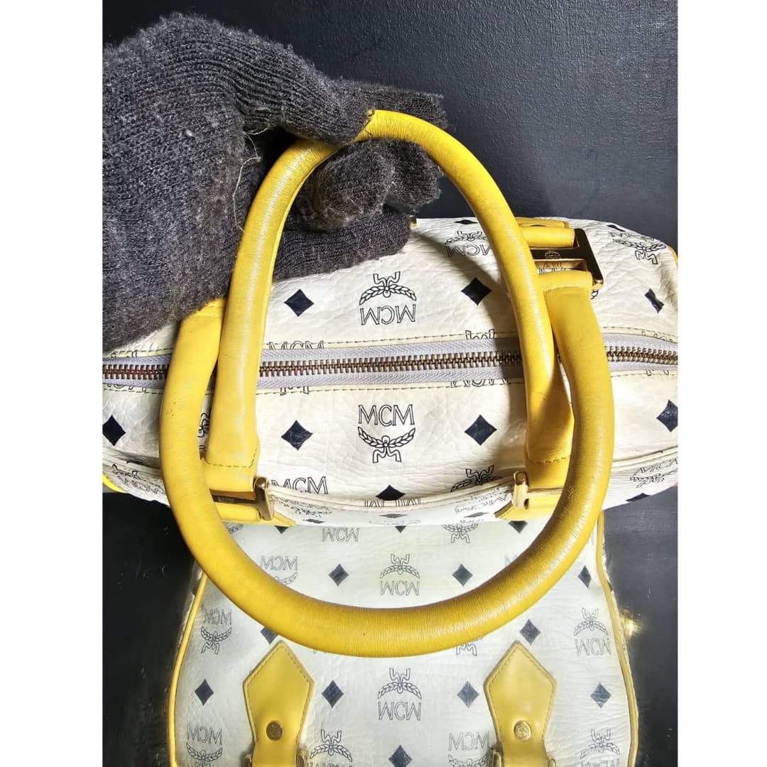 This authentic MCM Visetos Boston Bag White Yellow is in it’s good pre-owned condition. The exterior is clean and beautiful, shows little yellow color transfer on some sides of the bag because of the yellow handle. Little scratches on the leather trim by the corners (Kindly review pictures above). Interior is clean but shows sign of use and stains. Gold hardware. No long strap.