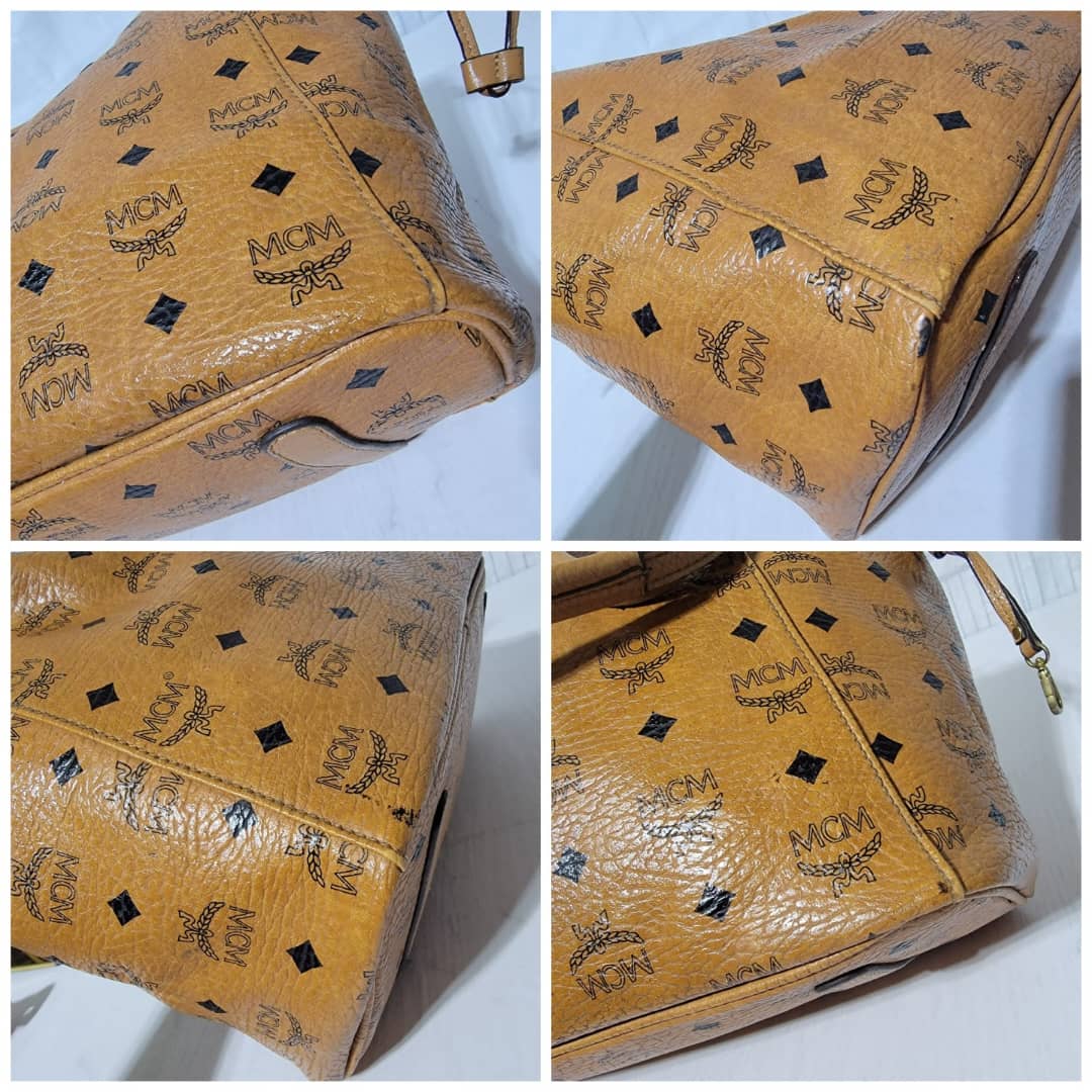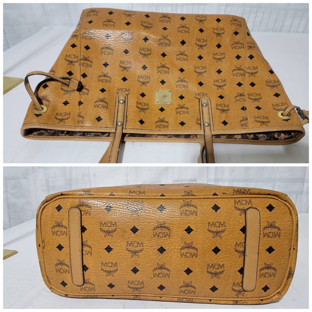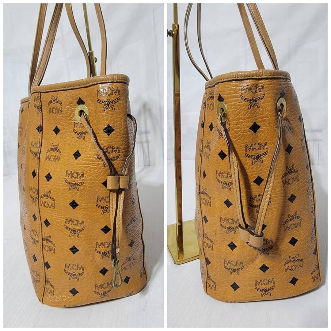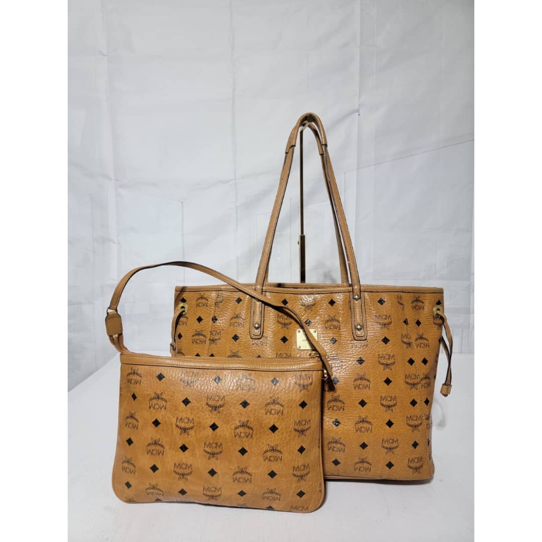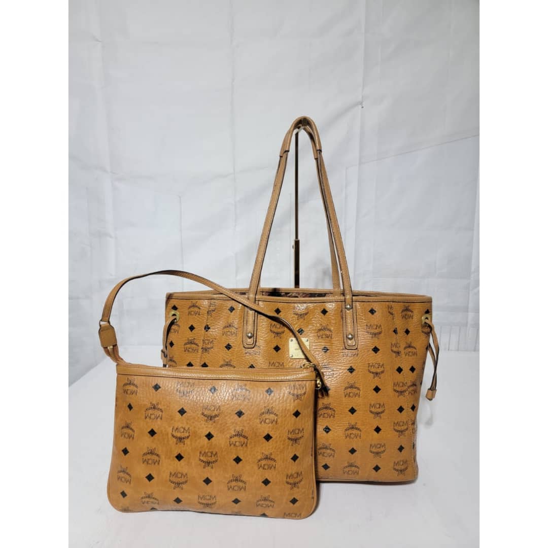 This authentic MCM Visetos Coated Canvas Project Reversible Shopper Tote and Pochette Cognac is in it’s good pre-owned condition. The exterior is clean and beautiful. Interior is clean. It can be worn separately like a tote and also like a shoulder Pochette. Gold hardware shows rubbing.